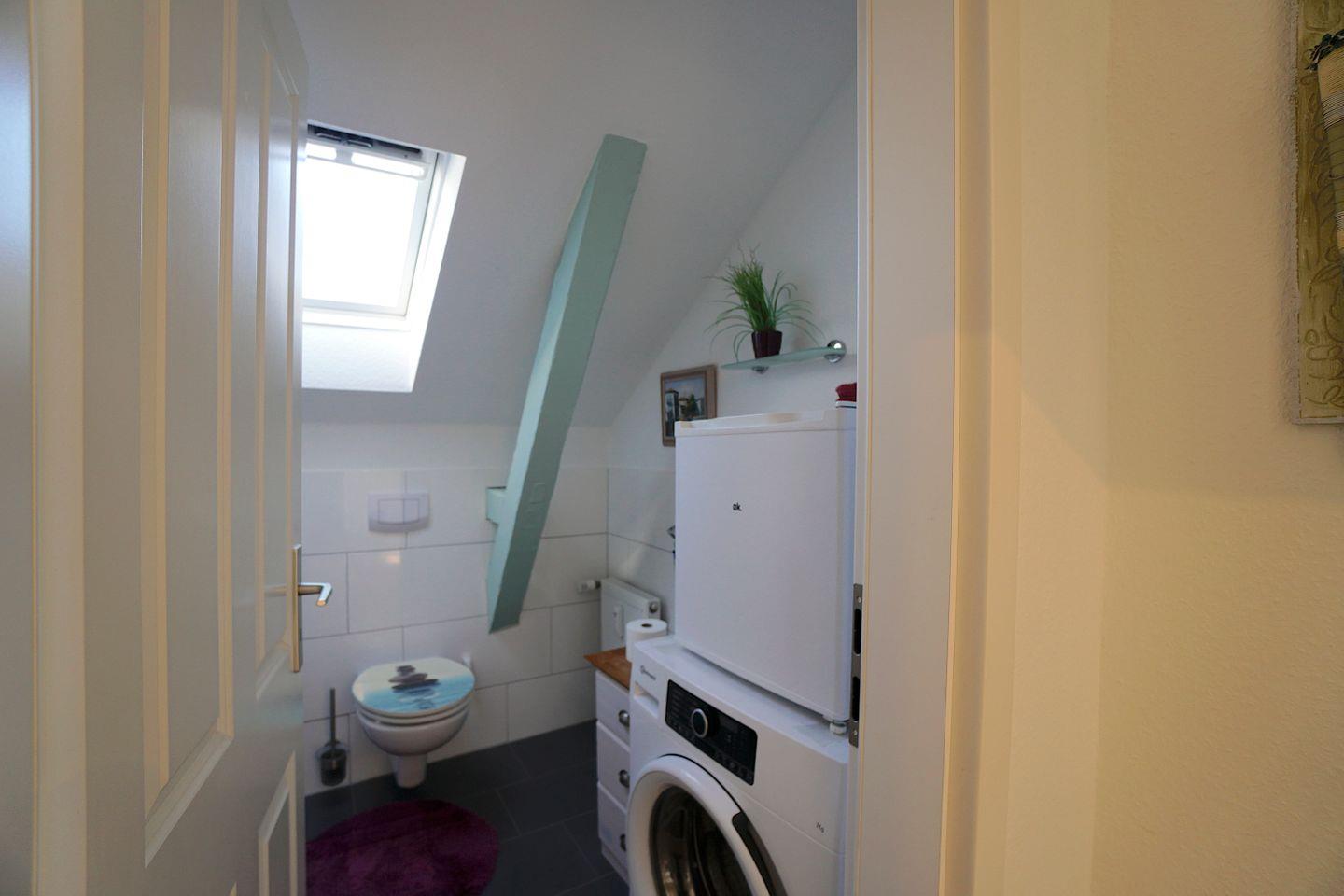 Des weiteren befindet sich ein kleines Gäste WC auf dem Flur in dem auch die Waschmaschine untergebracht ist.
