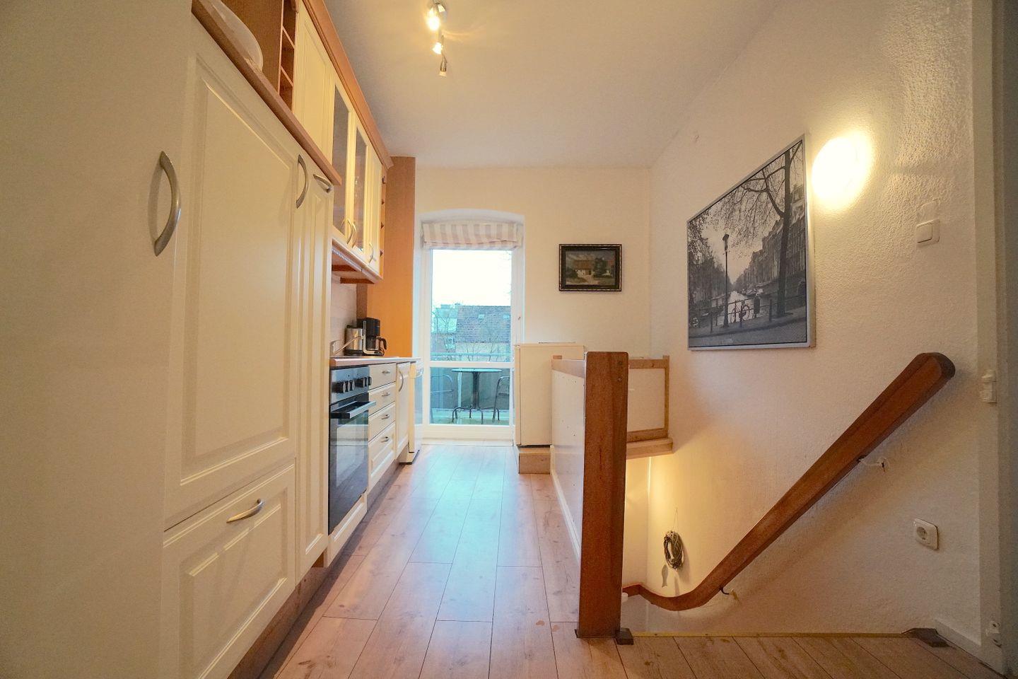 Die Wohnung liegt im ersten Obergeschoss und verfügt über einen eigenen Zugang rückseitig des Gebäudes. Direkt vor dem Haus befindet sich ein Stellplatz. Eine Küche und der daran anschließende Sonnenbalkon, der einen Blick auf die alte Fischräucherei bietet, befinden sich direkt oberhalb der Treppe.