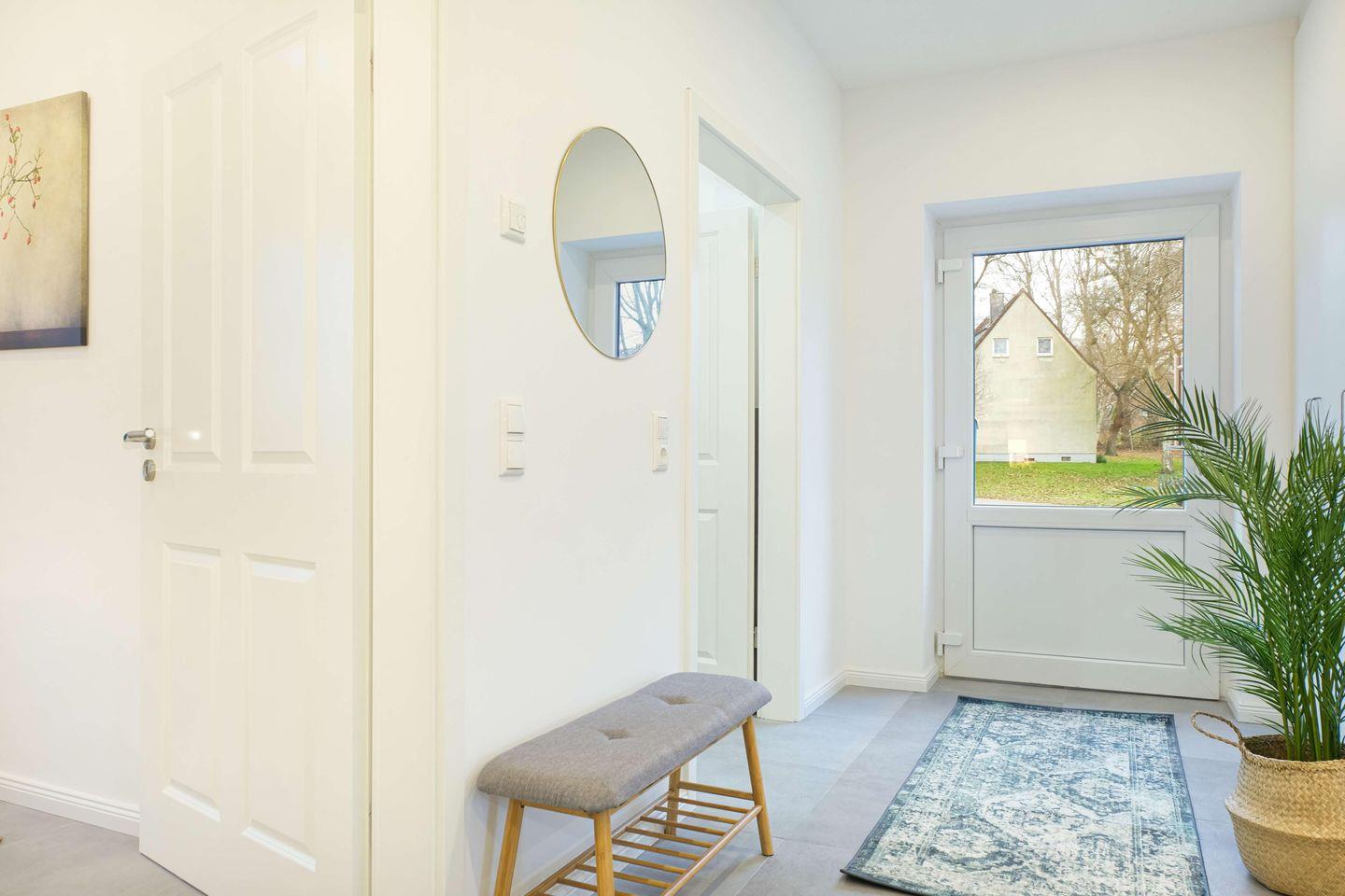 Die Wohnung befindet sich im Erdgeschoss. Die Türen im Eingangsbereich sowie in der Wohnung wurden in einem breiterem Format gestaltet. Hier kannst Du zum Beispiel auch mit einem Rollstuhl in die Wohnung gelangen.