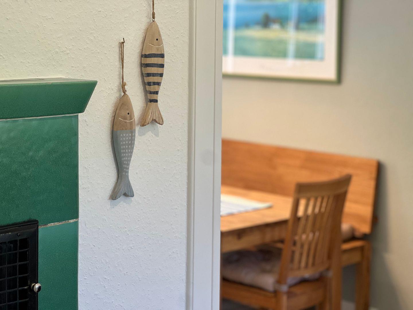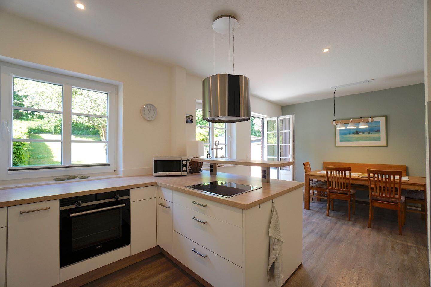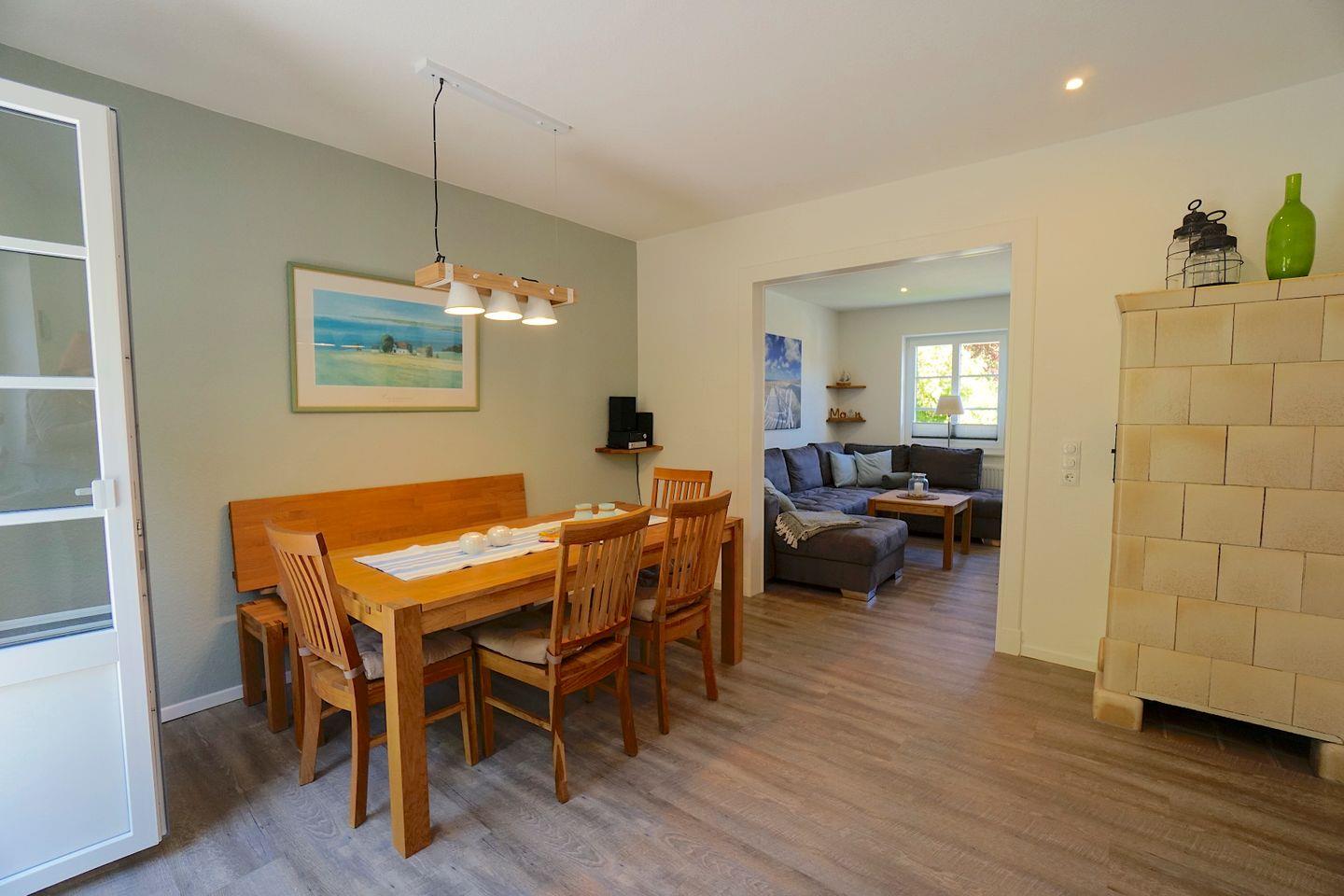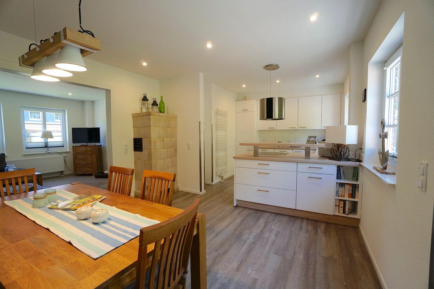 Das Ferienhaus besticht durch seine Kombination aus traditionellem Charme und modernem Komfort. Im Jahr 2019 renoviert, bietet es alles, was ihr für einen entspannten Aufenthalt benötigt. Die offene Küche, die direkt zum Wohnzimmer führt, ist mit sämtlichen Annehmlichkeiten ausgestattet, darunter ein Herd, eine Spülmaschine, ein Kühlschrank und ein Elektrogrill. Perfekt für gesellige Kochabende oder ein gemütliches Frühstück im Essbereich. Der Wohnzimmerbereich lädt mit einer Sofaecke und einem Fernseher zum Relaxen ein, während eine Auswahl an Büchern und Spielen die Freizeitgestaltung für Groß und Klein bereichert.