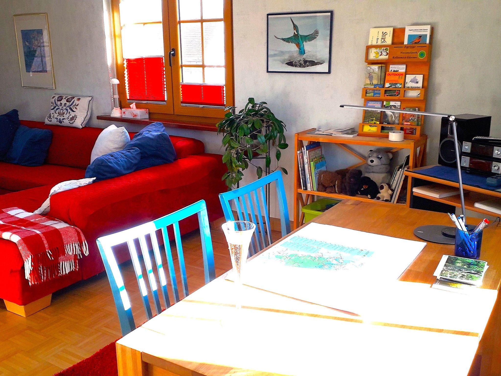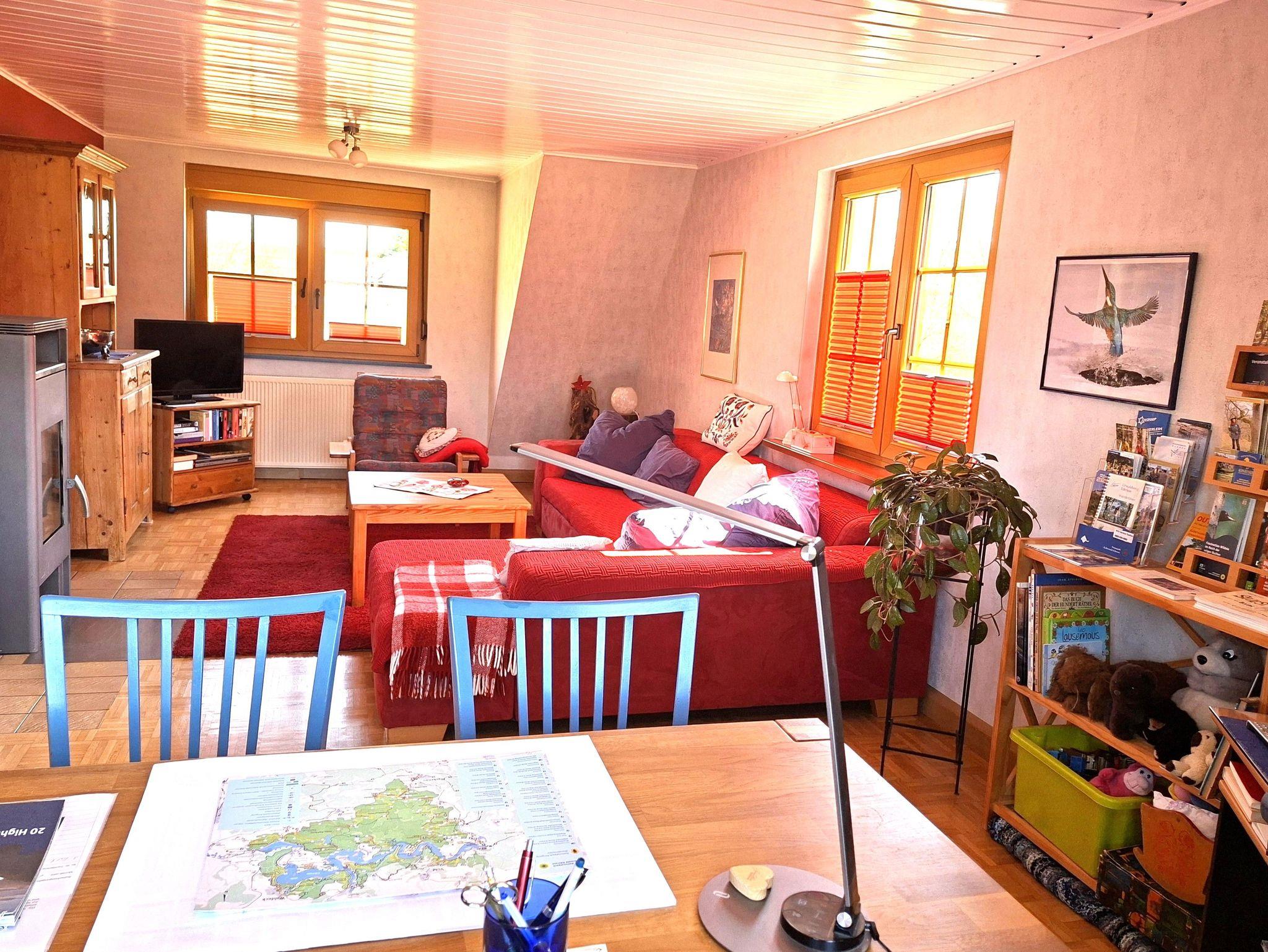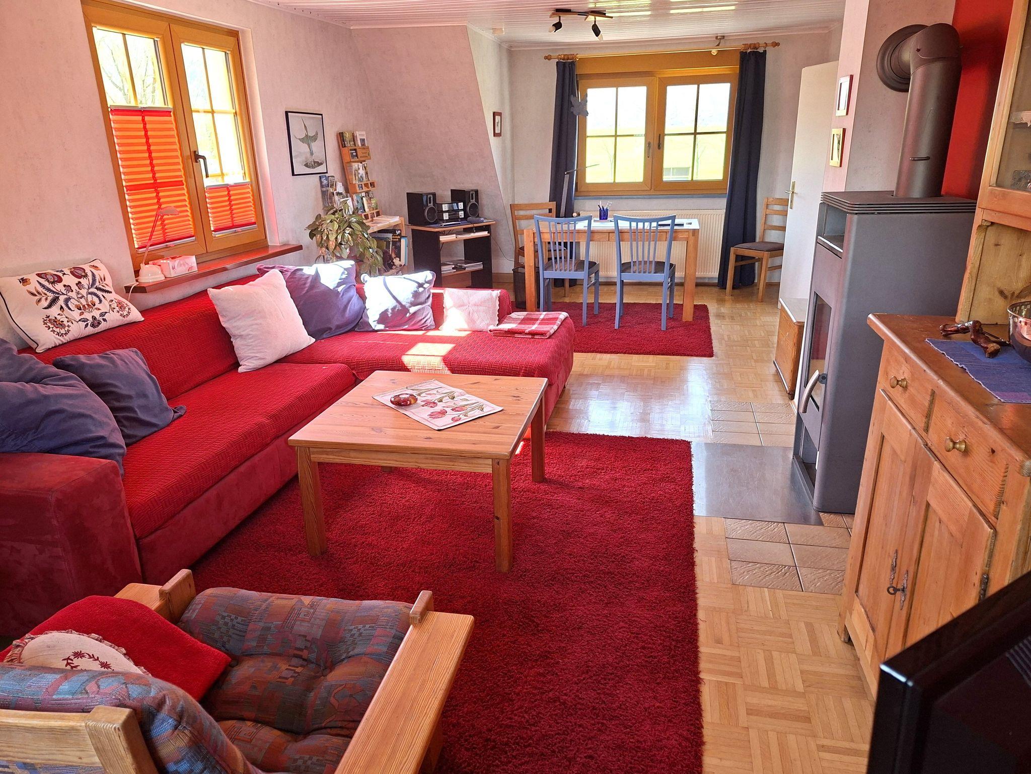 Gemütliche, gut ausgestattete Ferienwohnung für 1 bis maximal 5 Personen. Großer Wohnraum mit Kaminofen, Kuschelsofa-Ecke, Schreibtisch oder Spiele-Tisch. Küche sehr gut ausgestattet, ein Dusch-Bad mit WC und ein Doppel-Schlafzimmer.