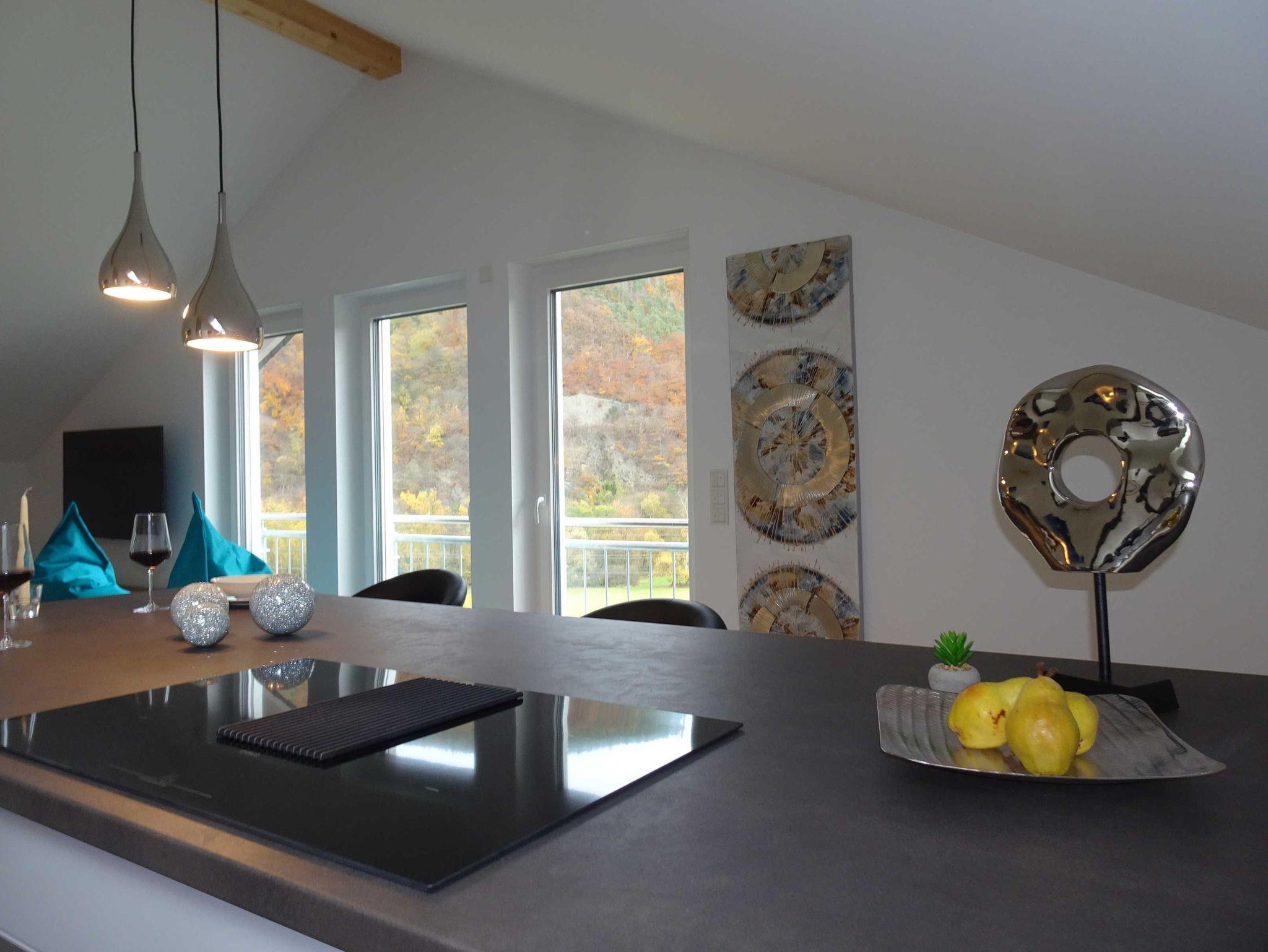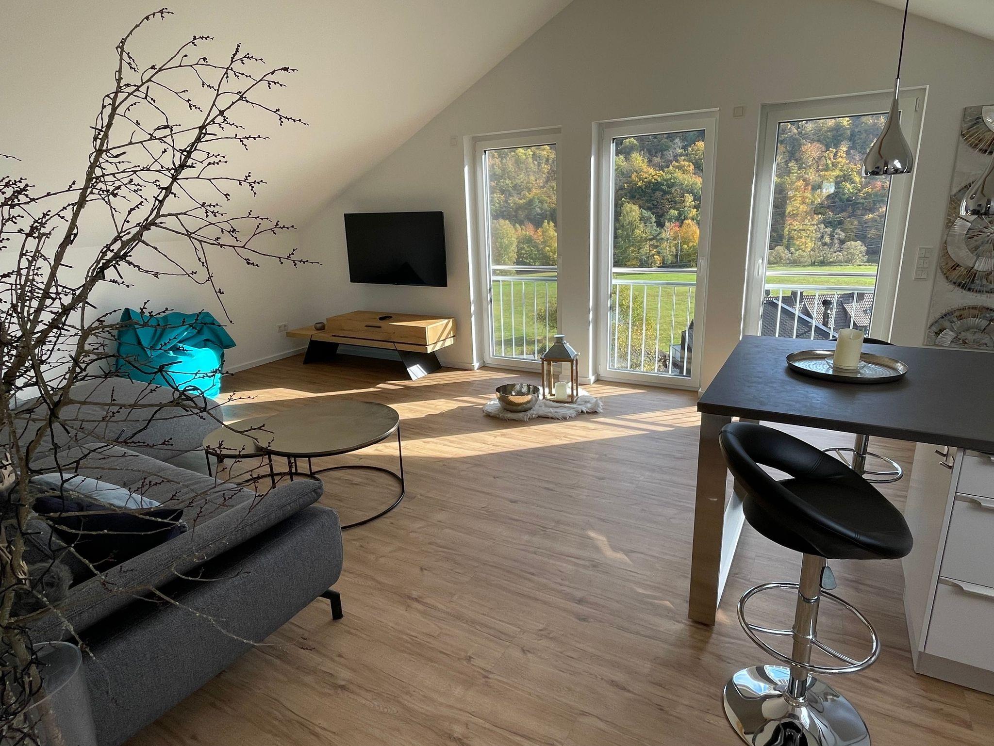 Die offene und liebevolle Gestaltung des Wohn-Essbereichs mit dem großen Sofa zum Träumen und Relaxen wird euch begeistern. Ganz entspannt vom gemütlichen Sofa hast du durch die 3 bodentiefen Fenster einen eindrucksvollen Blick auf die Eder und die umliegende Waldlandschaft oder du schaust einen schönen Film auf dem 55 Zoll Smart TV.