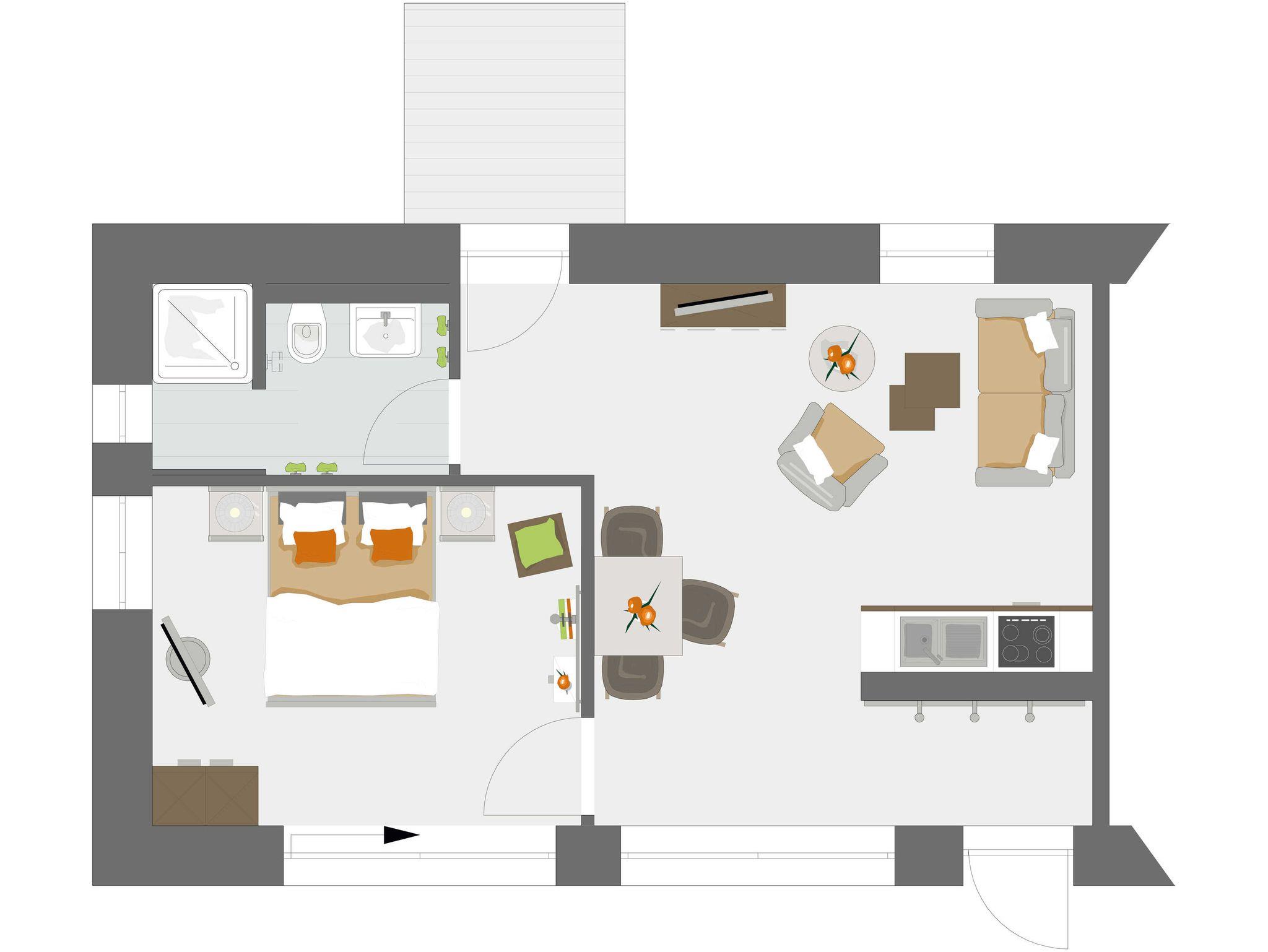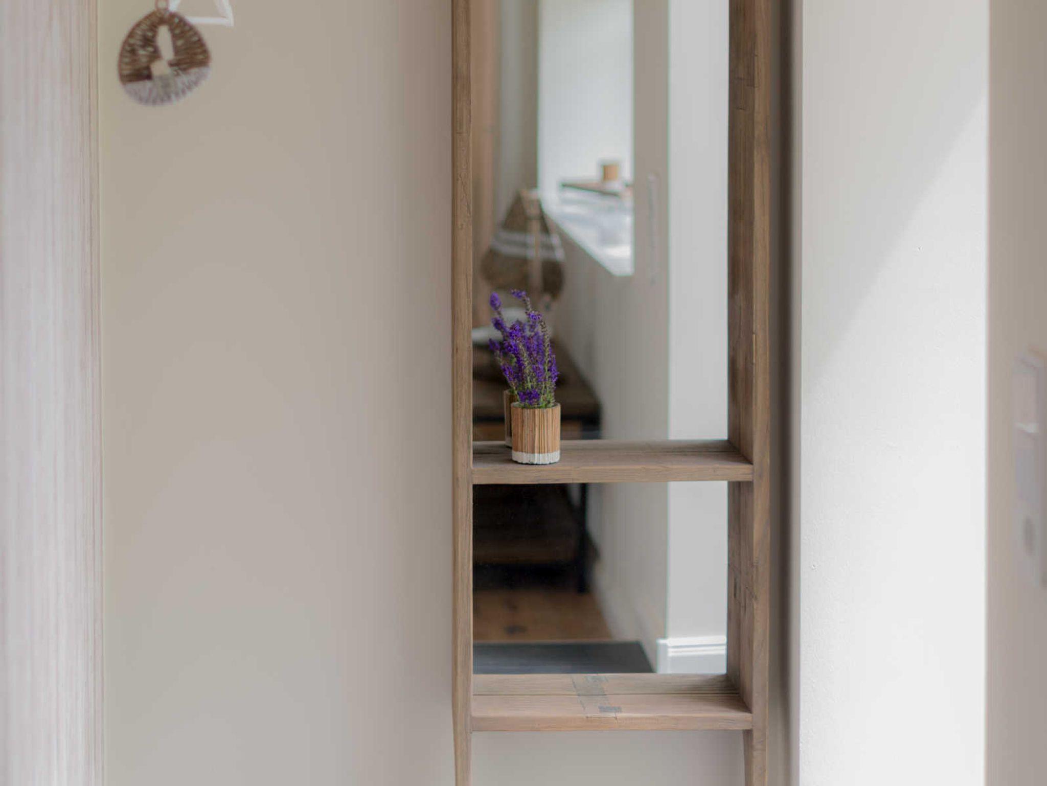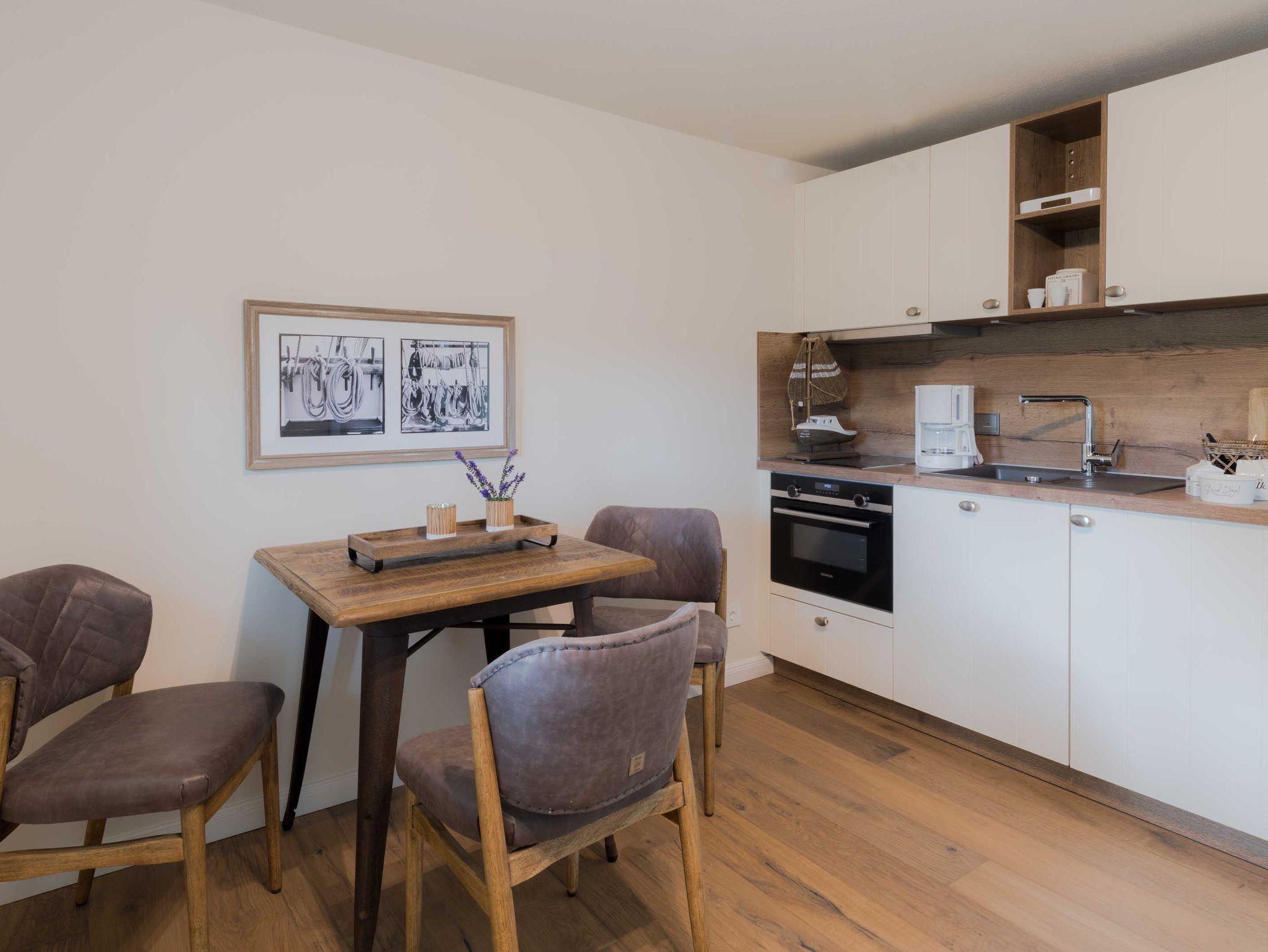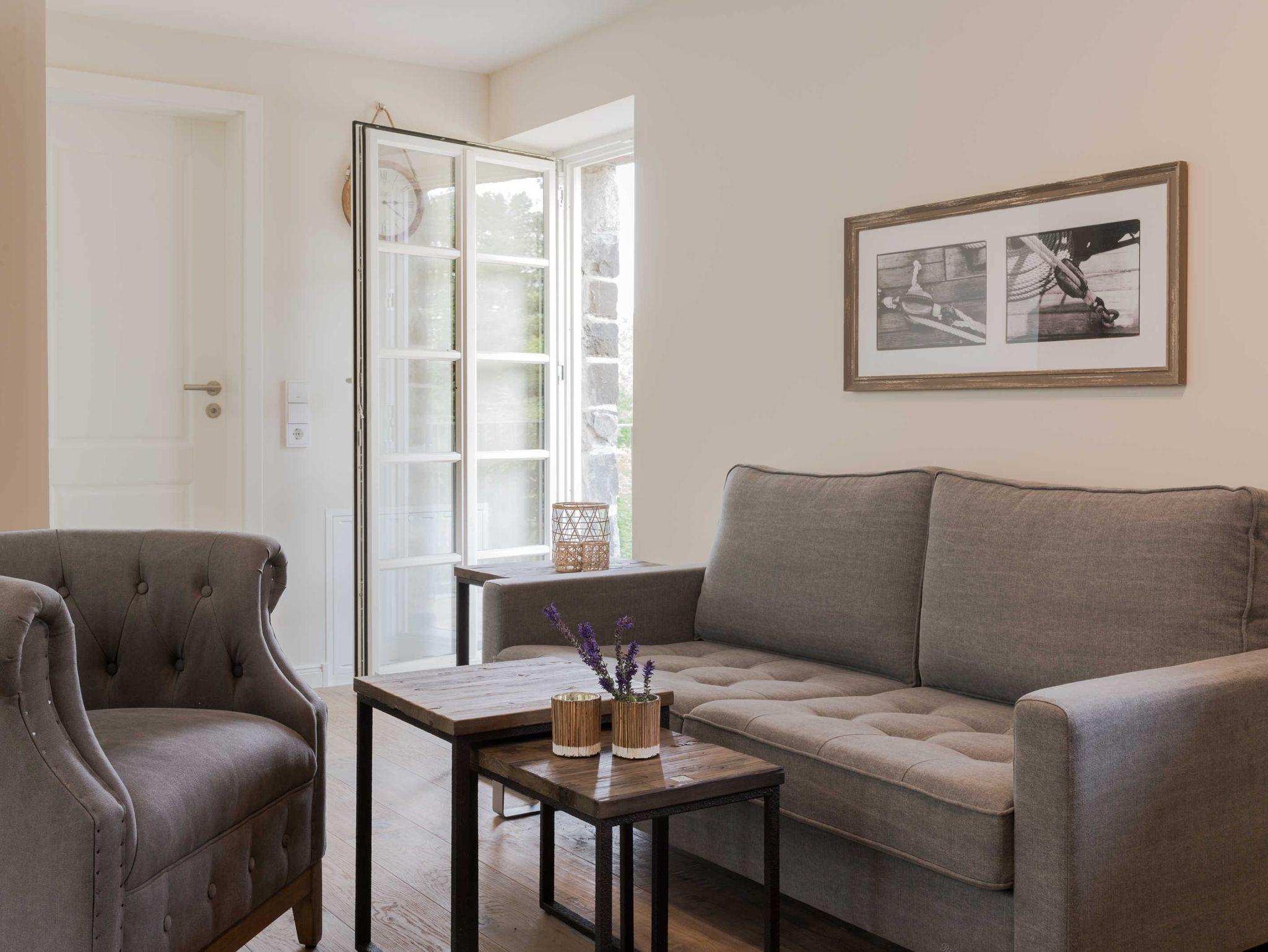 Die 50 qm große Zweiraum-Ferienwohnung befindet sich im Nebengebäude, das früher als Funktionsgebäude diente. Der Wohn-/Essbereich ist offen gestaltet, so kann man in einem Raum auf den bequemen Sesseln relaxen und alle Mahlzeiten in der sehr gut ausgestatteten Küche zaubern, die vom Ceranfeld über Mikrowellen/Backofen-Kombination, nahezu alles was das Urlauberherz benötigt, bietet.