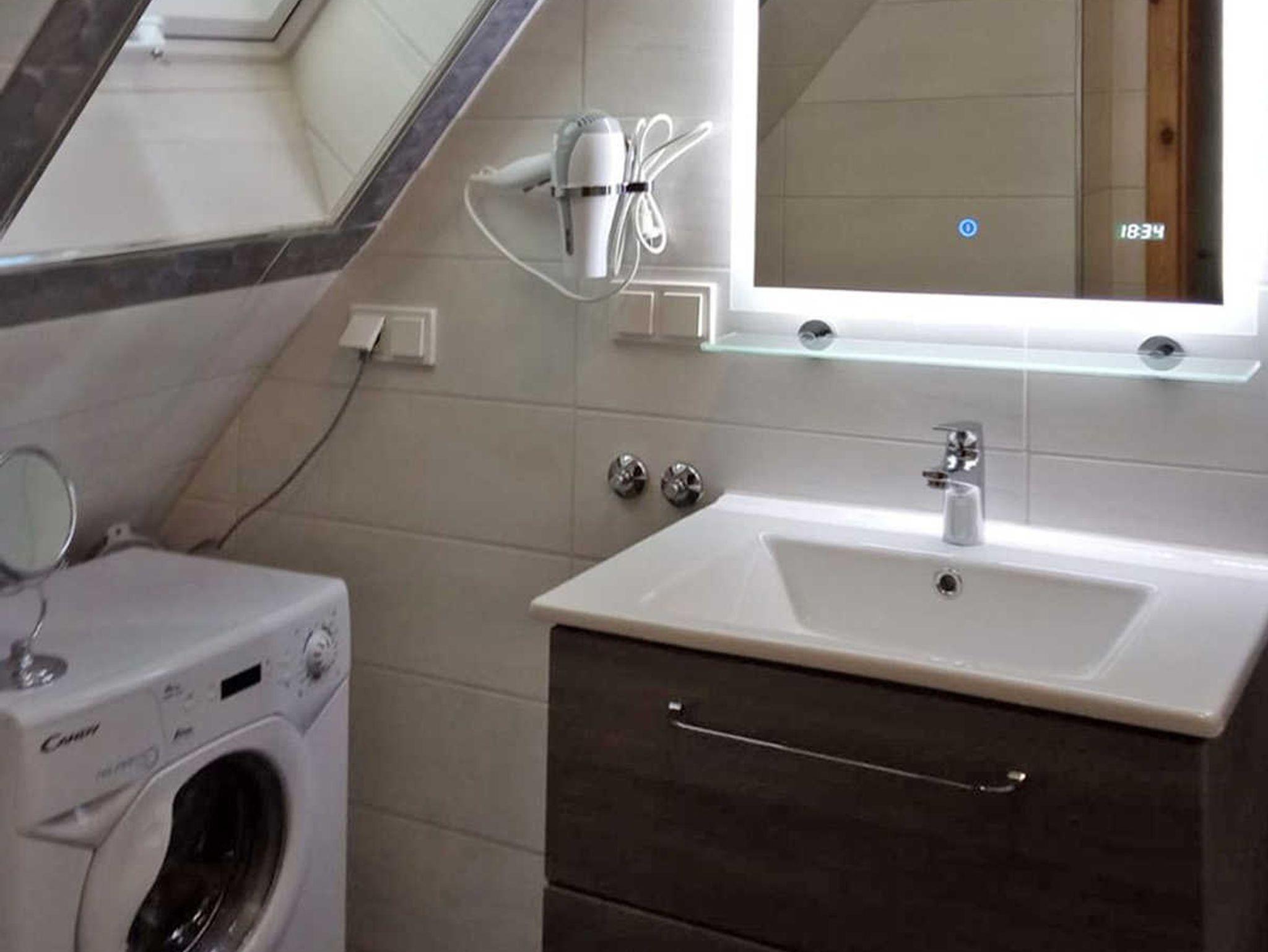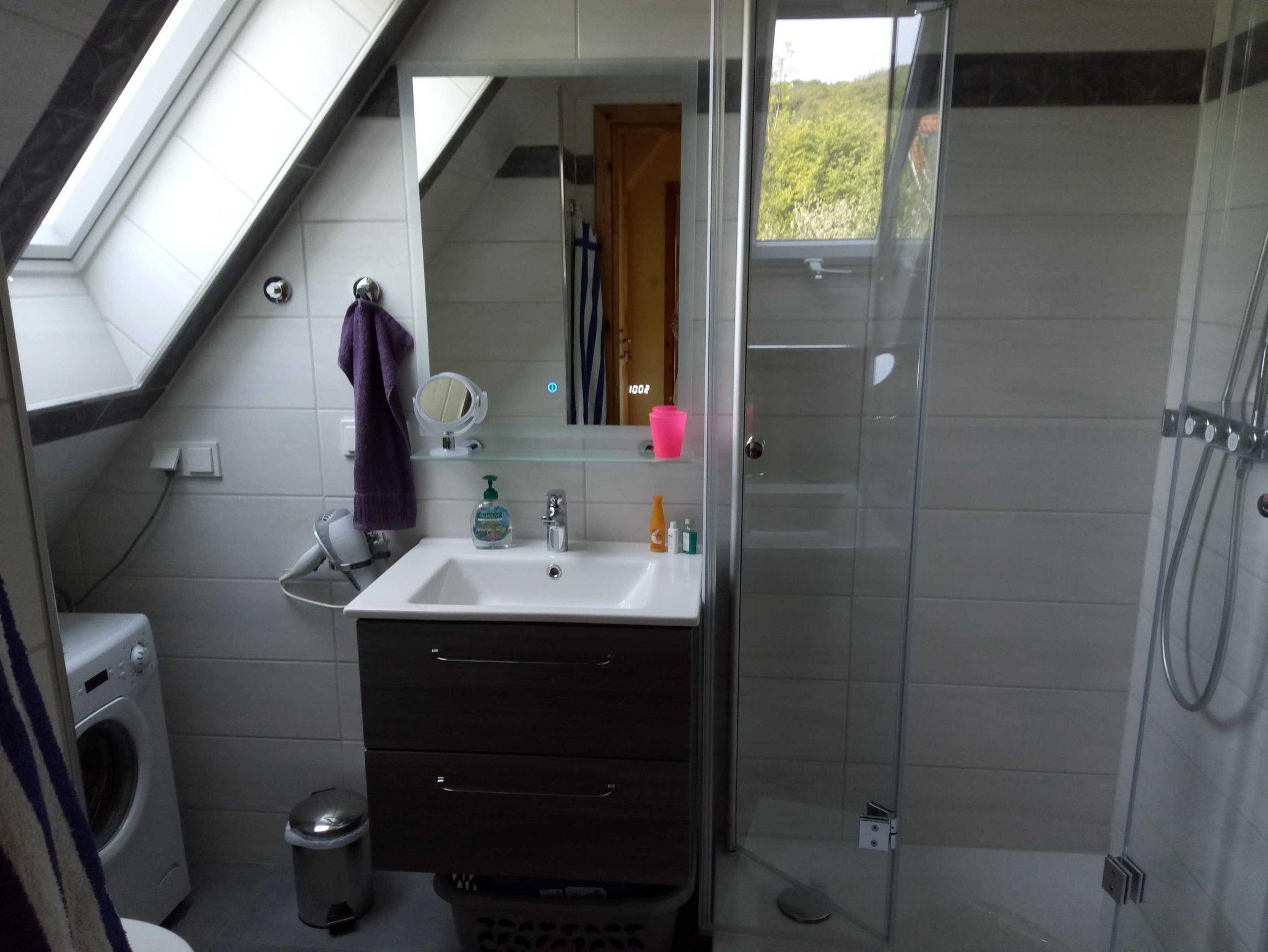 Das Bad wurde neu eingerichtet und verfügt neben Dusche und WC über einen großen beheizbaren Spiegel und eine Waschmaschine.