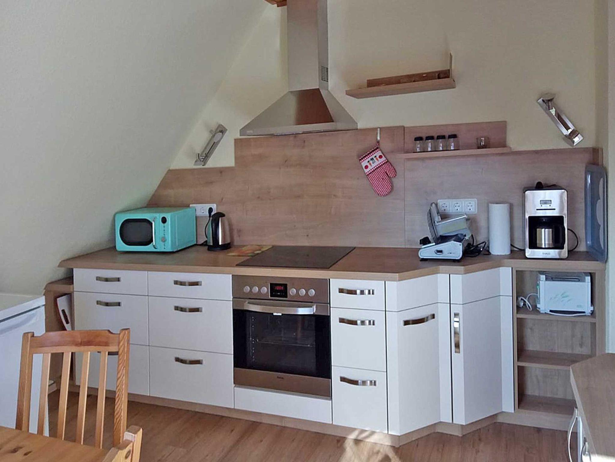 Die Küche ist voll ausgestattet, verfügt über eine Spülmaschine und zahlreiche, hilfreiche Küchengeräte, Kühlschrank mit Gefrierfach, Herd mit Cerankochfeld, Backofen, Mikrowelle Kaffeemaschine, Toaster Brotschneidemaschine, ausreichendes Geschirr und vieles mehr. In der Küche befinden sich ein Esstisch für fünf Personen und zusätzlich ein Kinder-Hochstuhl.