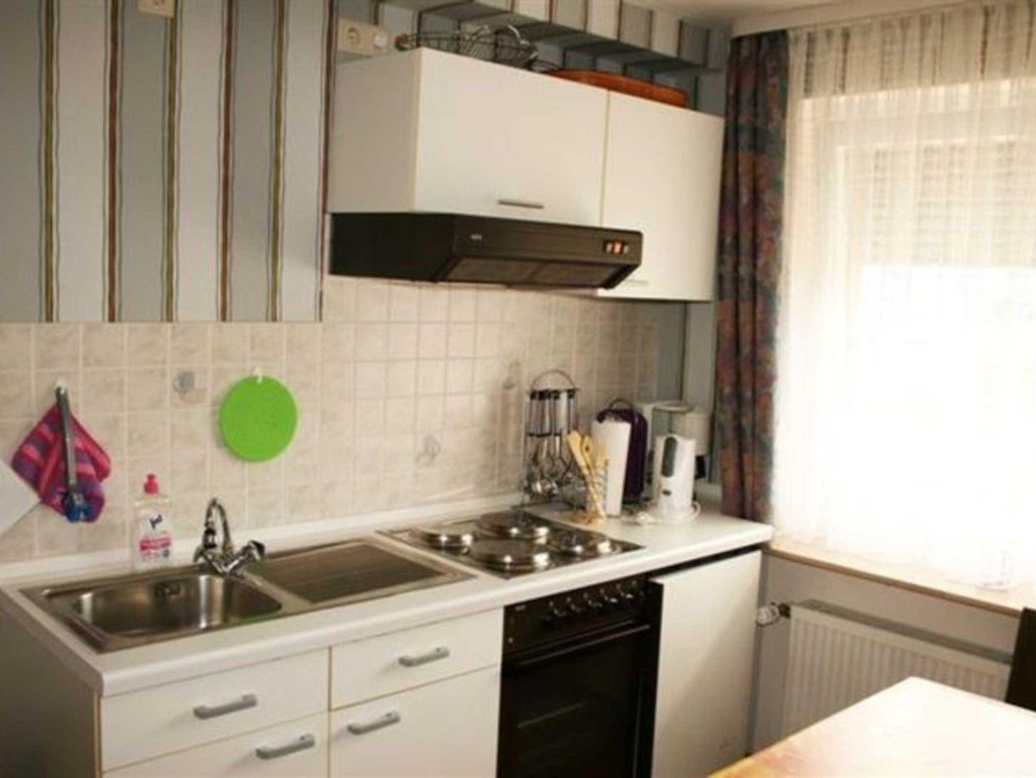 Sie besteht aus einer komplett eingerichteten Küche, einem Wohnraum mit Sat . -TV.