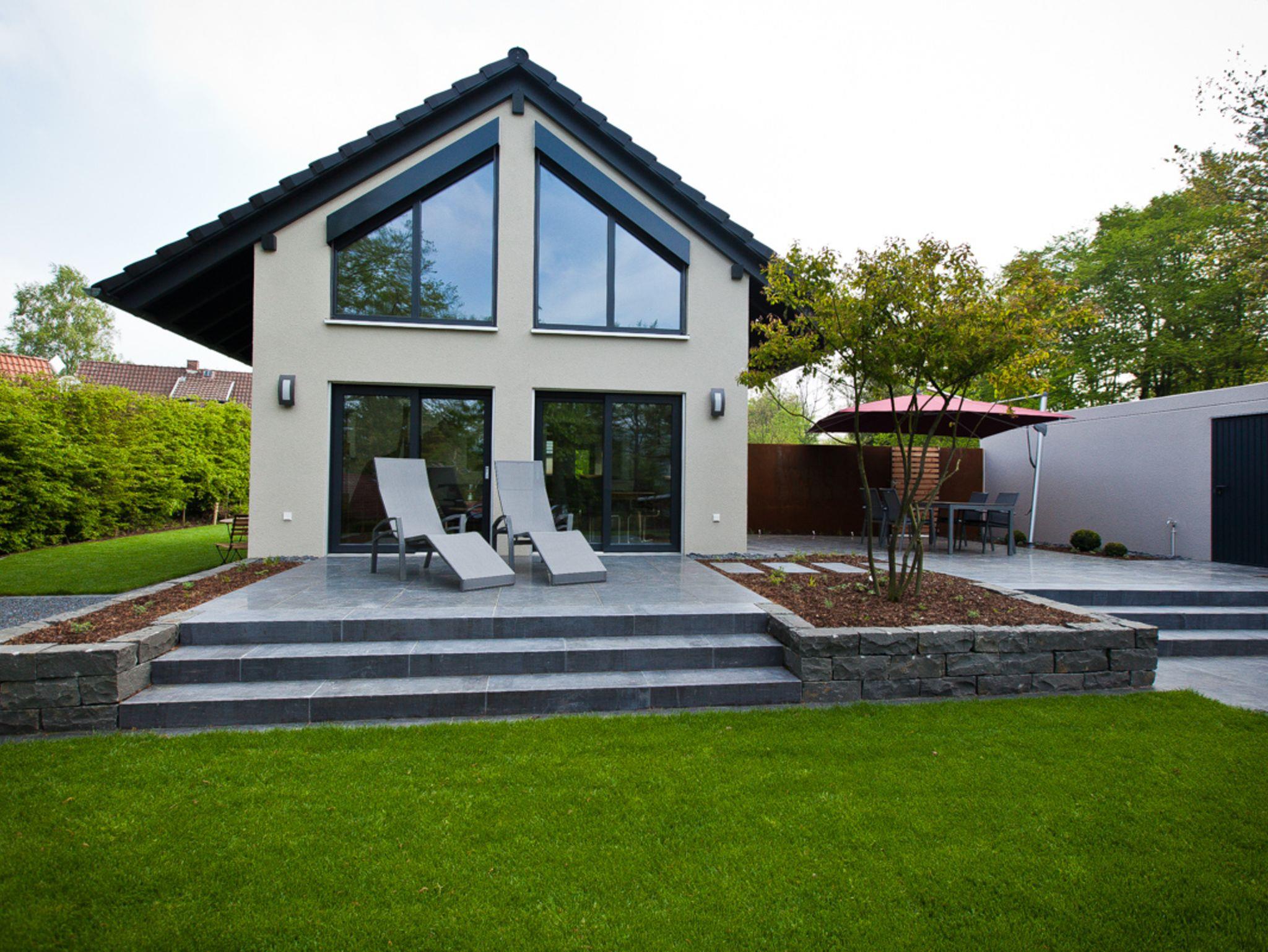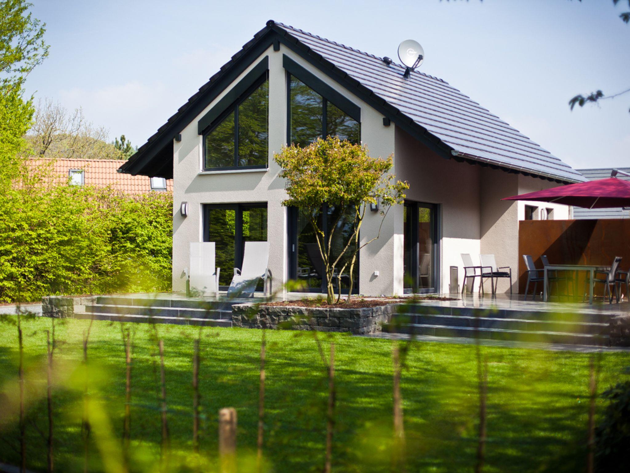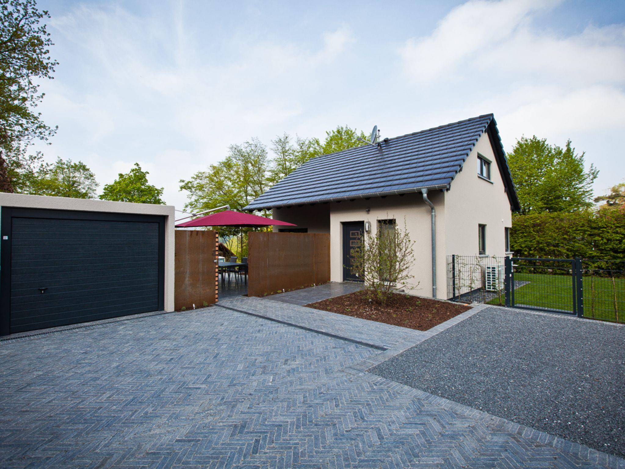 Das Ferienhaus bietet eine großzügige Außenanlage mit offener Einfriedung und einer frei stehenden Garage.