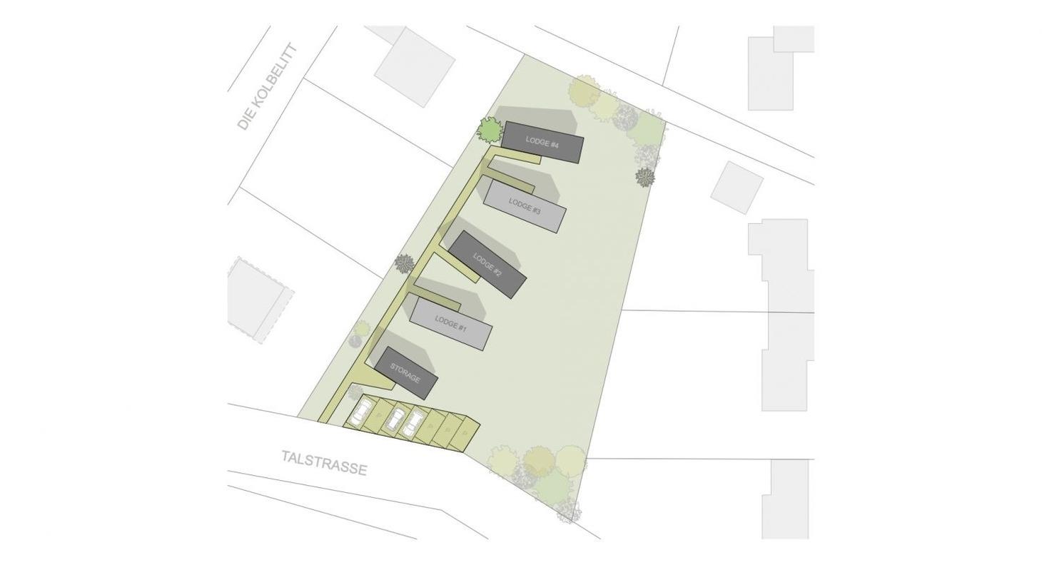 Auf dem größtenteils naturbelassenen Grundstück haben die Lodges ihren Platz ohne Eingriff in die vorhandene Topographie gefunden und nehmen diese zu ihrem Vorteil auf. Schon die Zuwegung zu den Häusern erfolgt fast schwebend über einen Laufsteg, der ebenfalls nur den notwendigsten Eingriff in das Gelände verlangte.