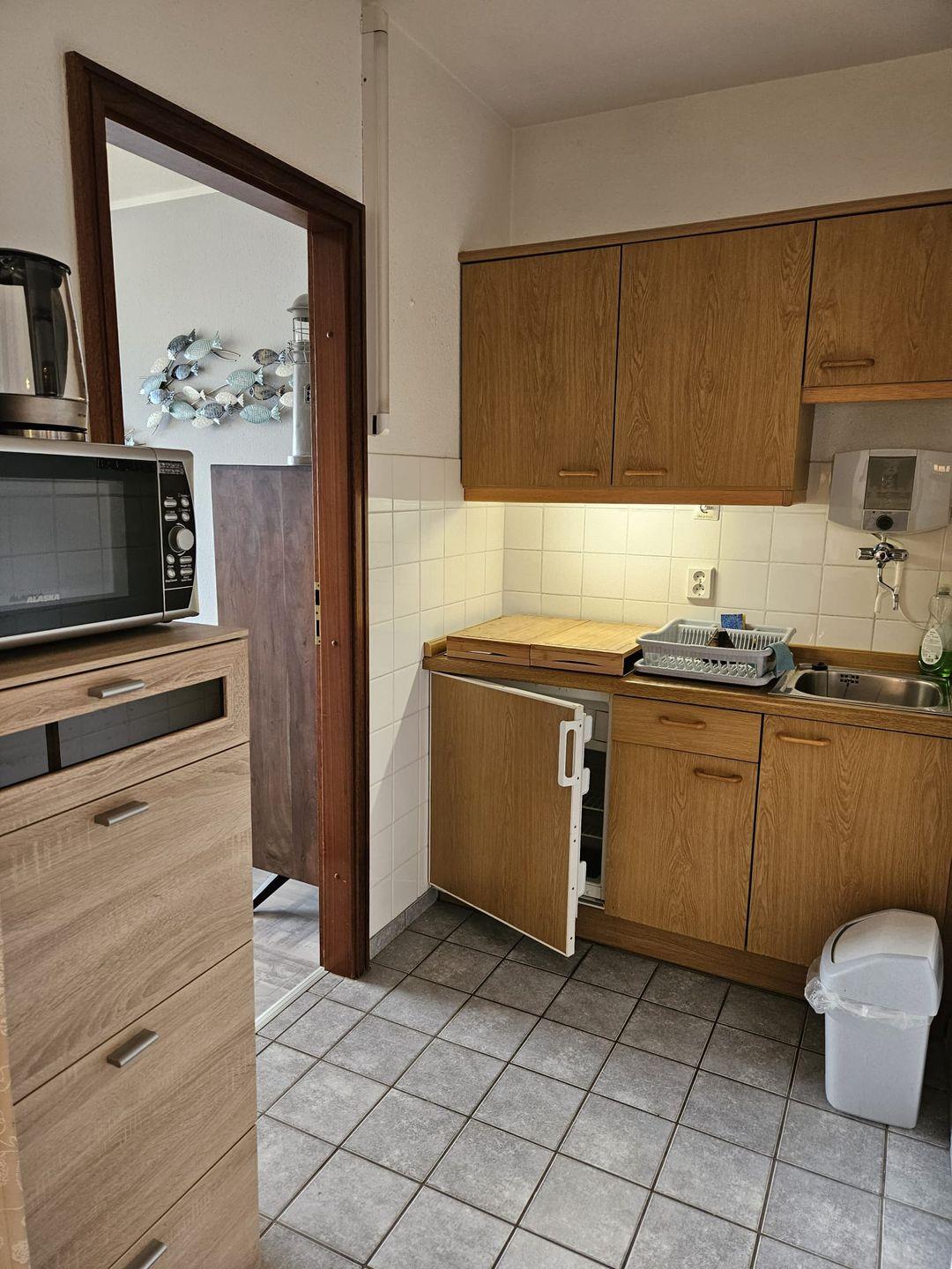 Im Weiteren die gut ausgestattete offene Einbauküche mit Ceranfeld, Spüle, Kühlschrank, Mikrowelle, Wasserkocher, etc..