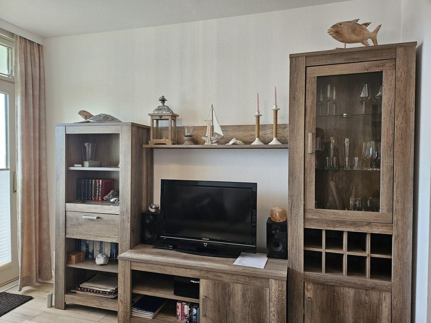 Ergänzt zur Seeseite durch den Wohnbereich mit komfortablen Sitzmöbeln, Couchtisch, Fernseher in der hübschen Wohnwand. Und diesem herrlichen vollen Seeblick über die gesamte Fensterfläche. Bei zu viel Sonneneinstrahlung auch zu verdunkeln. Auf dem in voller Breite davor liegenden Balkon lässt es sich sicher gut Sonnen baden, frühstücken, gemütlich Kaffee trinken, etc.