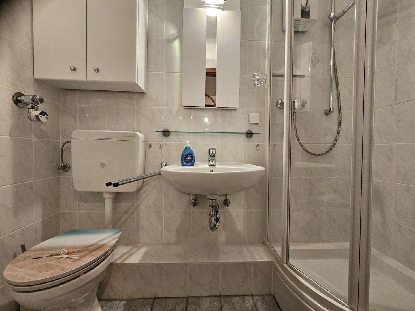 Weiter den freundlichen Flur entlang schließt sich das helle Duschbad an. Ausgestattet mit Allem für die tägliche Morgentoilette.