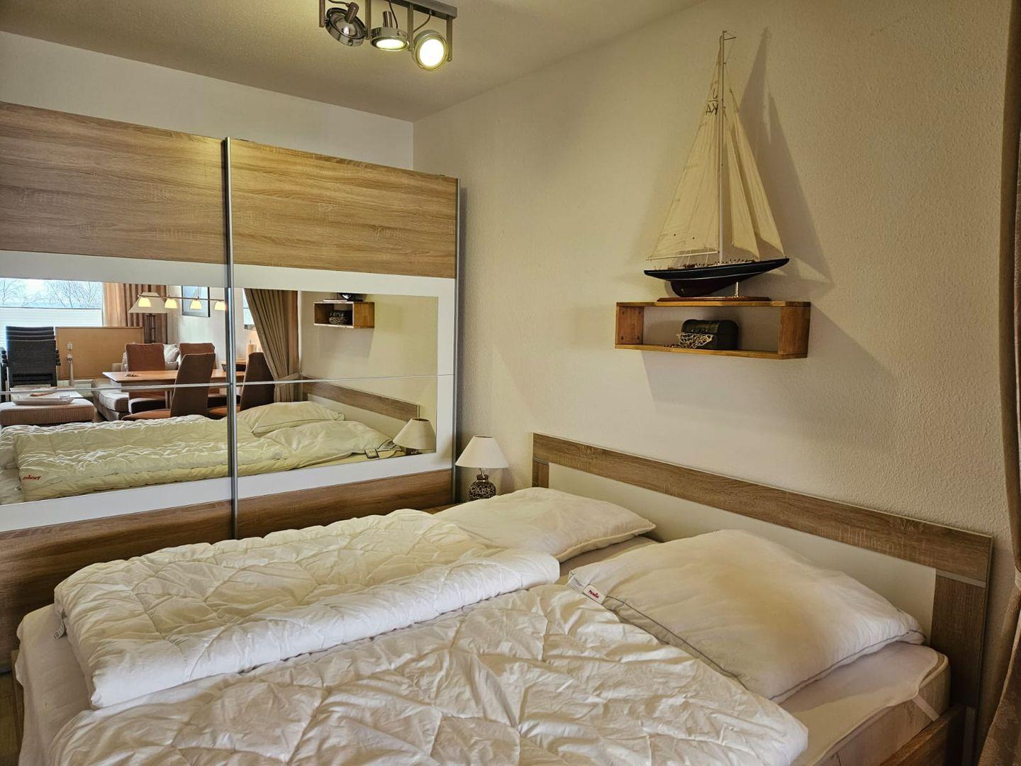Weiter geradeaus befindet sich dann das kleine geschlossene Schlafzimmer mit großem Fenster und mit tollem Ostseeblick. Nett eingerichtet und mit 2 Schlafplätzen ausgestattet.