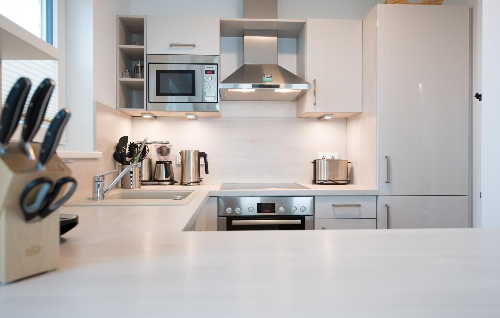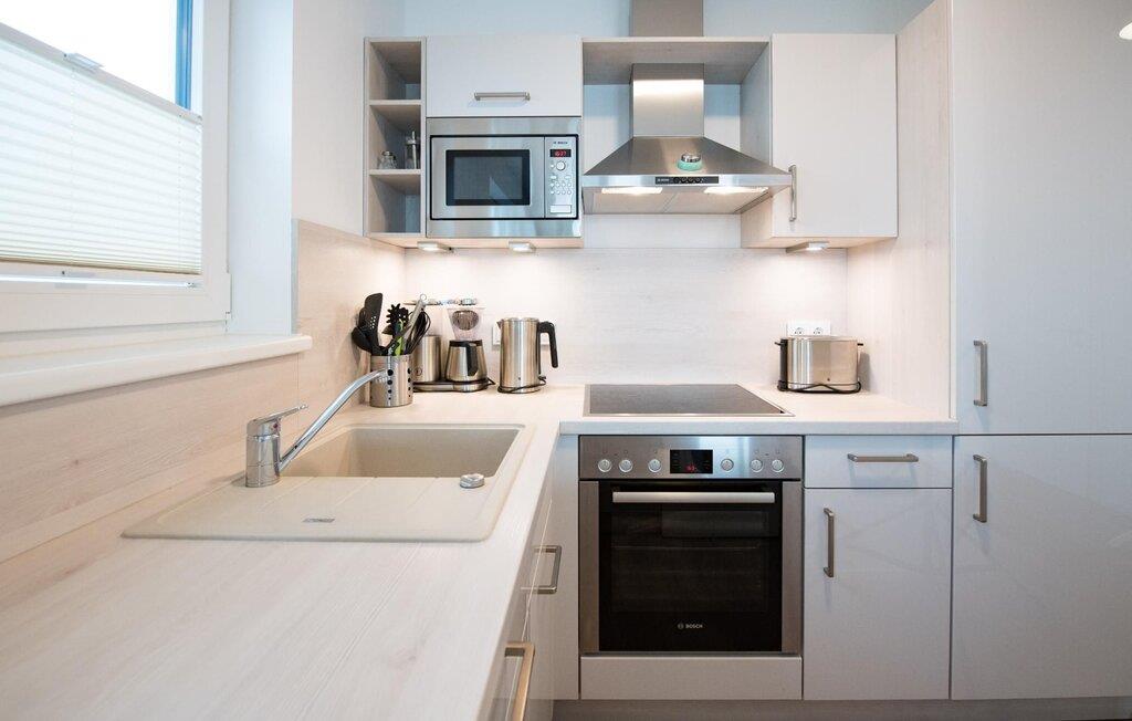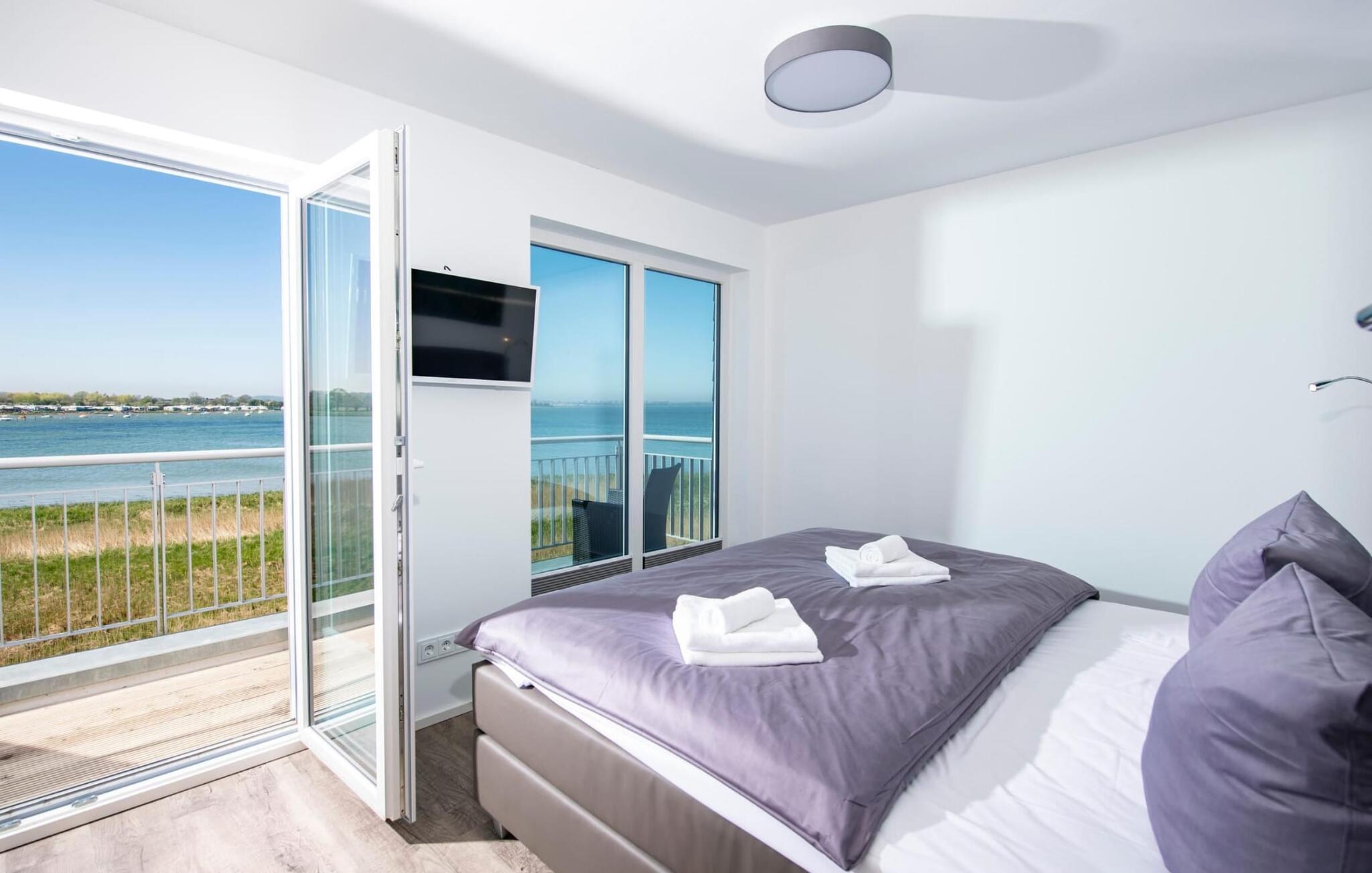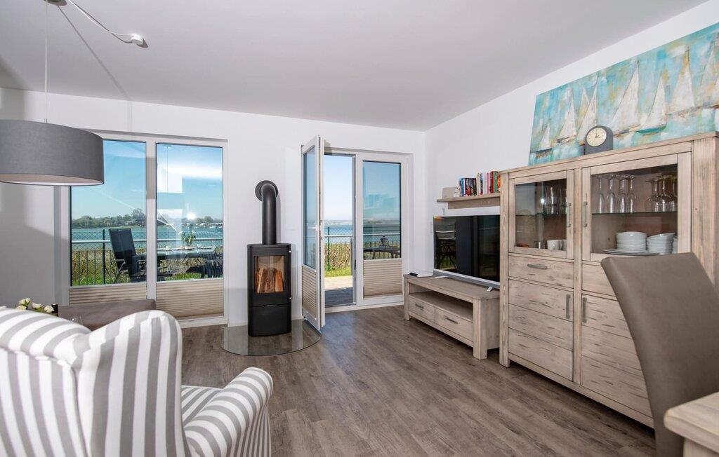 Vand overalt, hvor I ser. Beliggende på et smalt næs mellem Slien og sejl- og sportsbådshavnen i feriestedet Olpenitz ved Østersøen, ligger Edith-feriehuset lige ved vandet og har en fantastisk udsigt over Sleien. Tre terrasser på tre niveauer, møbler af meget høj kvalitet og moderne møbler inviterer jer til at blive hængende og slappe af. Den åbne stue/spisestue i stueetagen imponerer med gulv-til-loft-vinduer med udsigt over den idylliske Slei. Siddeområde, pejs og et stort spisebord sikrer komfort og hygge. Direkte ved siden af stuen er terrassen med panoramaudsigt over Sleien. Her sikrer fantastiske solnedgange romantik. Køkkenet, der er udstyret med kvalitetsprodukter fra WMF og Bosch, inklusive et induktionskomfur, lader intet tilbage at ønske og byder på alt hvad hjertet begærer. To soveværelser ovenpå giver op til fire voksne mulighed for at vågne op og falde i søvn med udsigt til vandet. Det store soveværelse med dobbeltseng scorer point med direkte udsigt over Sleien og støder direkte op til en komfortabel altan, så I kan lugte Østersøbrisen, så snart I står op. Det andet soveværelse vender ud mod havnen og er udstyret med to enkeltsenge, som nemt kan skubbes sammen. Et tv med hjemmeunderholdningsprogram i hvert soveværelse sørger for underholdning. Et andet sted at sove er tilgængeligt på den komfortable sovesofa i stuen. Også på første sal er hovedbadeværelset med et personligt wellness-program: boblebad, finsk sauna med udsigt til vandet og bruser gør dette badeværelse til en wellness-oase. Et andet brusebad i stueetagen giver ekstra komfort. Højdepunktet i feriehuset Edith er den store tagterrasse, som byder på panoramaudsigt over vandet over Sleien, dens udmunding til Østersøen og feriestedets havn. Her kan I nyde solen og det unikke vandlandskab i fulde drag. Vores yndlingssted: Sæt jer i den stilfulde køkkensofa og nyd den vidunderlige udsigt over Slien, mens I nyder et lækkert feriemåltid. Der er parkeringspladser og et cykelskur lige foran huset. Feriehuset Edith er den ene halvdel af et hus. Bemærk venligst: OstseeResort Olpenitz er meget populært, og der bygges fortsat i parken. Ikke desto mindre kan I se frem til en 5-stjernet standard og et førsteklasses ophold. Byggeaktiviteterne kommer ikke til at forstyrre jer på ferien, og derfor gives der ikke yderligere afslag i prisen.