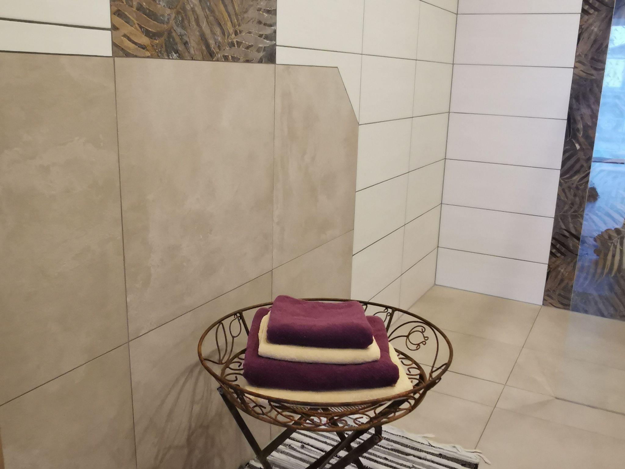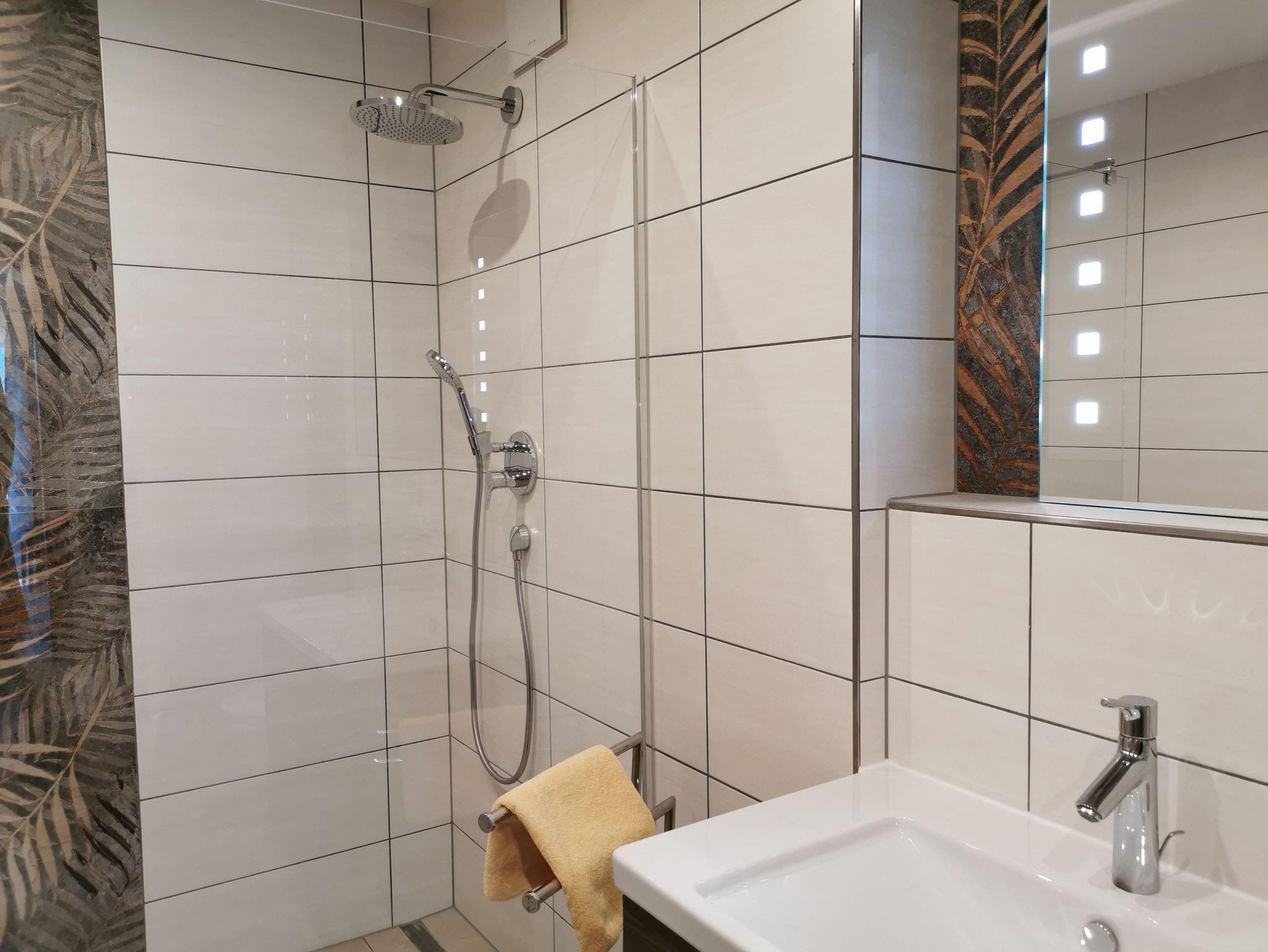 • Modernes Badezimmer mit Regendusche, Waschmaschine und Wäschetrockner