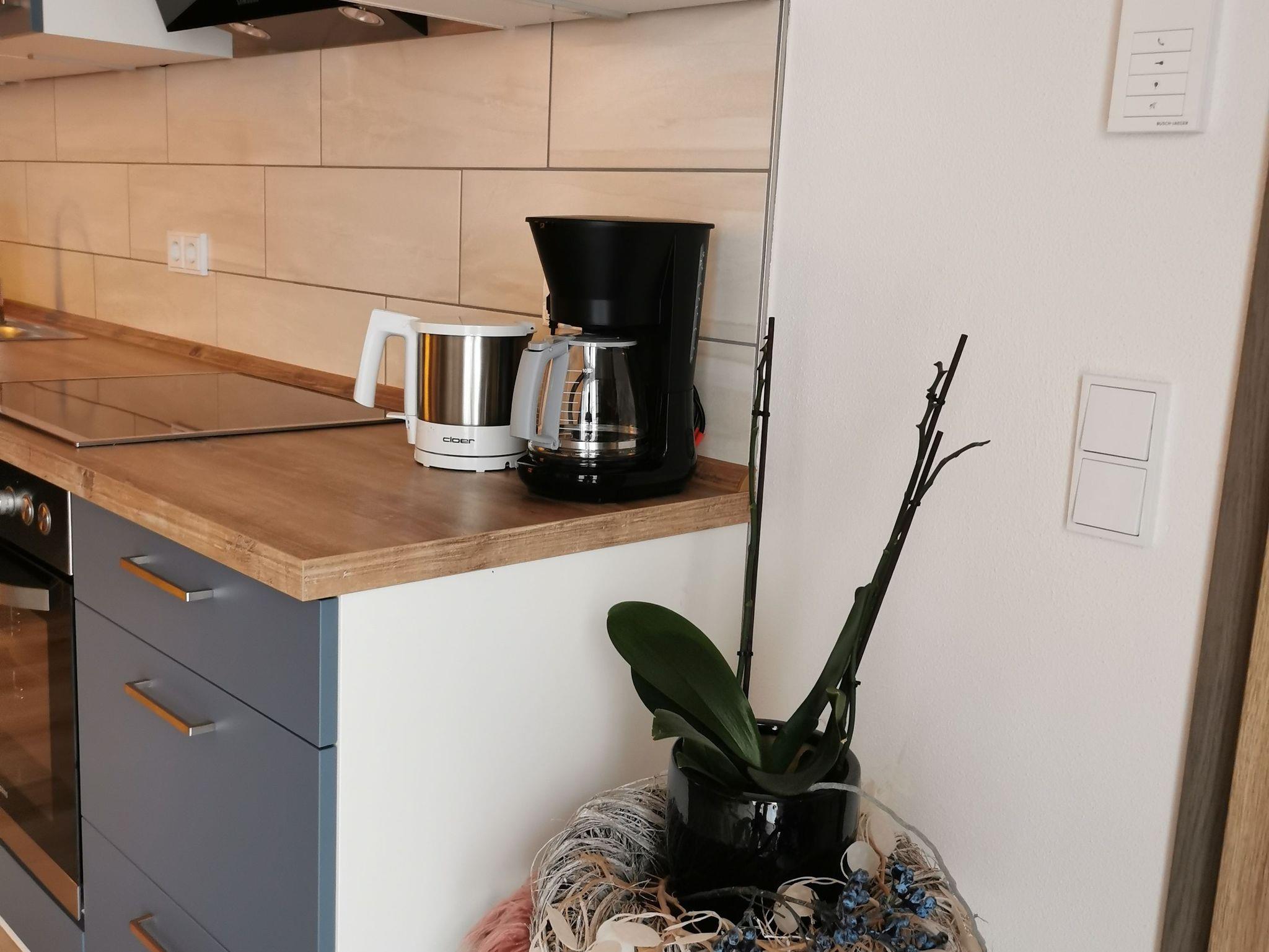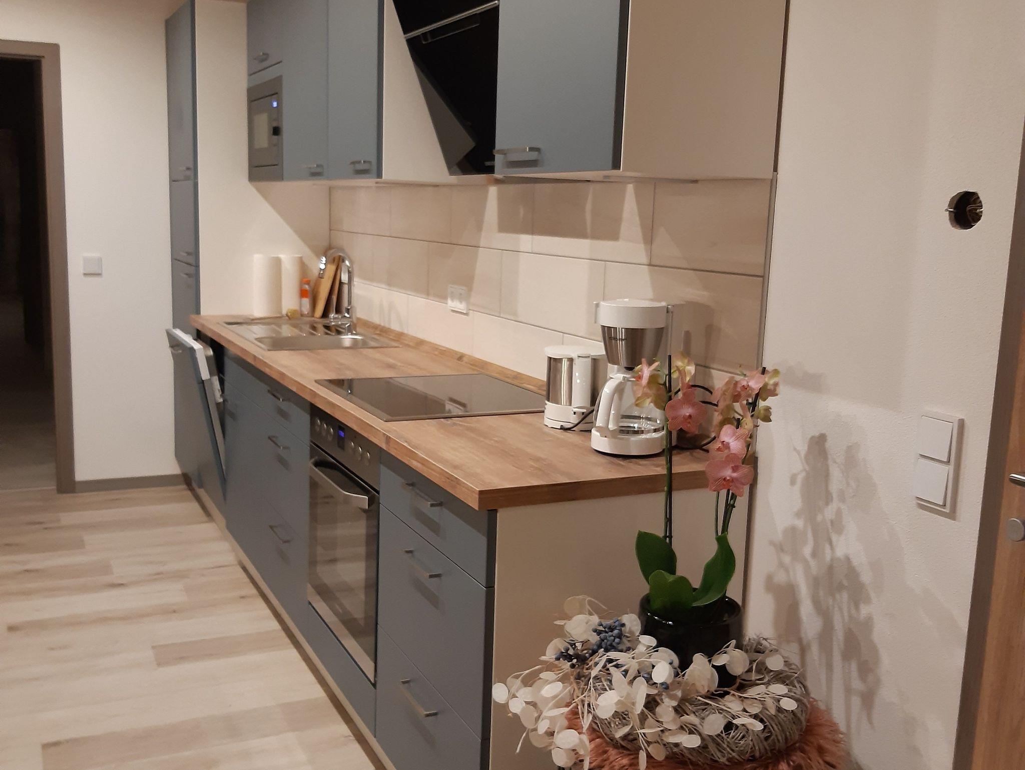 In unserer voll ausgestatteten Küche befinden sich u.a. Kühlschrank mit Gefrierfach, Mikrowelle, E-Herd, Geschirrspülmaschine,Kaffeemaschine, Wasserkocher und ein Handrührgerät.