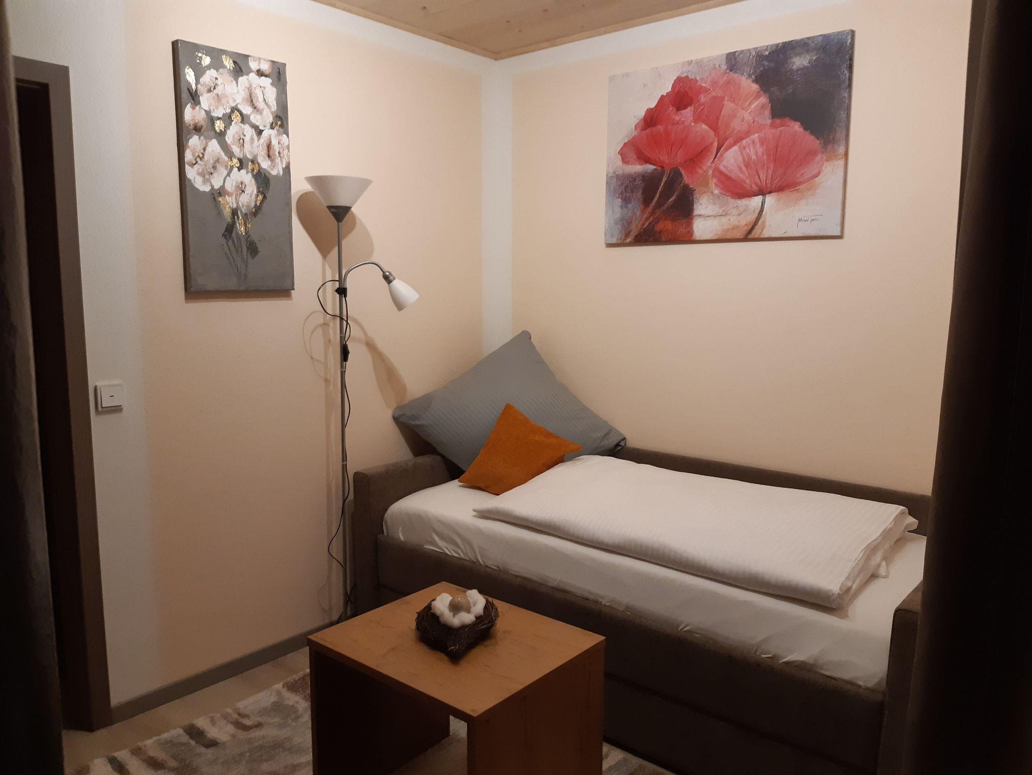 Im Schlafzimmer ist ein Doppelbett, dieses kann auf Wunsch auch als 2 Einzelbetten gestellt werden.