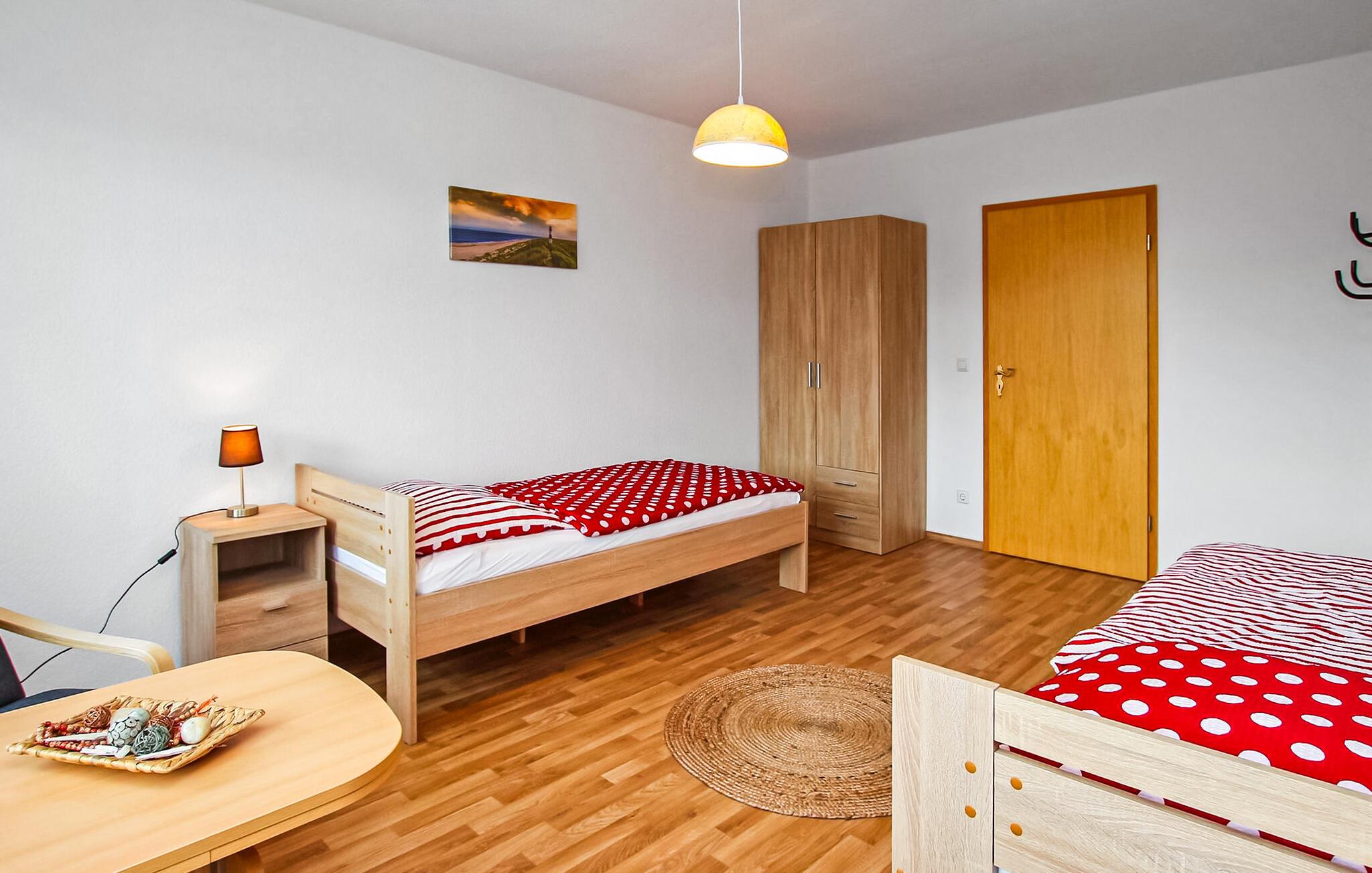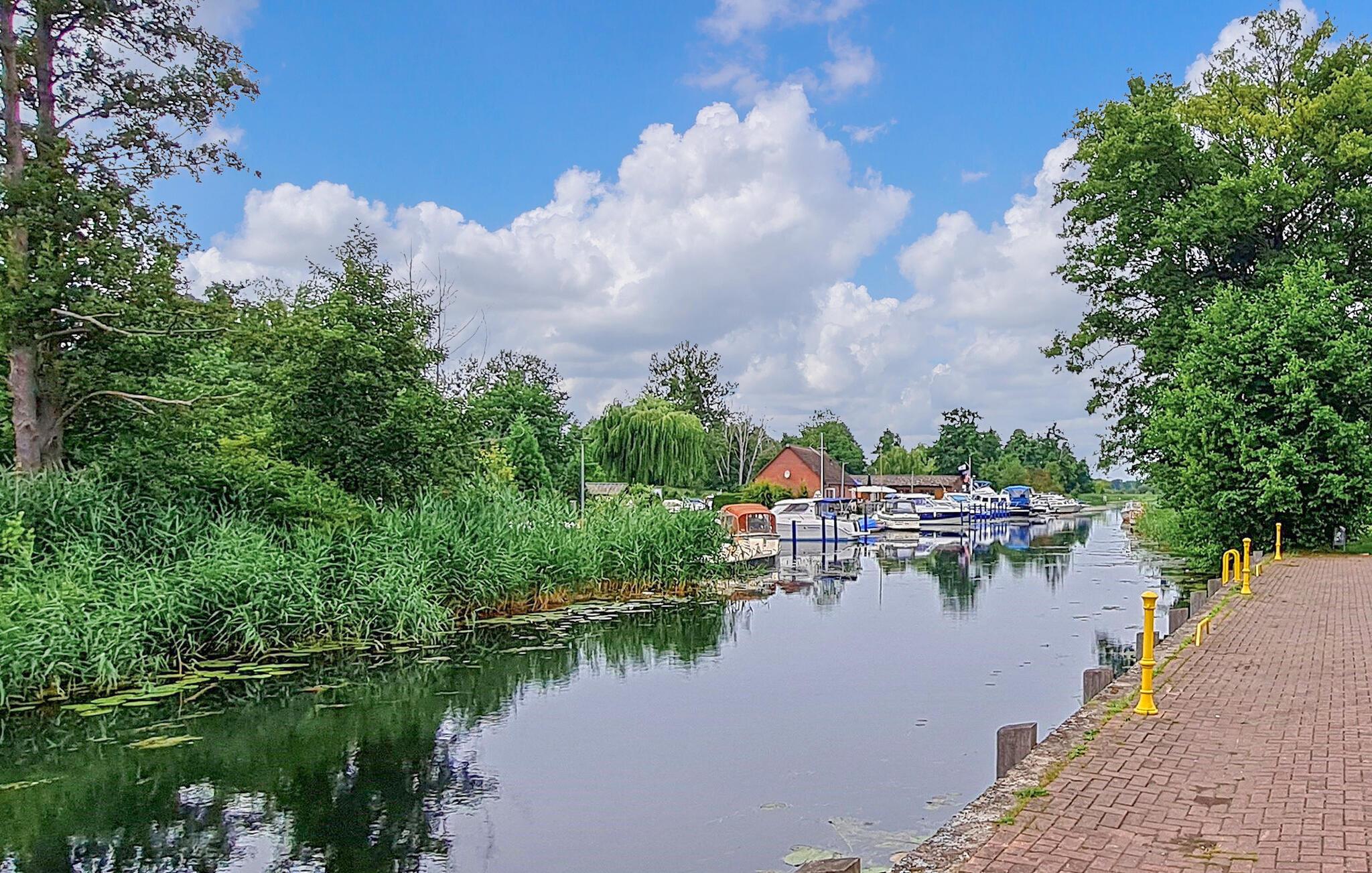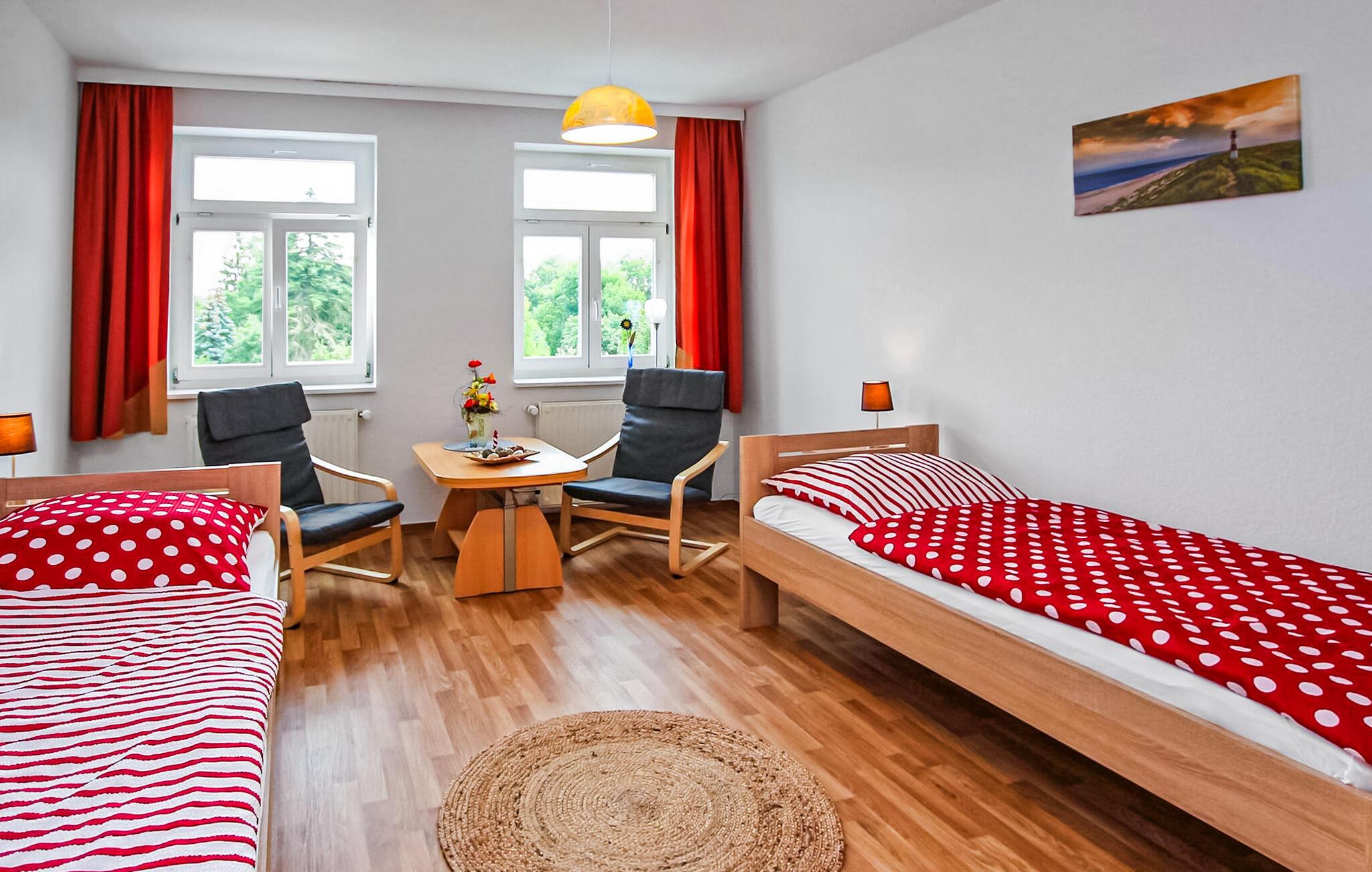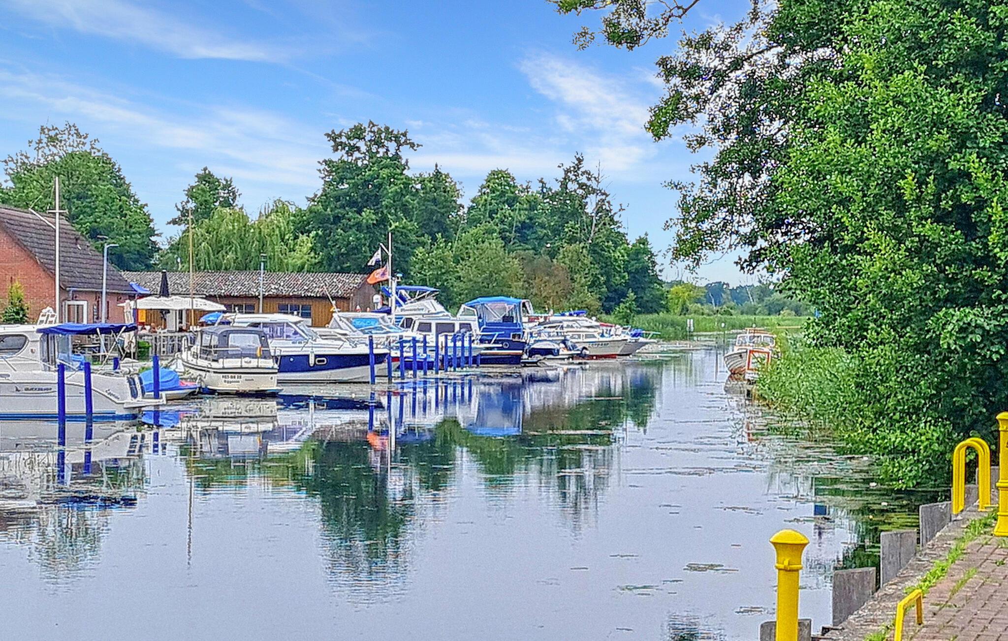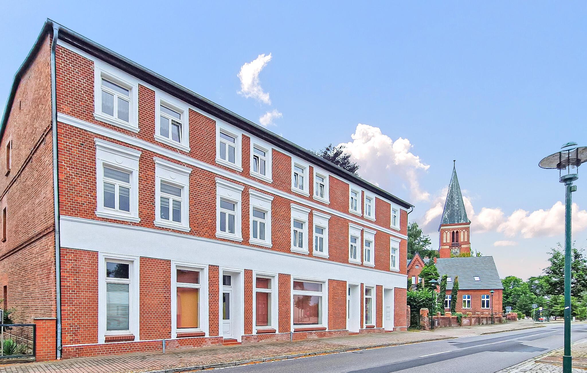 Centralt beliggende i centrum af Eggesin ligger ferielejligheden for op til 5 personer, som blev totalrenoveret i 2023, på anden sal i en beboelsesejendom. (BEMÆRK: INGEN udlejning til bygningsarbejdere/montører!) Den idylliske naturhavn på Randow med udlejningsmuligheder for både eller flåder og naturparkens besøgscenter er kun få skridt væk, ligesom togstationen og to supermarkeder. Lige overfor ligger en iskiosk og den kendte blåbærlade med gårdbutik og café. Den cirka 90 kvm, centralt opvarmede ikke-ryger lejlighed er tilgængelig via en fælles trappe og har en stor stue (sovesofa - ekstra seng til 1 person, gyngestol, fladskærms-tv), to soveværelser (1 x dobbeltseng, 1 x to enkeltsenge, lille opholdsområde), et stort separat køkken (spisebord, el-komfur med ovn, mikroovn, køleskab med fryser, opvaskemaskine, brødrister, kaffemaskine, elkedel), et badeværelse (bruserbakke, toilet, hårtørrer) , et lille depotrum og en stor entre. Parkering, aflåselig cykelopbevaring, WiFi og en høj stol er også tilgængelige. Den samlede pris inkluderer slutrengøring, el, vand og den første levering af sengelinned og håndklæder. Kæledyr er ikke tilladt i denne ejendom. Eggesin, porten til lagunen, er en lille by midt i Stettiner-lagunens naturpark, som er karakteriseret ved de naturlige, ubebyggede dele af lagunens kyst med lagunens enge, store skovkomplekser i Ueckermünder Hede, lavlandet af Uecker- og Randow-floderne og Brohmer-bjergene. Naturelskere vil finde dette her, og stressede byboere kan slappe af selv i højsæsonen og udforske den skovklædte region på cykel eller til vands. Den relevante information og udflugtstip findes i Eggesin Naturpark Besøgscenter, og både og flåder kan lejes i den idylliske naturhavn midt i byen. På grund af overfloden af blåbær i området er Eggesin kærligt kendt som "blåbærbyen" og fejrer en blåbærfestival en gang om året. Talrige regionale bærprodukter kan købes i stalden af samme navn. Havnebyen Ueckermünde med sin fine sandstrand og zoo ligger kun cirka 8 km væk, og grænsen til nabolandet Polen er cirka 20 km væk.