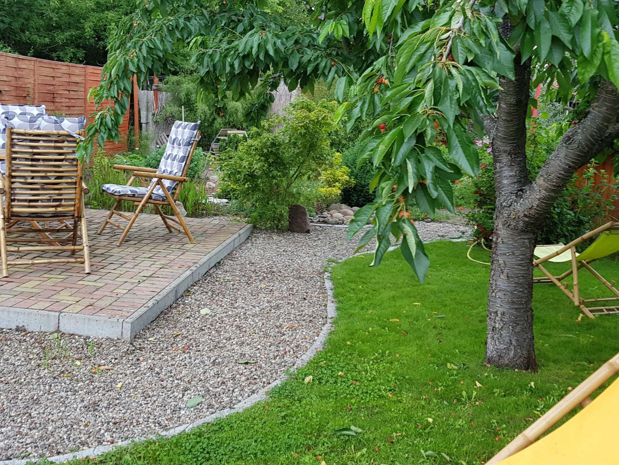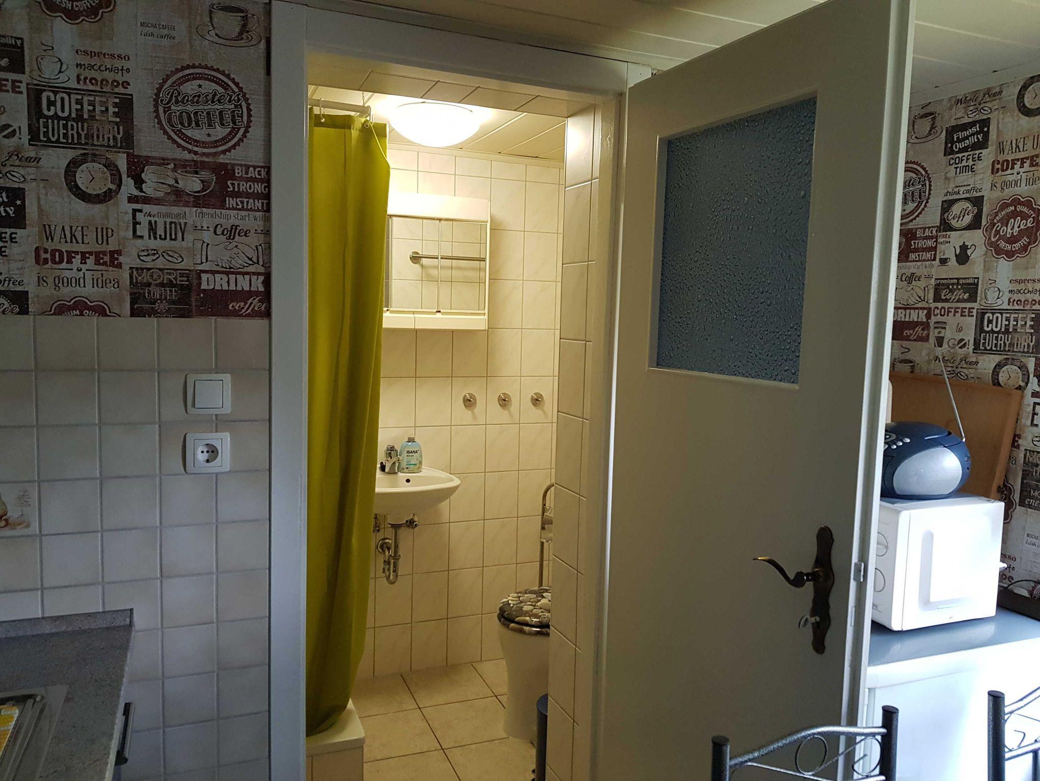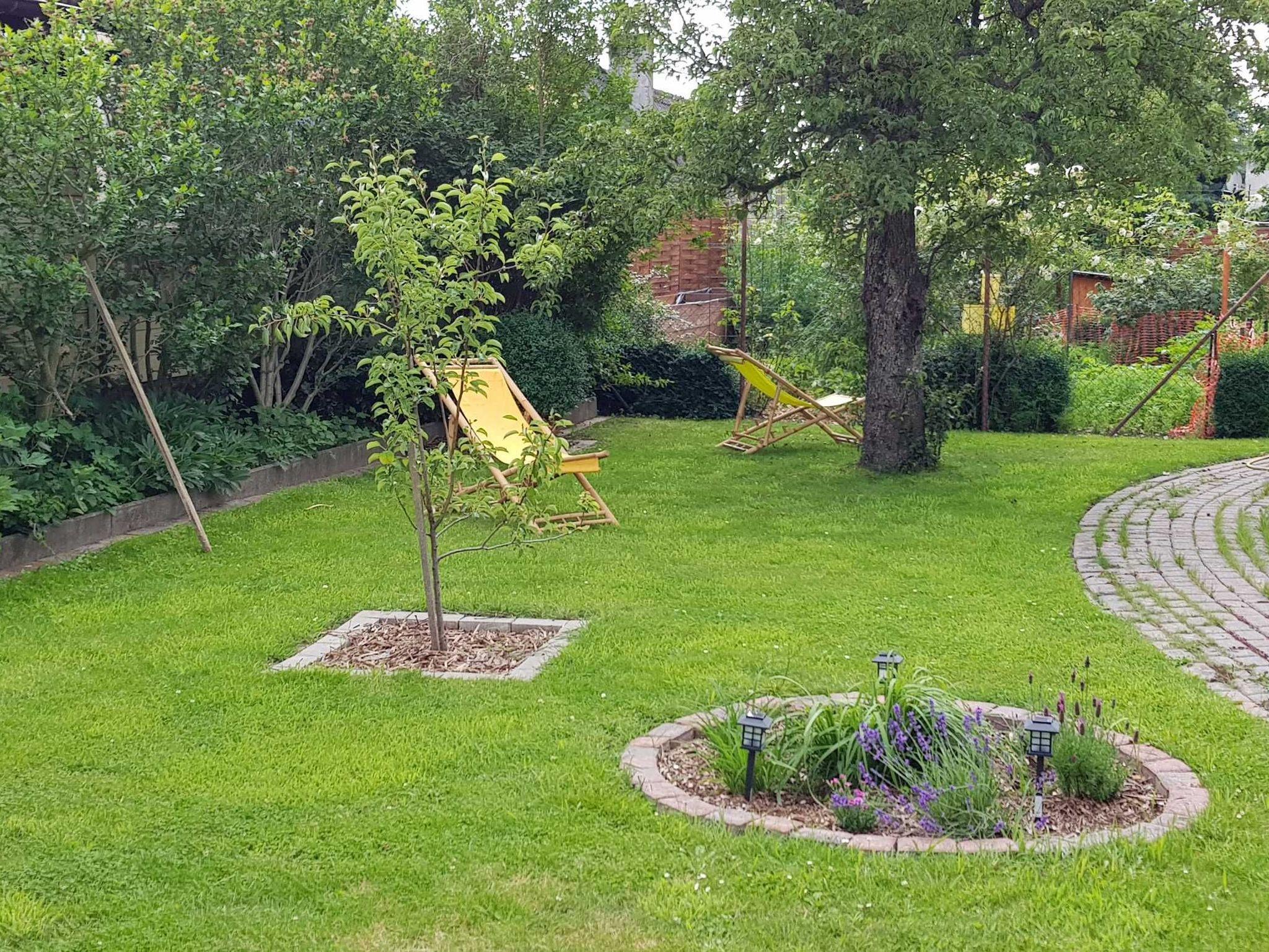 Ferienwohnung im Garten mit Liegewiesen, 1 Wohn-/Schlafraum mit Eckcouch und TV. 1 Schlafraum mit Doppelbett und großem Schrank, Dusche mit WC, Küche mit Essplatz, Kühlschrank, Mikrowelle, Wasserkocher, Geschirrspüler, Toaster, Kaffeemaschine und fürs Sonntagsei ein Eierkocher; Parkplatz, WLAN, Grillplatz