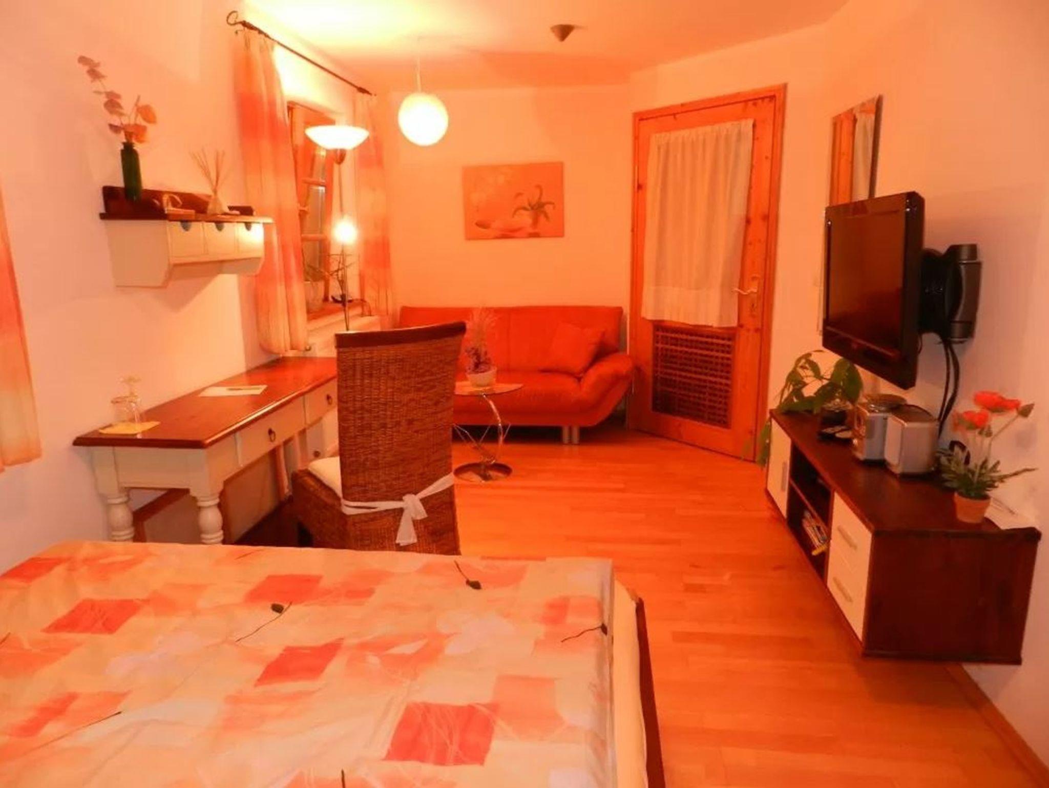 UDie Empore I ist unser kleinstes Ferienzimmer. Dieses Einzelzimmer bietet auf ca. 16 qm jeglichen Komfort, der bei 5 Sternen selbstverständlich ist. Hierzu kommen die wohlige Wärme und Liebe, die nicht nur die Farben ausstrahlen, sondern sich auch im Interieur wiederspiegeln. Zur Entspannung können Sie den Flat-Screen Fernseher mit DVD Player entweder zum 140 cm breitem, handgefertigten Bett oder zur Kuschelcouch hin schwenken. Die Nachmittags- und Abendsonne durchflutet diese Zimmer mit seinen Strahlen. Das sonnengelbe WC liegt separat auf den Gang. Leider müssen wir die Gäste dieses Zimmers bitten, die Duschen im Wellnessbereich zu nutzen. In der Gemeinschaftsküche können Sie Ihr Essen zubereiten. Das paradiesische Verwöhnfrühstück können Sie sich auch auf Wunsch von uns zubereiten lassen und im Frühstücksraum einnehmen.