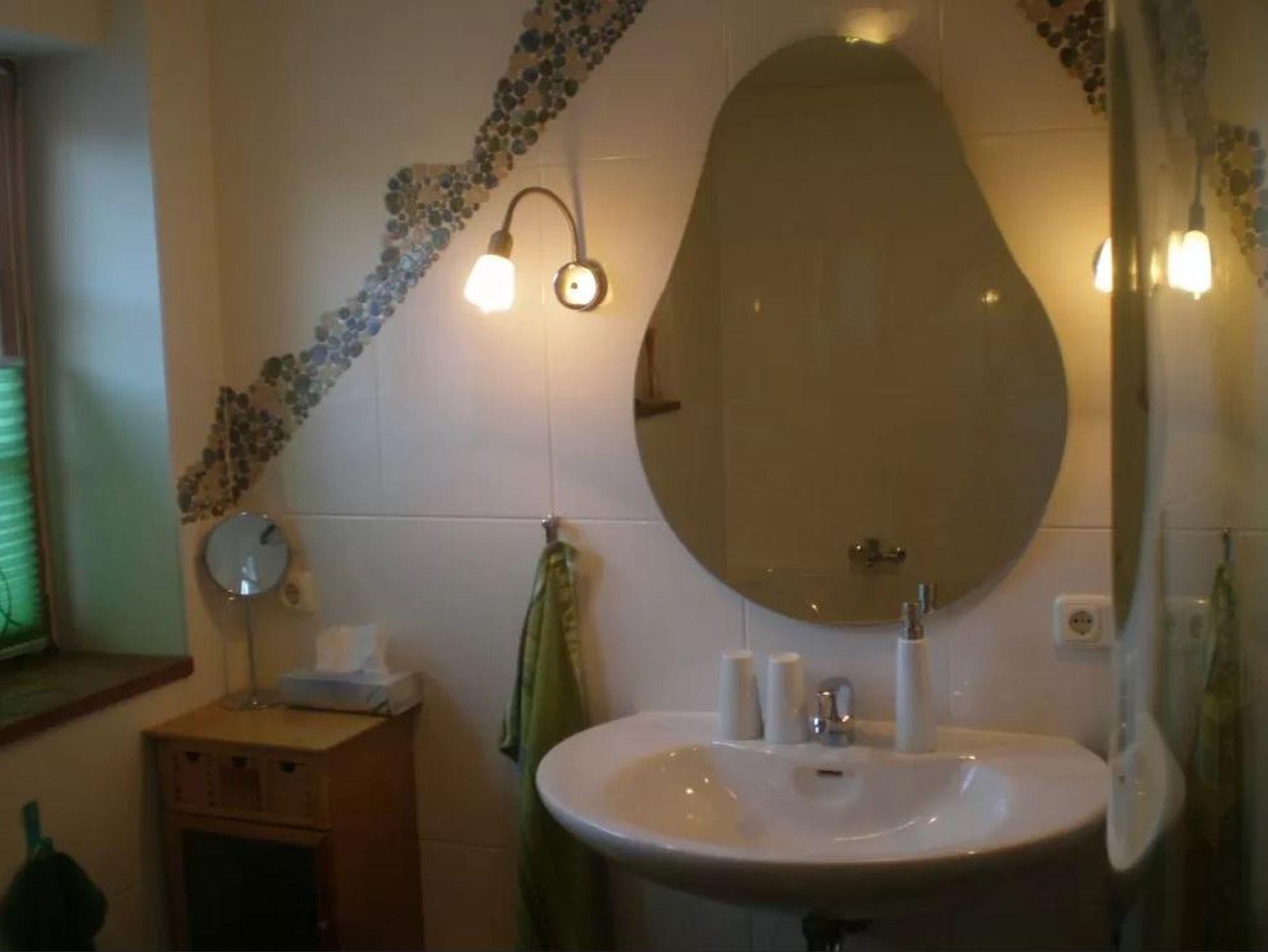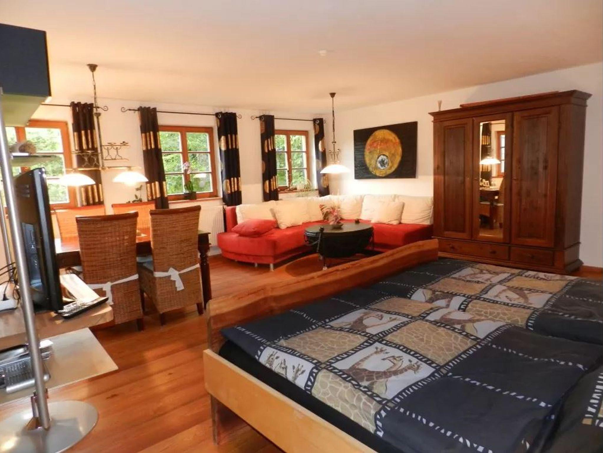 Raum in Hülle und Fülle erwartet Sie in Empore III. Auf 34 qm, die mit einem schimmernden Lärchenholzfußboden bedeckt sind, befindet sich an der inneren Wand das 2 x 2 m große handgefertigte, massive Doppelbett mit Blick auf die Lamaweide. Durch insgesamt 5 Fenster flutet das Licht. Der Unterhaltungs-Tower lässt sich entweder zu den Betten drehen oder zur gemütlichen Eckcouch mit seinem Trommeltisch. Sogar von Tisch mit vier Stühlen aus können Sie die Nachrichten verfolgen. Für Geschäftsreisende dient er als Büro. Der Gast kann ihn auch zum Malen, Lesen, Spielen oder nur zu einer Brotzeit nutzen. Ihr luxuriöses Bad liegt nur einen Sprung über den Gang. Es könnte auch Verwöhnoase mit Bidet, WC, Dusche, Badewanne und Waschtisch genannt werden. Der Auftritt zur Badewanne ist ebenso wie der Duschbereich und der Abschluss der Wandfliesen in Mosaiken gearbeitet. Der Fön liegt auf einem Kästchen neben dem formschönen, sanft geschwungenen Waschtisch, von dem aus Sie auch durch das Fenster ins Grüne blicken können. In der Gemeinschaftsküche können Sie Ihr Essen zubereiten. Sie können sich auch nach Wunsch von unserem paradiesischen Frühstück verwöhnen lassen.