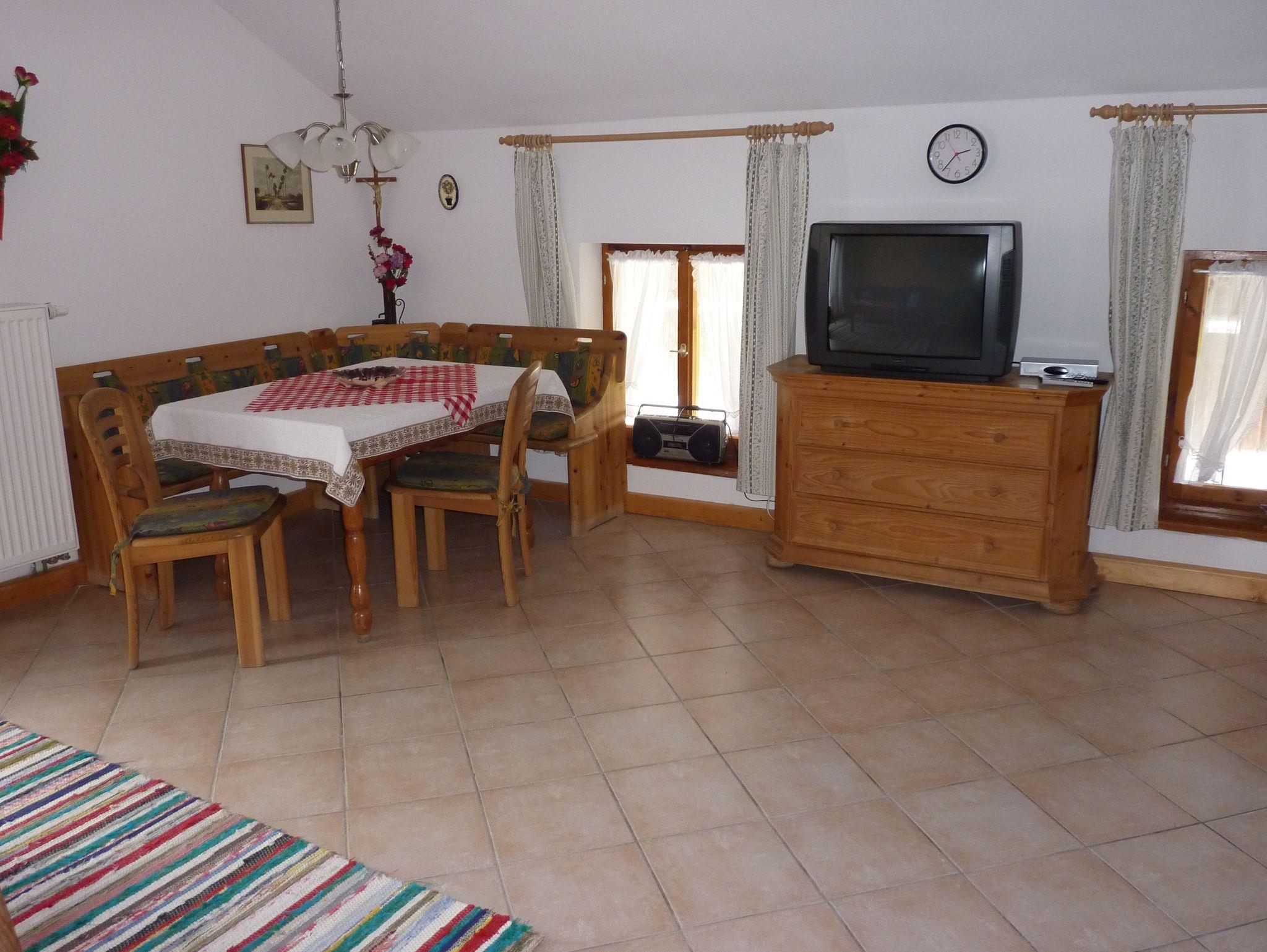 Eine Eßecke und eine Couch mit Sat - TV, sowie Internetanschluß komplettieren die Einrichtung im ländlichen Stil.
