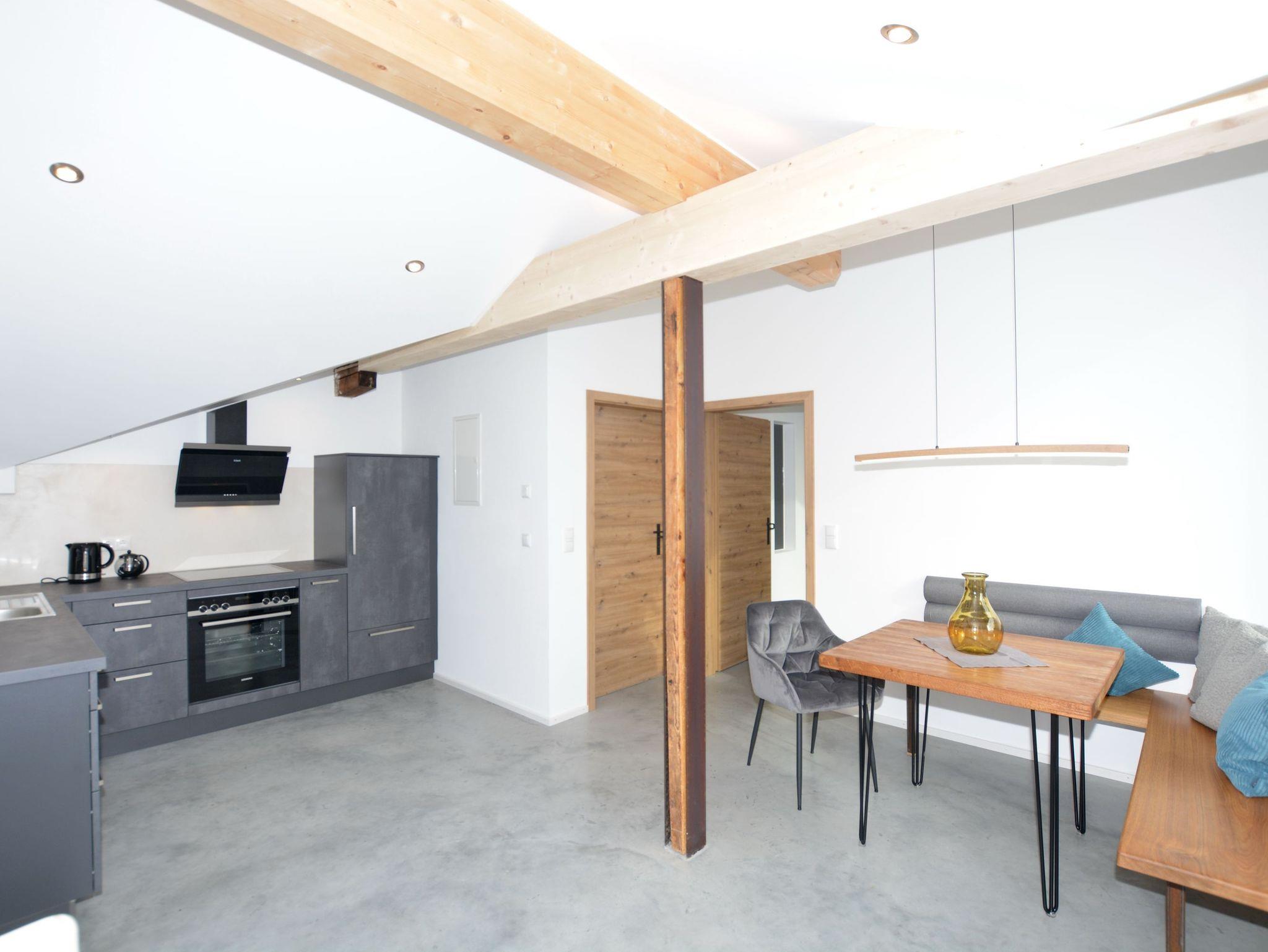 Meisterhof-LichtBlick, ein echtes Juwel im neu ausgebauten Dachgeschoss des Nebengebäudes im Meisterhof, heißt Sie herzlich willkommen. Das luxuriös und modern ausgestattete Loft bietet einen traumhaften Blick auf die Berge des Chiemgaus und des Inntals. Es ist der perfekte Ort zum Abschalten und Entspannen, somit optimal für die Urlaubszeit. Die hochwertige Ausstattung, die vom Eigentümer sorgfältig ausgewählt wurde, wird Sie begeistern. Das offene Wohnkonzept des Wohn- und Essbereiches mit offener Küche ist geschickt durch wenige Stufen und eingebaute Mauern getrennt worden, hier kann man sich nur wohlfühlen. Im Boxspringbett des angrenzenden Schlafzimmers finden Sie sicherlich einen angenehmen Schlaf. Modern ausgestattet präsentiert sich das Badezimmer mit bodengleicher Dusche, einem Waschbecken und einer Toilette. Entspannen auf der großen West-Terrasse - Lichtblick hat Vieles zu bieten.