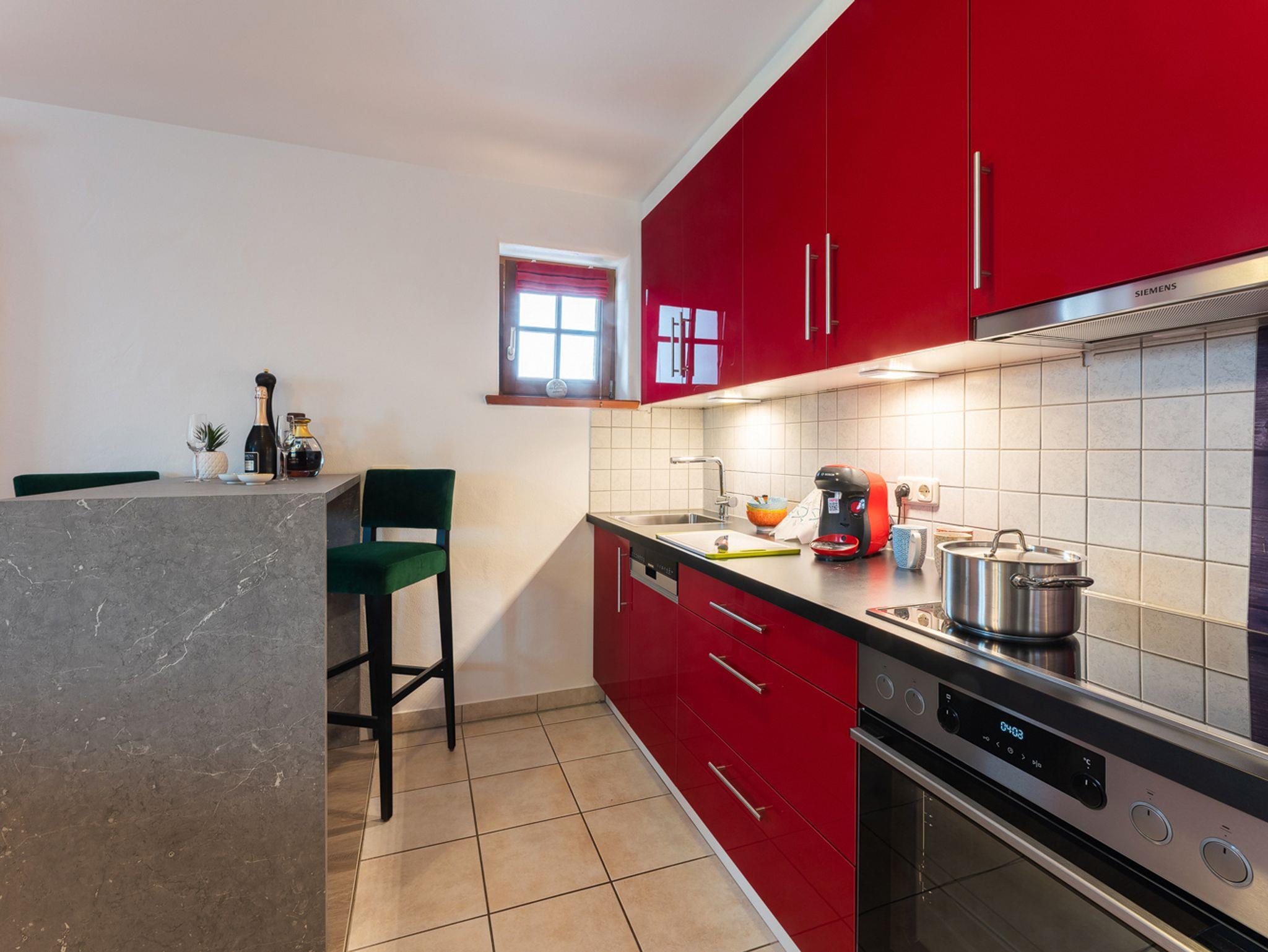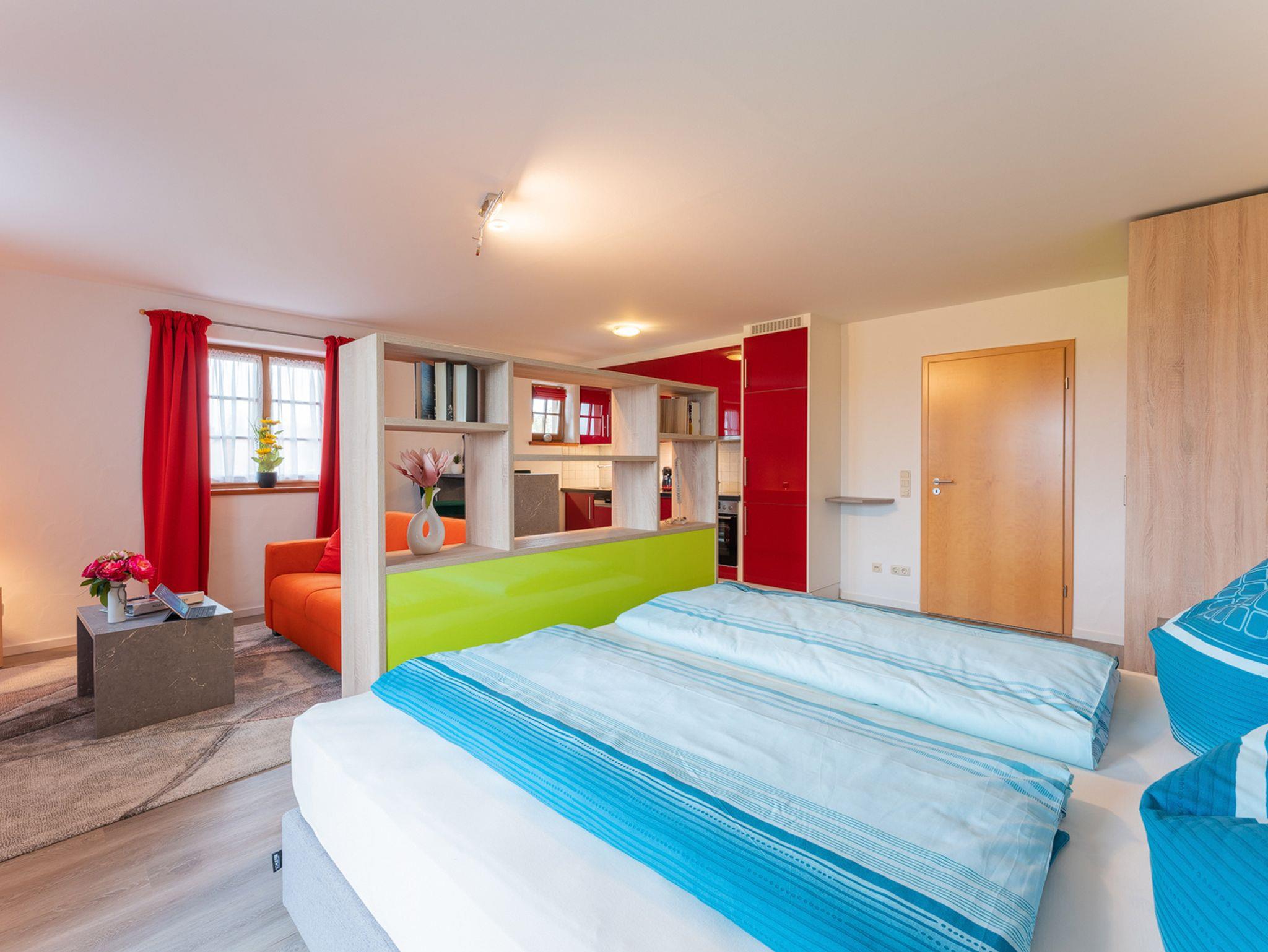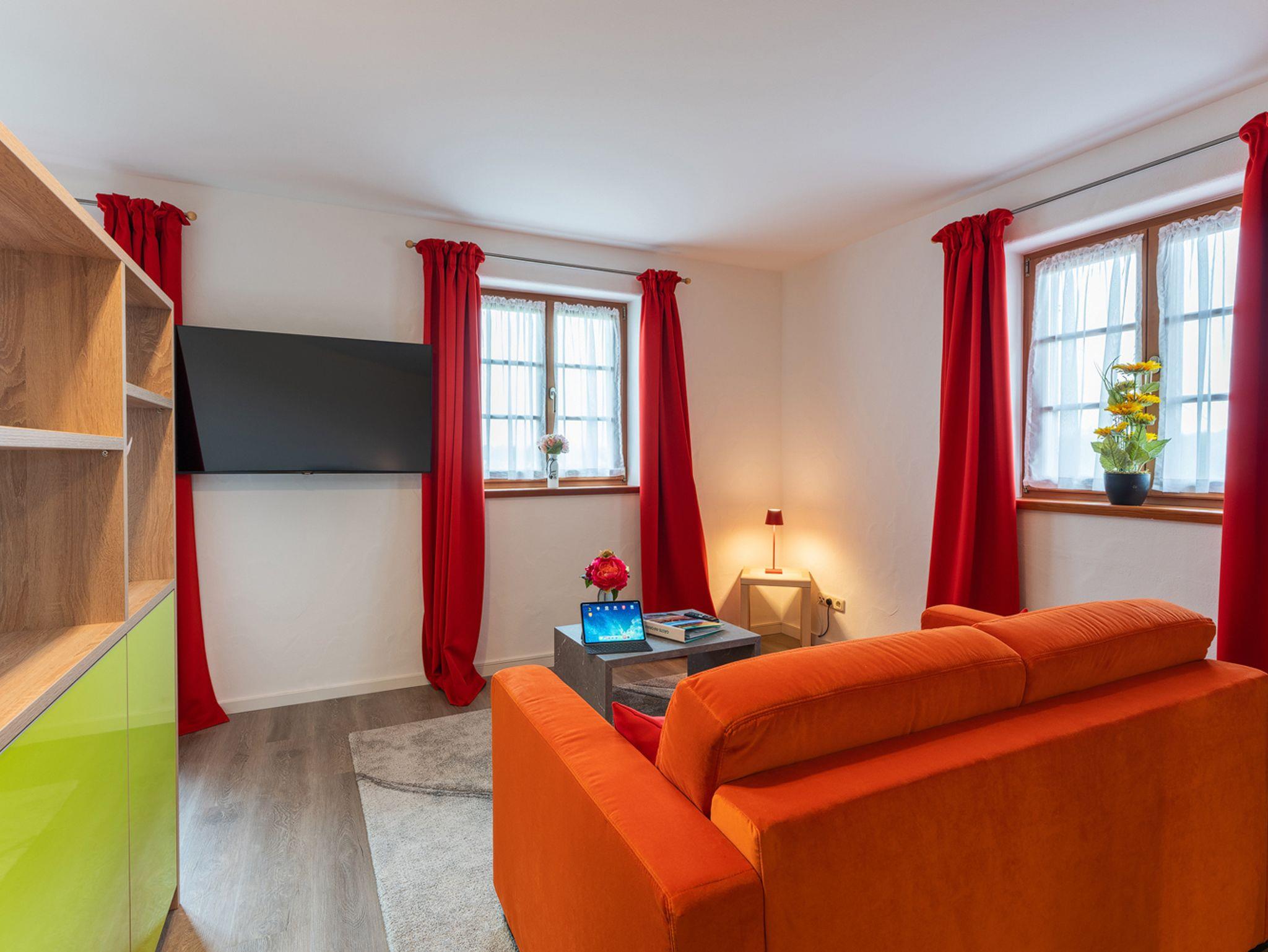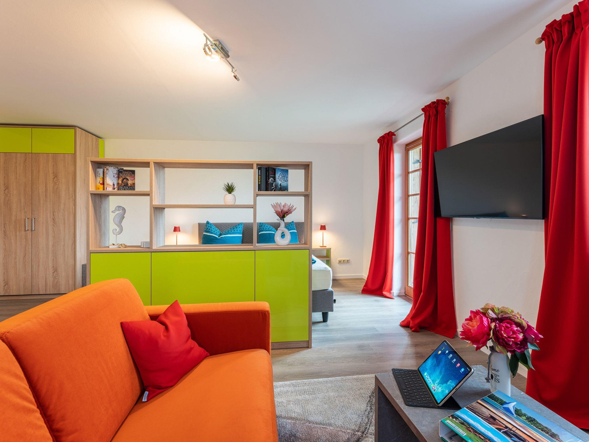 Beim Appartment Jabobo handelt es sich um ein Quartier das ideal für zwei Personen ist. Ganz neu und im modernen Alpenstil eingerichtet, lässt es für einen Urlaub oder ein verlängertes Wochenende kein Wünsche offen. Auf den 50m² ist alles untergebracht und das sehr frisch, hell und freundlich. Die Einbauküche mit seinen kanllroten Fronten bringt Farbe in den Tag und das gilt auch für die restliche Einrichtung. Ein Bartresen gibt Raum für das Dinner for two oder den ersten Kaffee am Morgen. Ein schickes Sofa und ein Flachbildschirm-TV, sowie der abgeteilte Schlafbereich mit einem tollen Boxspringbett runden den komfortablen Raum ab. Vom Balkon aus gibt es eine top Blick über Wiesen in die Berge. Das helle Duschbad bietet ausreichend Raum und im Eingang können Gepäck und Schuhe deponiert werden.