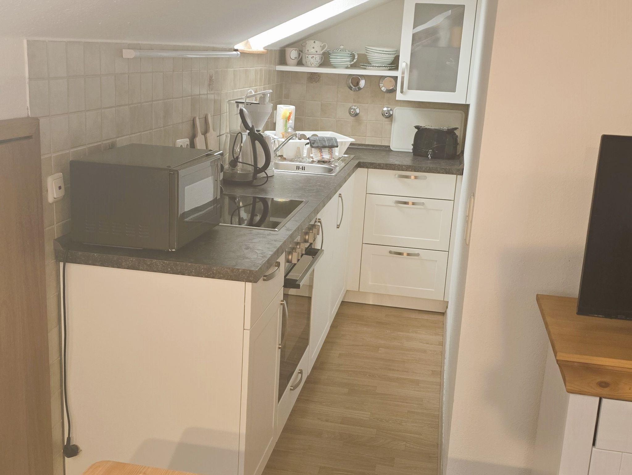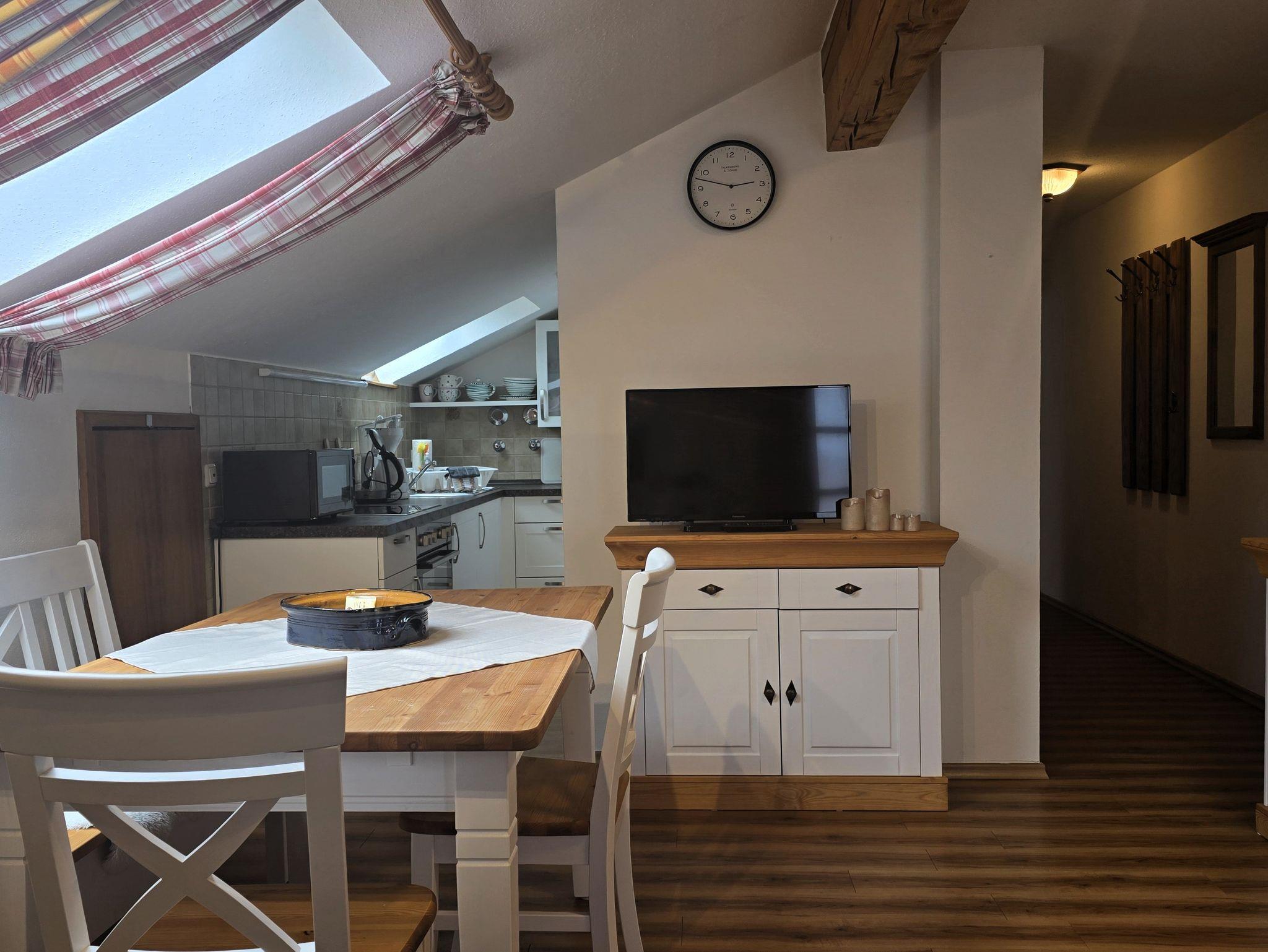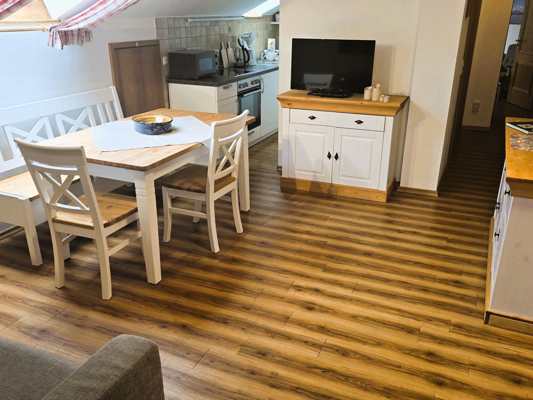 Sie sind romantisch veranlagt? Dann buchen Sie unsere Wohnung Hochfelln. Sie betreten die Wohnung und befinden sich gleich im Wohnbereich, mit typisch bayerischen Kanapee, das ausziehbar ist und so zwei Zusatz-Schlafplätze bietet. Die Eckbank mit Eßtisch ist ebenfalls typisch bayerisch! Hier steht auch ein großer TV-Flatscrene-Fernseher mit Bluerayplayer. Ein großes Dachflächenfenster lässt viel Licht und Sonne herein, vor allem, weil es nach Osten gerichtet ist. Hier haben Sie auch den Zugang zum extrabreiten Balkon (Norden), der überdacht ist und einen Balkontisch mit Stühlen für die Brotzeit bereit hält. Vom Wohnraum geht eine kleine Küchenzeile ab, mit zusätzlichen Dachfenster, die neben Herd und Spüle, Kühlschrank (mit Gefrierfach) und reichlich Geschirr, alles bietet, was man so für das Herrichten der Mahlzeiten so benötigt. Ein CD-Radio sorgt morgens für die gute Laune. Weiter geht es durch den Flur. Hier gehen das Duschbad und das separate WC ab. Schließlich betreten Sie das Schlafzimmer. Hier, wie in der ganzen Wohnung, wurde kürzlich ein heller, moderner Boden in Holzdekor verlegt. Das Schlafzimmer hat einen großen komfortablen Einbauschrank, das bequeme Doppelbett steht unter der Dachschräge. Direkt darüber eröffnet ein großes Dachflächenfenster den Blick auf die Sterne. Das Fenster läßt sich aber auch, zum Schutz vor der Sonne, mit einer Jalousie verdunkeln. Die Wohnung Hochfelln ist somit eine nette, romantische Wohnung, ideal für ein Paar, das sich Ruhe und Zweisamkeit wünscht.