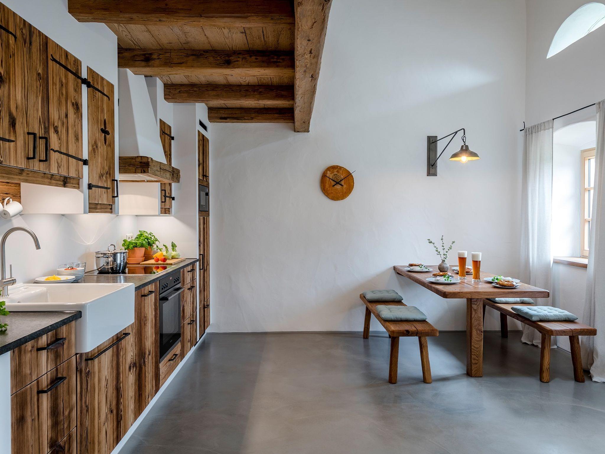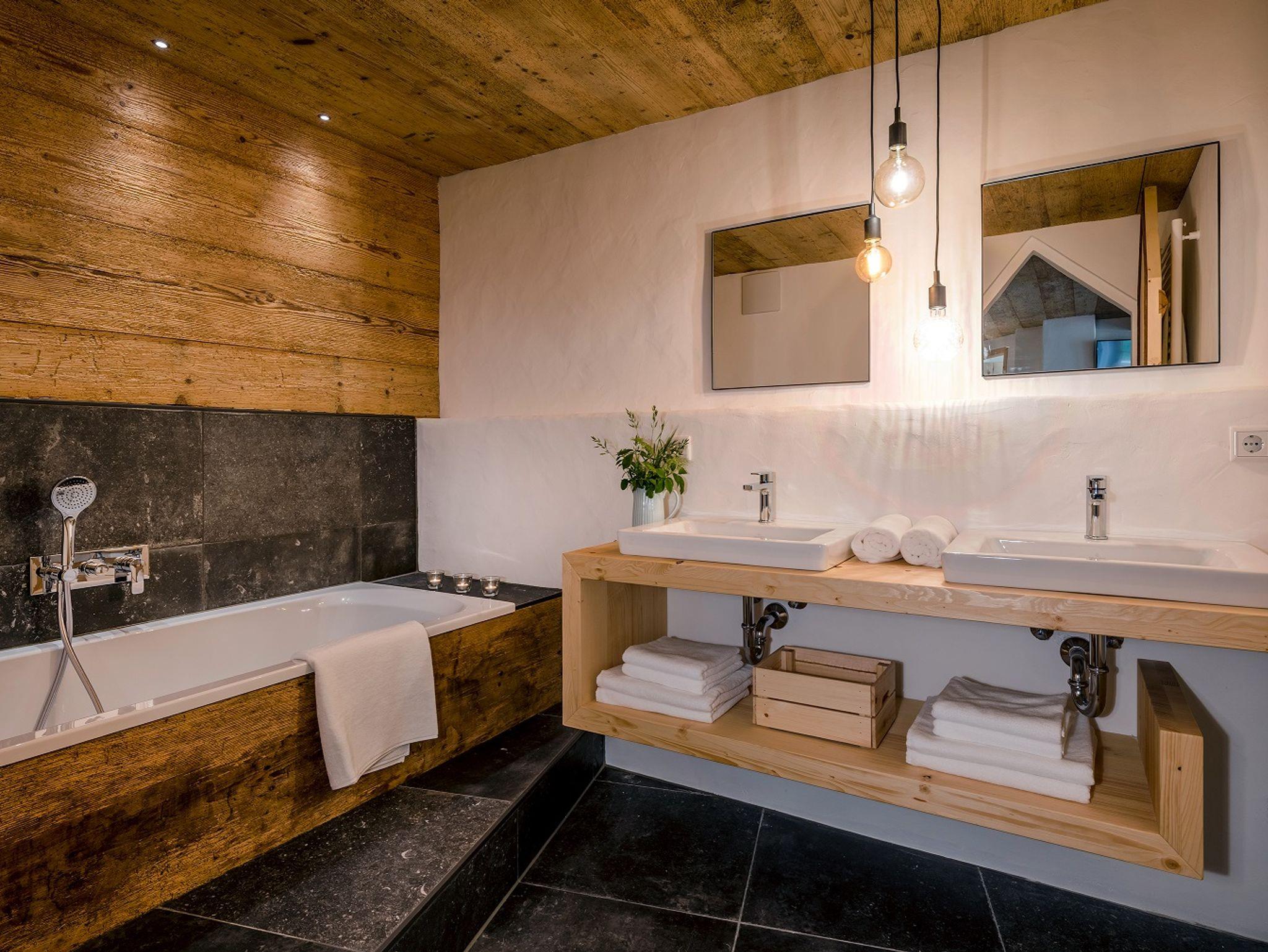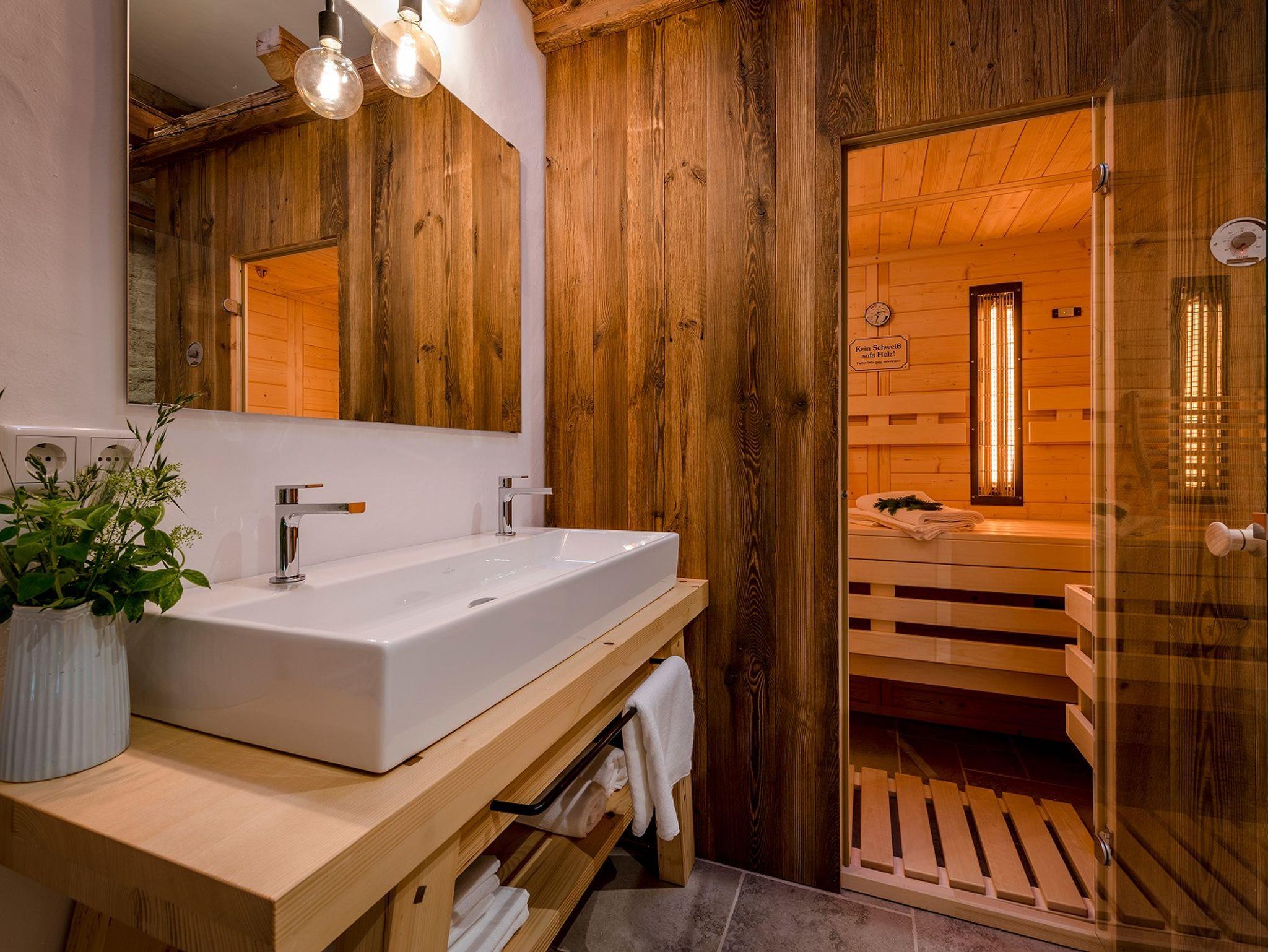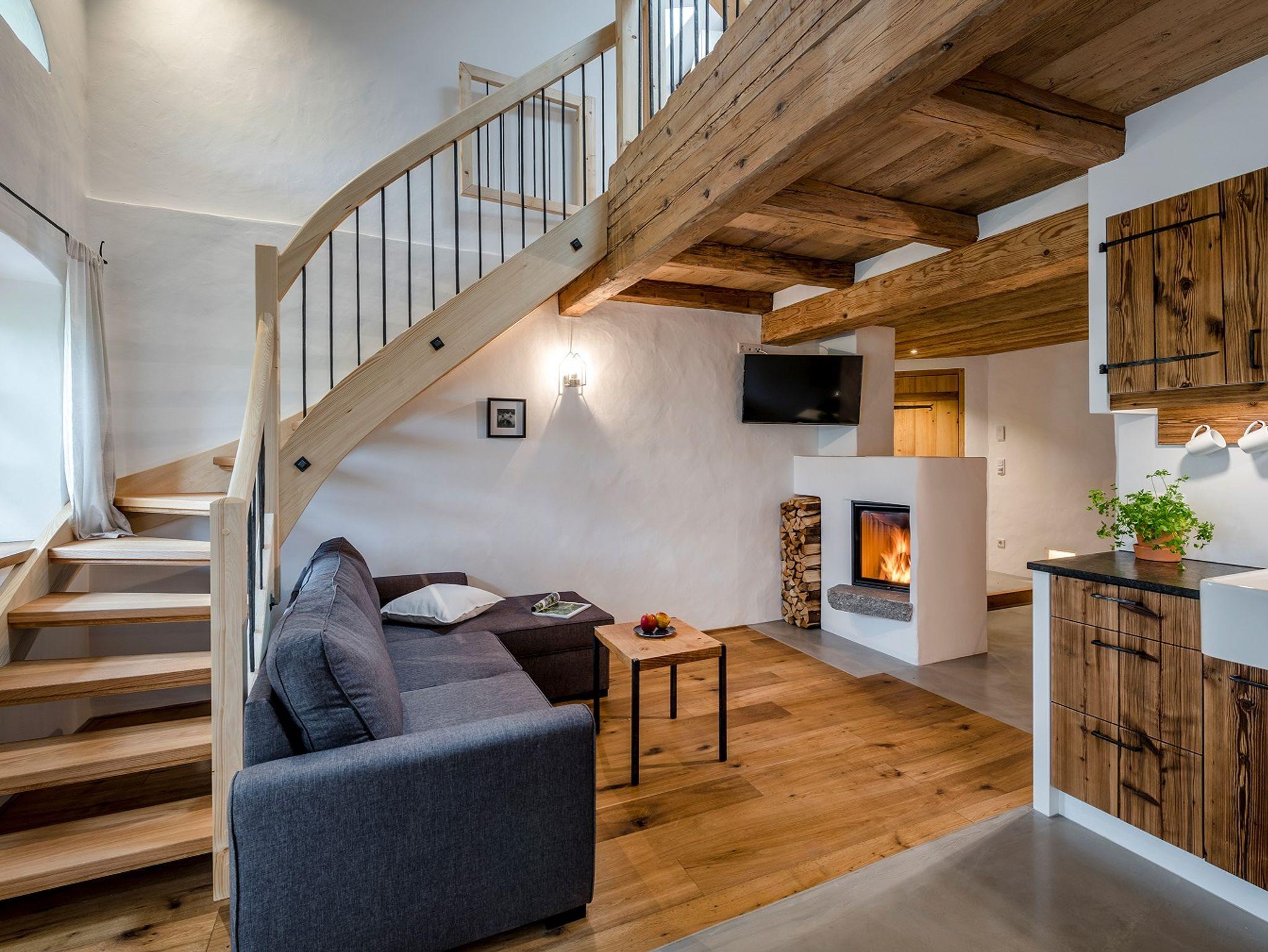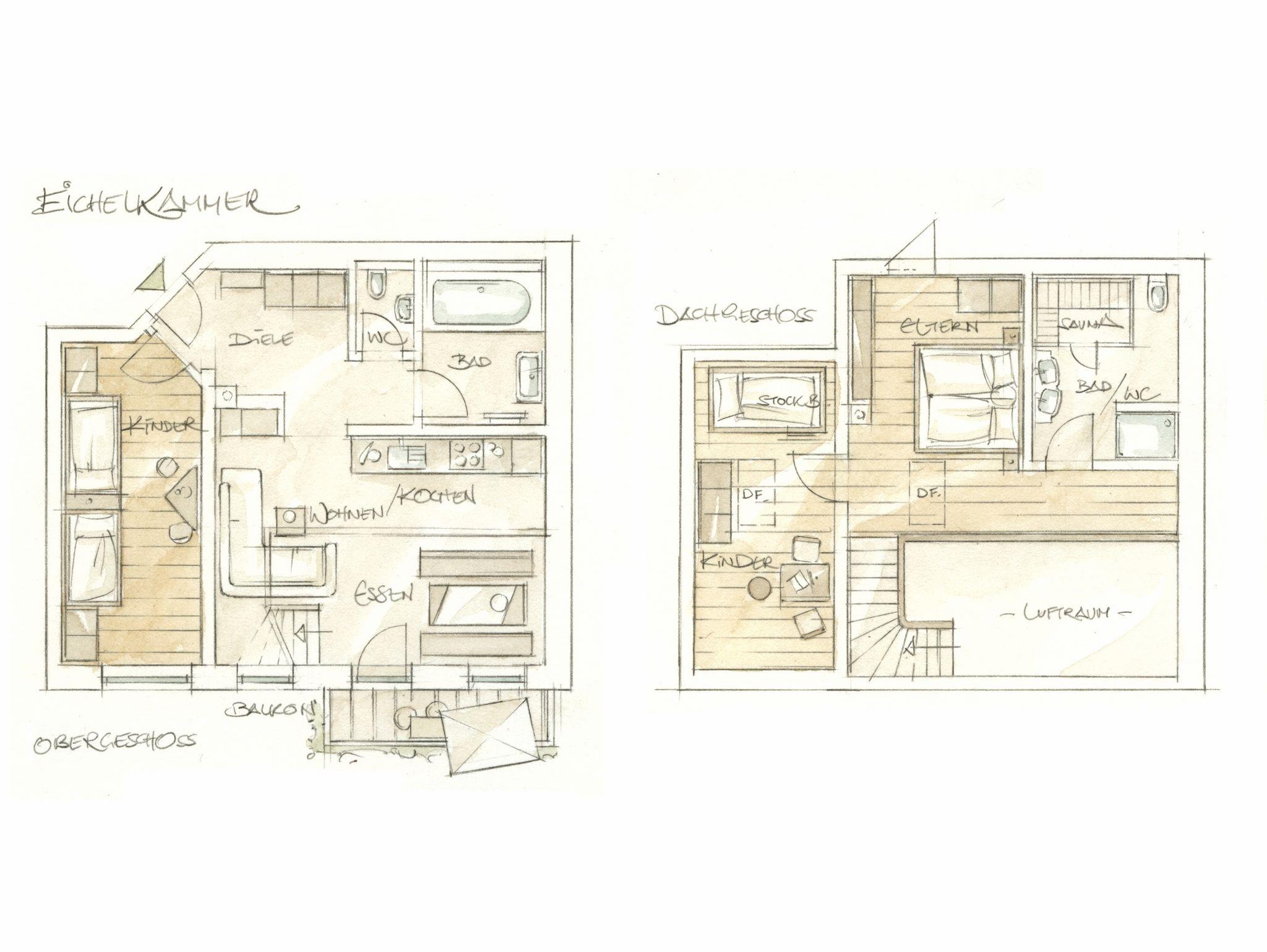 Die Kräuterkammer ist unsere wandelbare Wohnung. Bei drei Schlafzimmern ist eine Belegung bis zu 5 Erwachsene möglich. Und da sie ebenfalls über 2 Bäder verfügt, wird wohl kein Stau zu befürchten sein. Auch die Kräuterkammer ist eine sehr individuell geschnittene Wohnung mit einer offenen Galerie. Im unteren Bereich gibt es ein Schlafzimmer mit zwei Einzelbetten, ein separates WC, daneben ein großes Bad mit Wanne und Waschtisch. Auch hier verschmelzen Wohnen, Kochen und Essen in einem Raum, der auch über einen Kaminofen verfügt. Viel Licht und Wärme prägen diese Wohnung, über die Treppe der Galerie erreichen sie die anderen Räume. Ein weiteres (Kinder)schlafzimmer mit einem Einzelbett findet sich unter den luftigen Dachbalken sowie ein weiteres separates Schlafzimmer mit einem Doppelbett. Das anschließende Bad mit großer ebenerdiger Dusche und Doppelwaschtisch und einem weiteren WC bietet Badespaß pur, denn es hat als weiteres Extra, eine Sauna. Somit ist die Kräuterkammer ein wirkliches Platzwunder für eine große Familie.