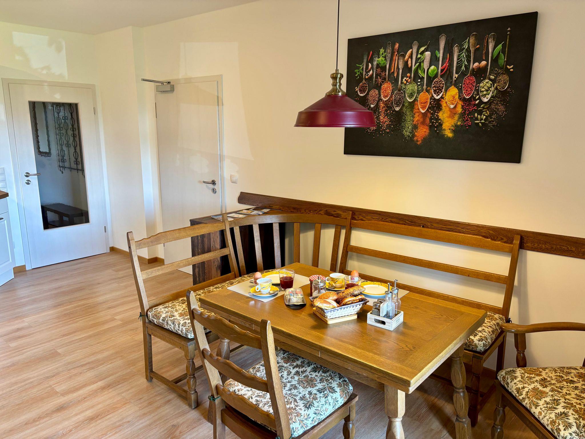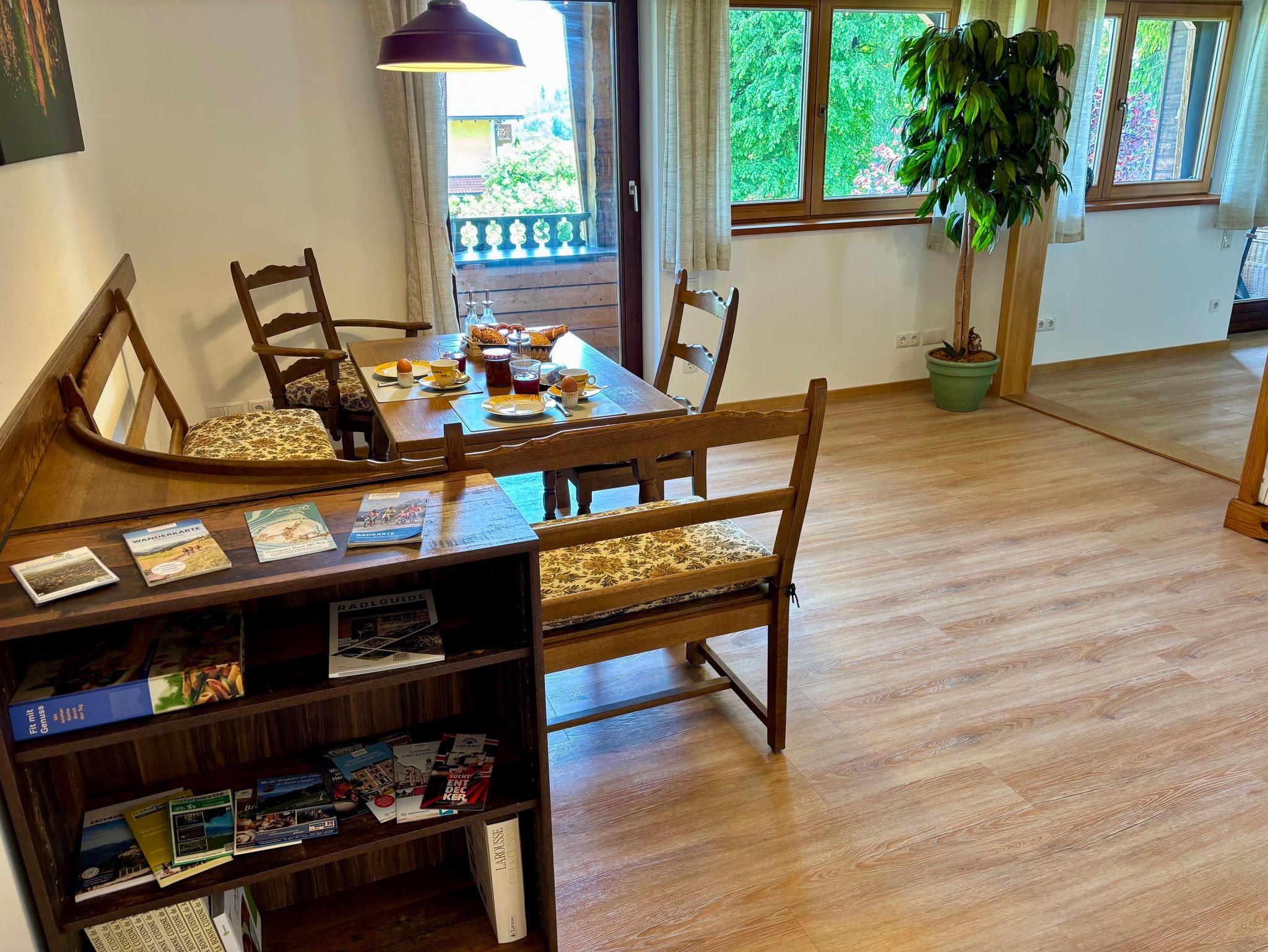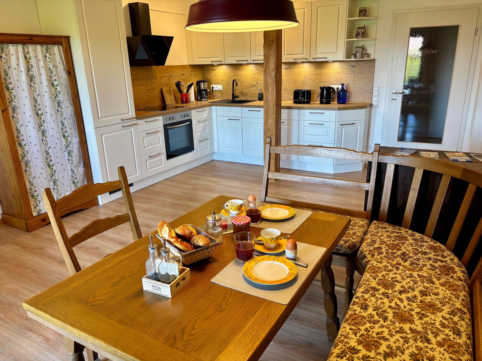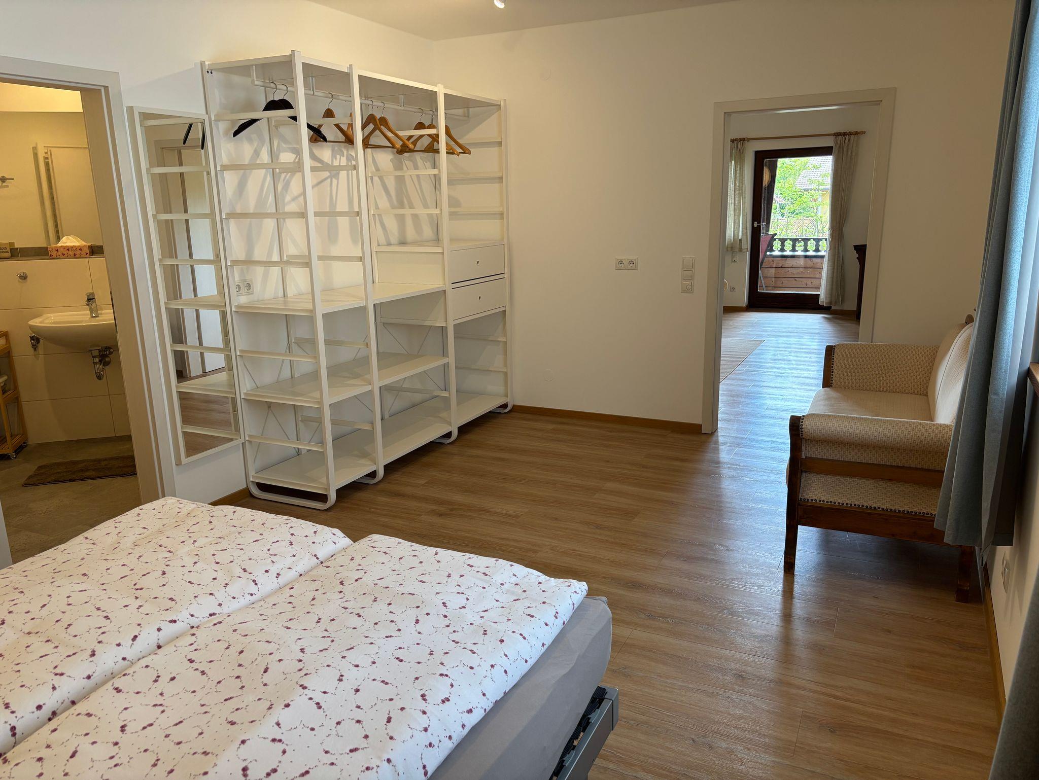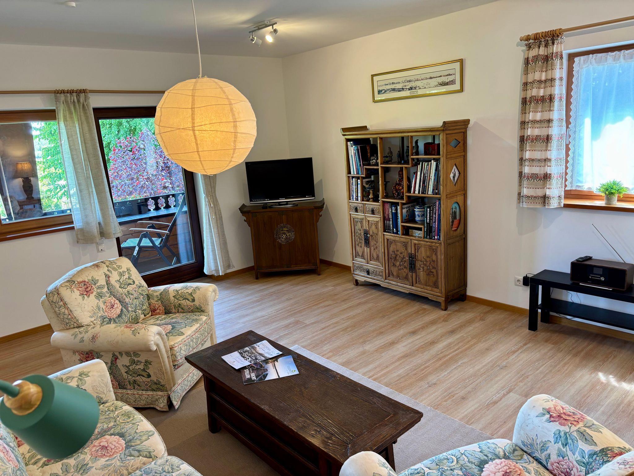 Die Ferienwohnung liegt im ersten Stock eines traditionellen Chiemgauer Bauernhauses und ist über einen separaten Eingang erreichbar. Auf 75 Quadratmetern befindet sich eine voll ausgestattete Küche, ein gemütliches Wohnzimmer, ein Schlafzimmer und ein Badezimmer. Ein überdachter Südbalkon von 15 Quadratmetern lädt zum Entspannen ein. Die Einrichtung ist hell und freundlich. Das Schlafzimmer verfügt über ein Doppelbett (160 x 200), einen offenen Schrank und ein Biedermeier-Sofa. Verdunklungsvorhänge sorgen für eine gute Nachtruhe. Das kleine Bad hat eine Dusche, ein WC und einen Waschtisch. Die gut ausgestattete Küche mit Kühlschrank, Geschirrspüler, Herd, Backofen, Spüle und Zubehör ist mit dem Wohnzimmer verbunden. Ein kleiner Vorrat an gängigen Gewürzen wie Salz, Pfeffer, Essig und Öl ist vorhanden. Eine Eckbank mit Tisch und zwei Stühlen lädt zum gemütlichen Essen ein. Im Wohnzimmer befindet sich ein Sofa mit zwei Sesseln und drei chinesische Möbelstücke aus unserer Zeit in China. Es gibt einen Fernseher und ein Digitalradio. Handtücher und Bettwäsche werden gestellt. Haustiere sind leider nicht gestattet, und in der Wohnung ist das Rauchen nicht erlaubt.