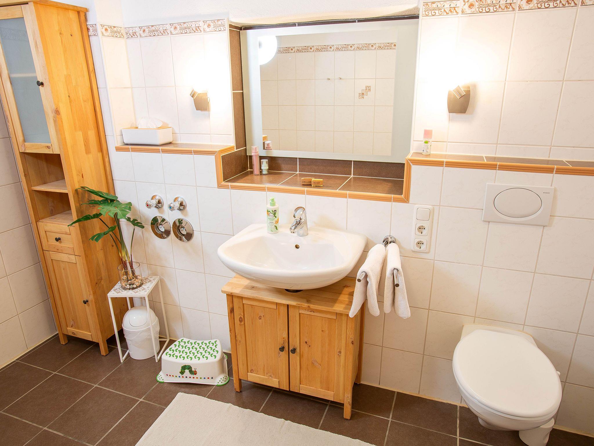 Die großzügige 100m²-Wohnung ist hell und freundlich und gemütlich eingerichtet. Wohn- und Essbereich sind getrennt voneinander. Vom Elternschlafzimmer aus begehbar gibt es noch ein extra WC, zusätzlich zum großen Badezimmer mit Dusche/WC. Vom südseitigen Balkon hat man einen schönen Überblick so gut wie auf den gesamten Garten.