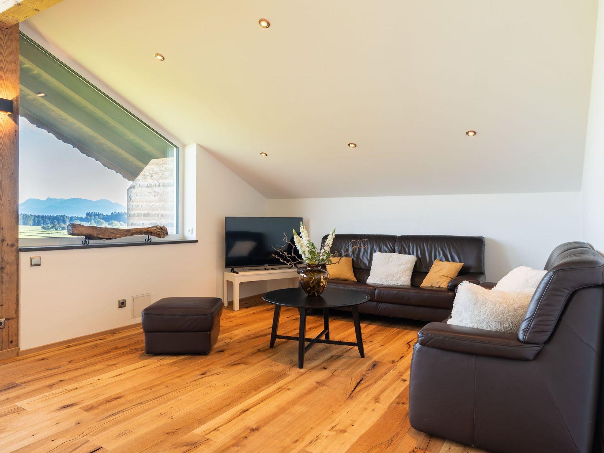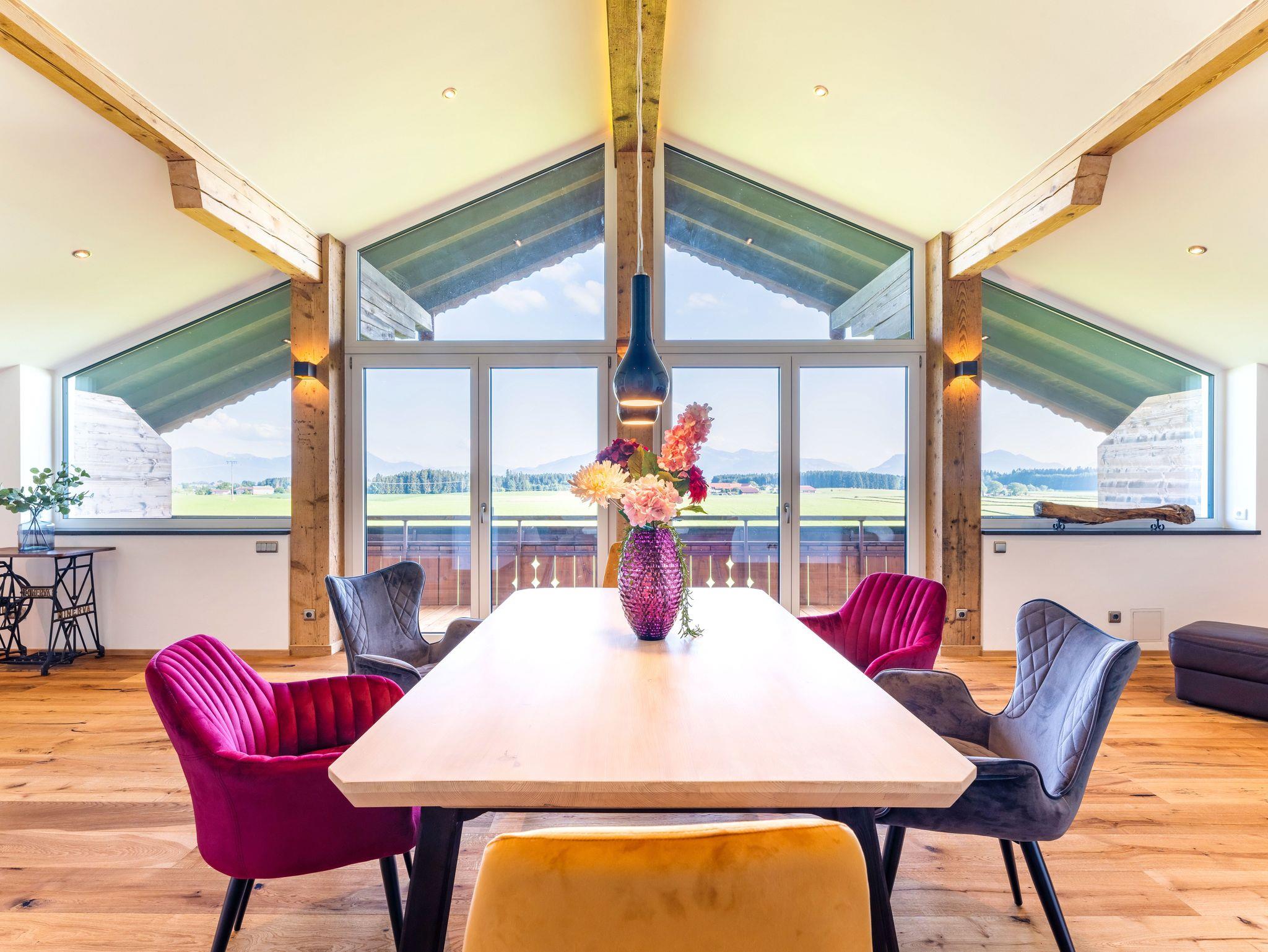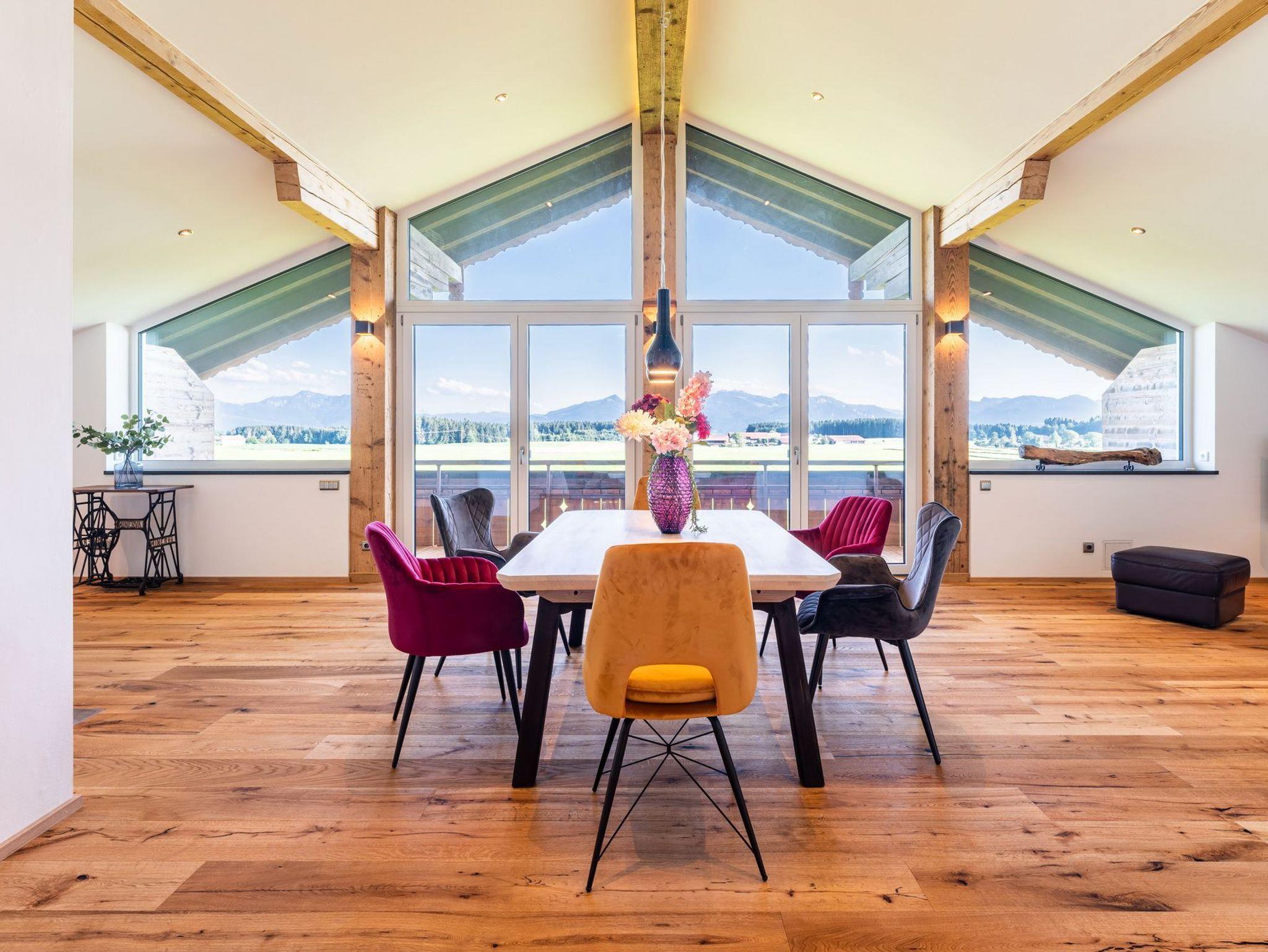 Genießen Sie Ihren Urlaub in unserem modernen, offenen Loft im Dachgeschoss eines ehemaligen Bauernhofs bei Eggstätt. Mit großer Glasfront, überdachtem Südbalkon und traumhaftem Bergpanorama bietet die Ferienwohnung Platz für bis zu 5 Personen. Hochwertige Ausstattung, zwei Schlafzimmer, modernes Bad mit Wanne und Dusche sowie kostenloses WLAN, Stellplatz und Fahrradunterstellung runden das Angebot ab. Perfekt für Natur- und Erholungssuchende nahe Langbürgner See, Eggstätter Seenplatte und Chiemsee.