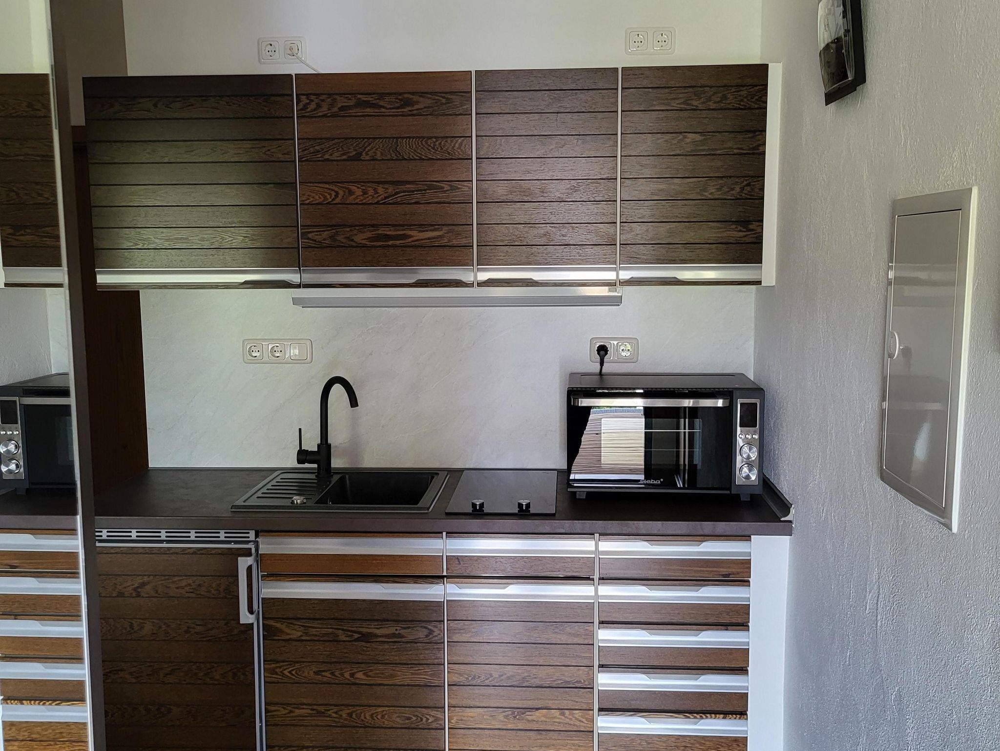 In der kleinen, aber voll ausgestatteten Küche, stehen Ihnen ein Kühlschrank mit Gefrierfach, ein Backofen,