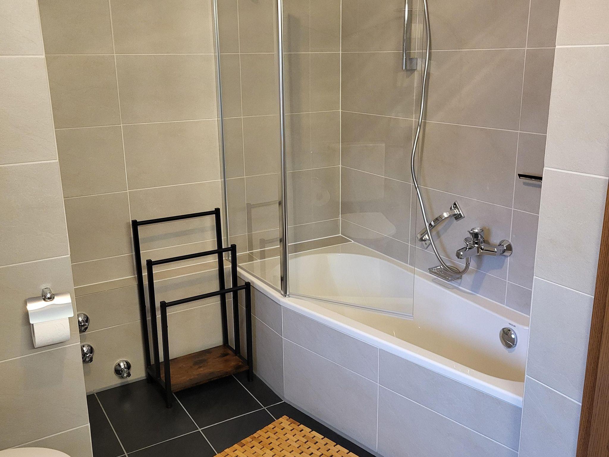 Das Badezimmer ist mit WC und einer Duschbadewanne ausgestattet, ebenso steht Ihnen ein Fön und eine Waschmaschine zur Verfügung.