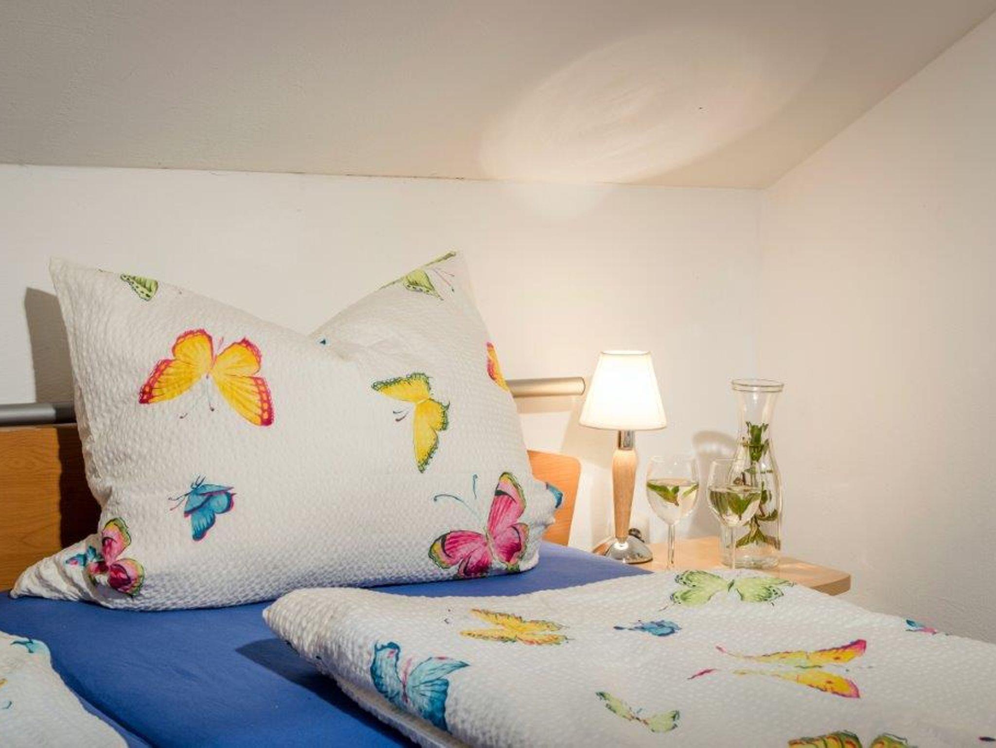 Ein helles Schlafzimmer mit einem modernen Doppelbett und zwei Nachtkasteln, sowie einem großen Schrank bietet ausreichen Platz. Ein Dachfenster direkt über dem Bett (Verdunkelungsrollo) eröffnet ihnen einen Blick in die Sterne.
