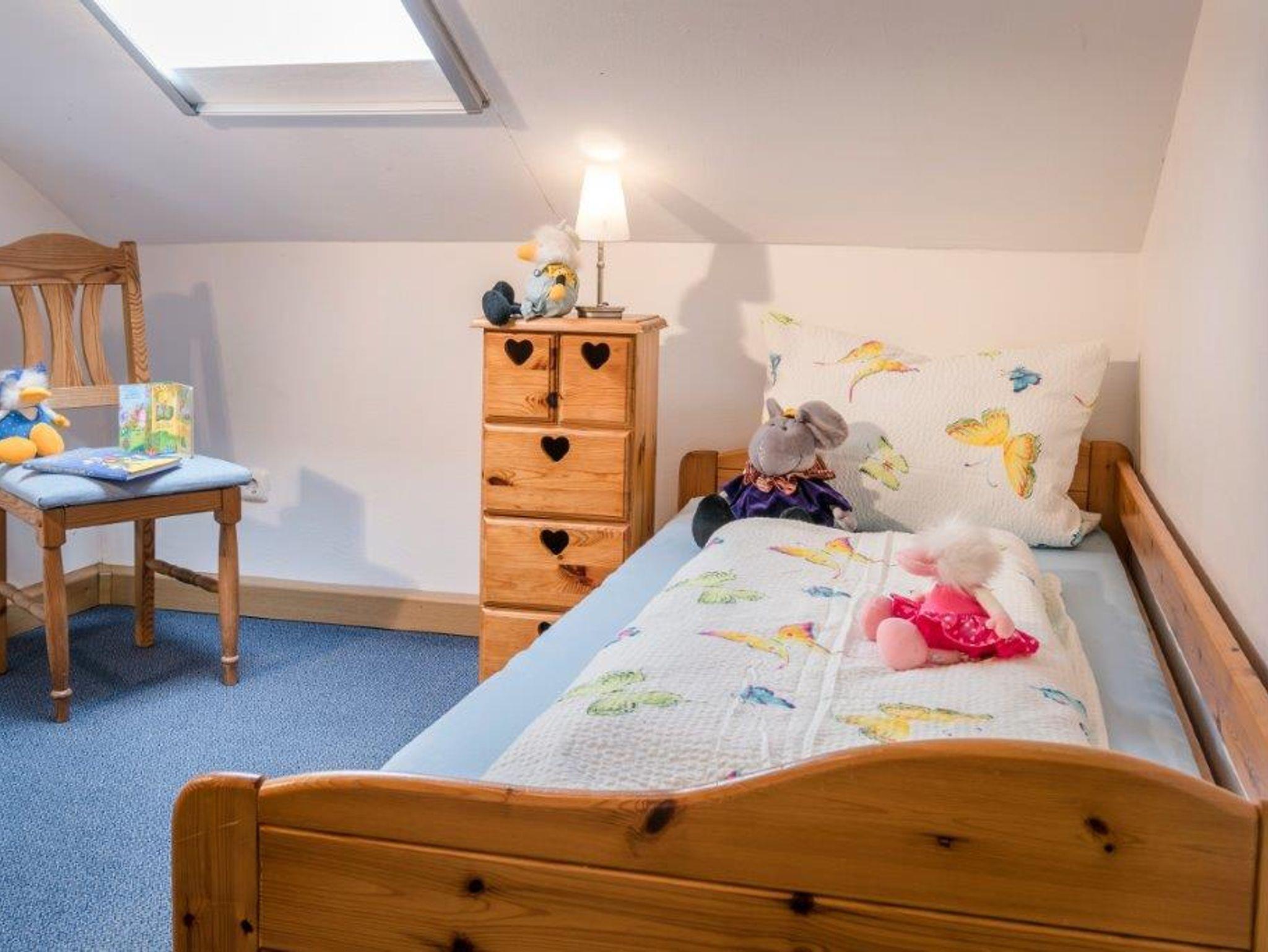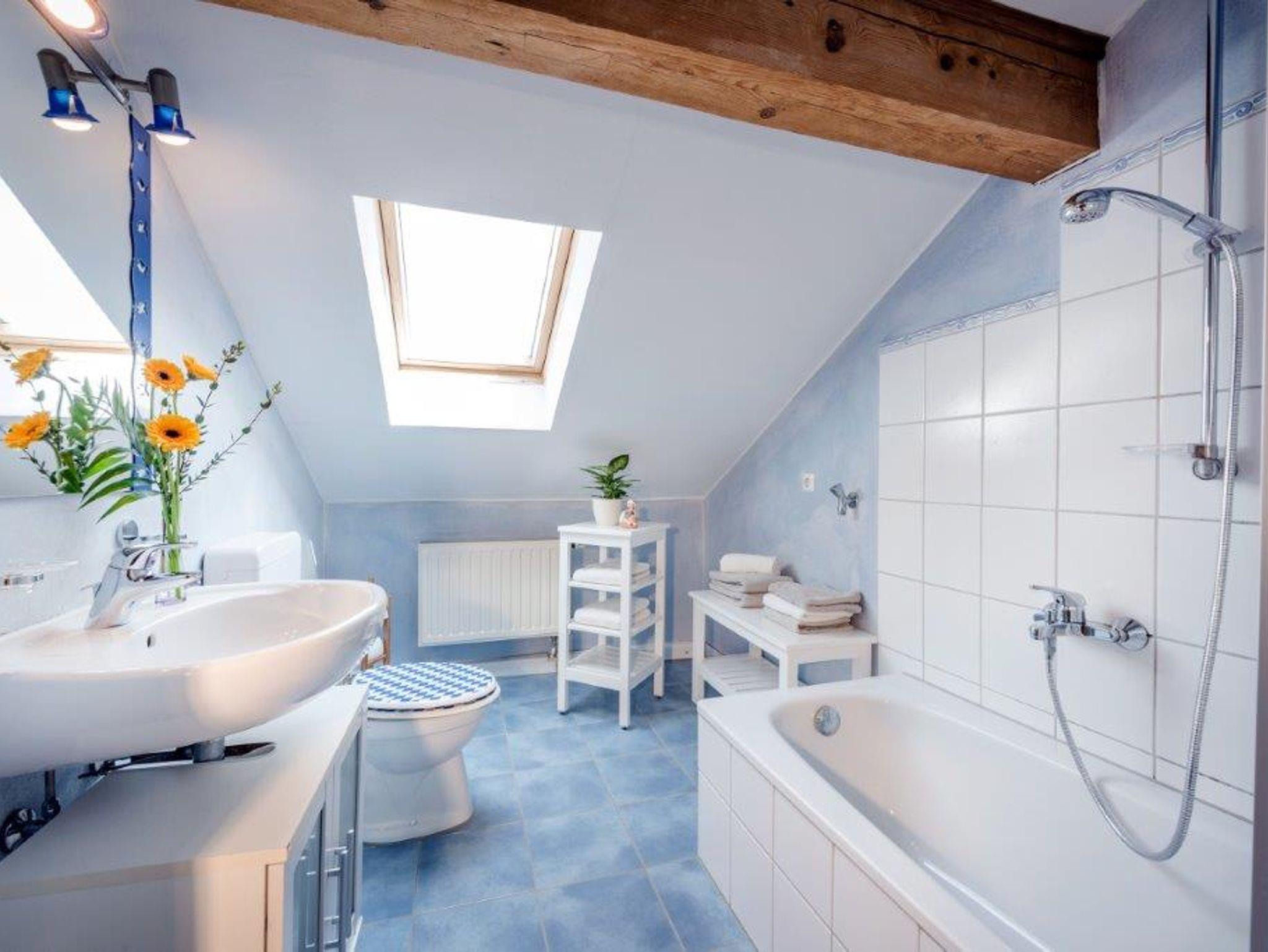Das kleine Bad, ebenfalls mit einem Dachfenster, geht auch vom Wohnraum aus ab und hat neben einer Wanne, die auch eine Duschabtrennung hat, noch Waschbecken und WC. Das zweite Schlafzimmer hat ebenfalls einen eigenen Schrank und ein Dachfenster, das man abdunkeln kann. Das Einzelbett kann man ausziehen und man kann so dort eine weitere Schlafmöglichkeit schaffen.