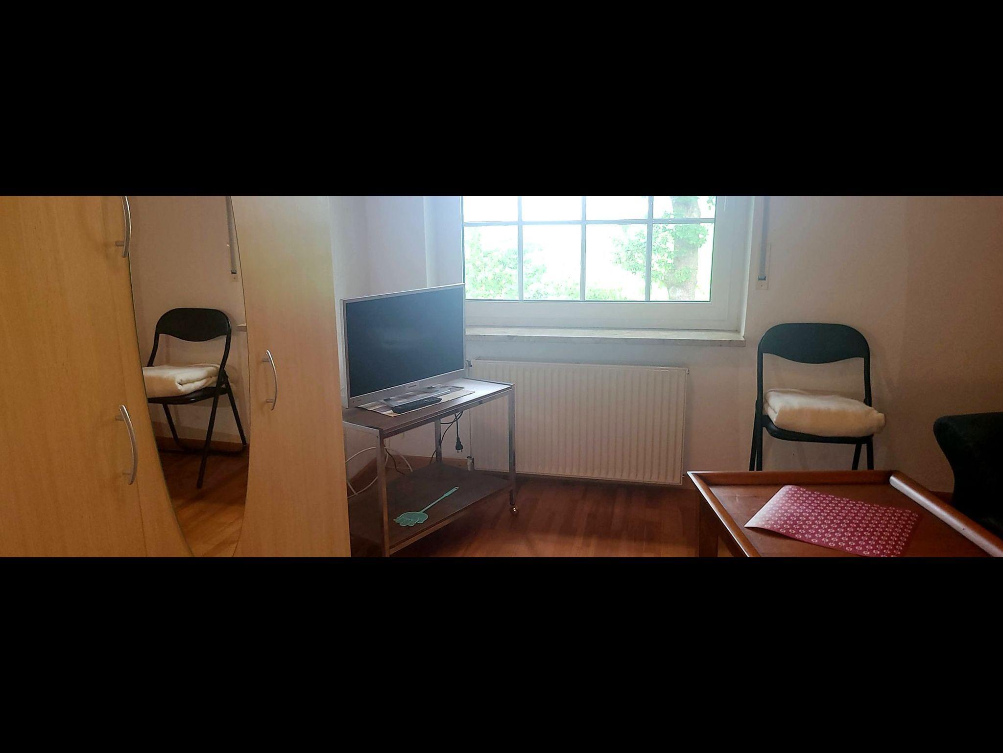 Monteurzimmer für Nichtraucher mit Einzelbett für 1 Person. Sessel, Tisch und Flachbild-TV.