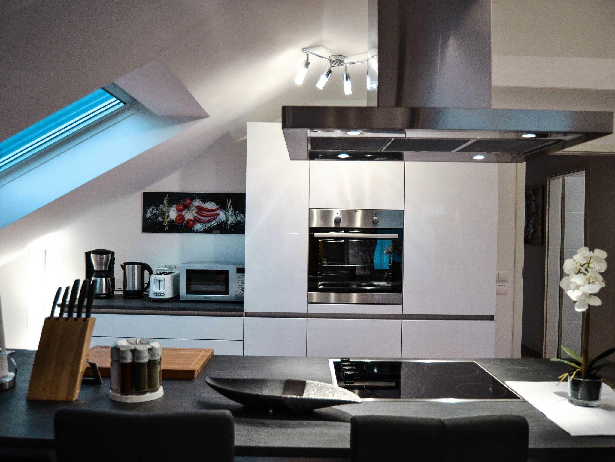 Der großzügige Wohn-/Essbereich verfügt über einen weiteren Flachbild-Sat-TV, eine große bequeme Couch sowie einen Esstisch für 8 Personen. Weitere 4 Sitzgelegenheiten bietet die offene Kochinsel. Die Küche ist voll ausgestattet mit Herd, Backofen, Mikrowelle, Toaster, Kaffeemaschine und Wasserkocher und Spülmaschine. Ebenfalls ist eine Erstausstattung an Gewürzen vorhanden.