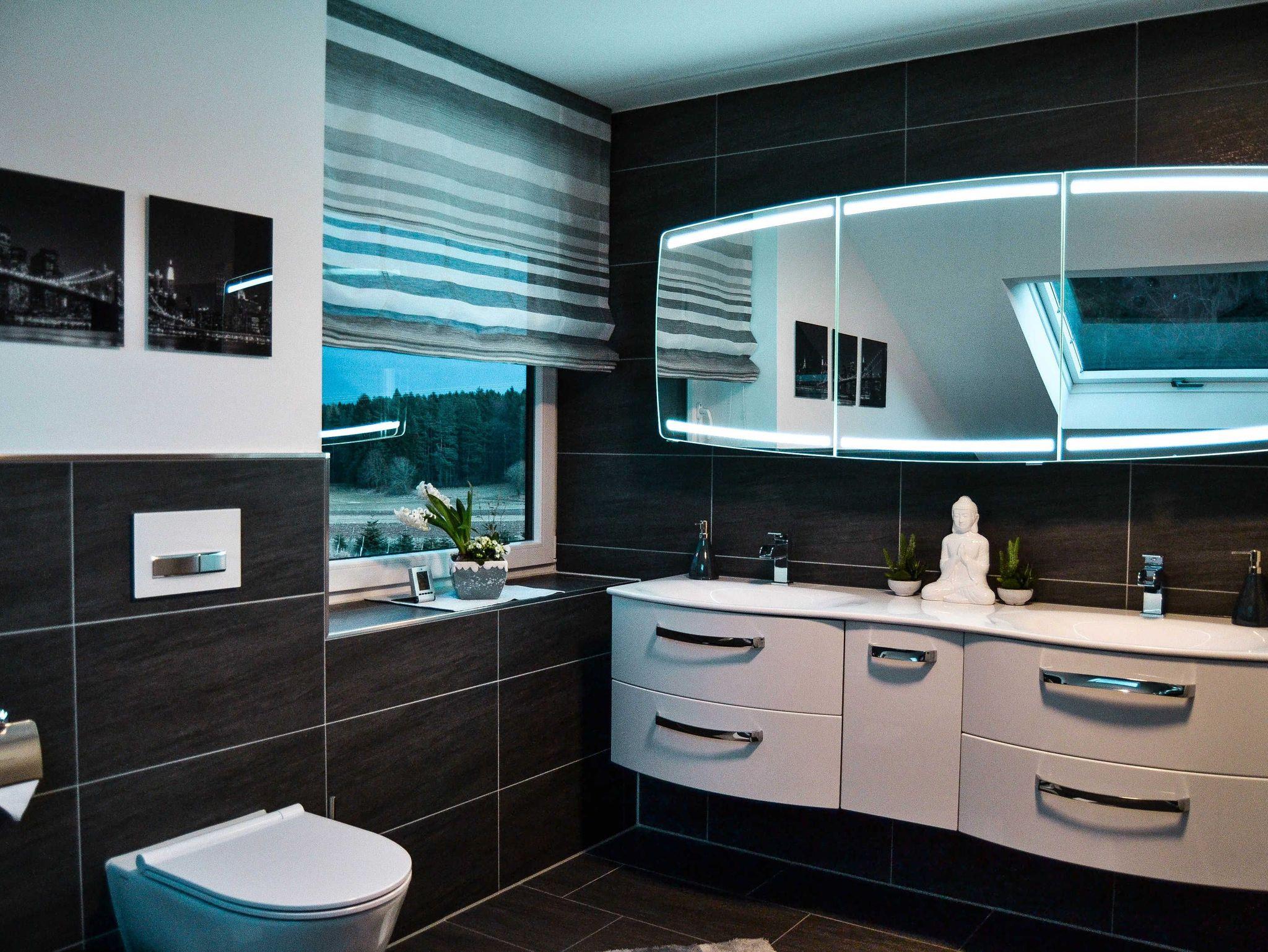 Das Badezimmer ist ausgestattet mit WC, Dusche, Eckbbadewanne, ein Doppelwaschbecken mit großem Spiegel, Waschmaschine und Trockner.