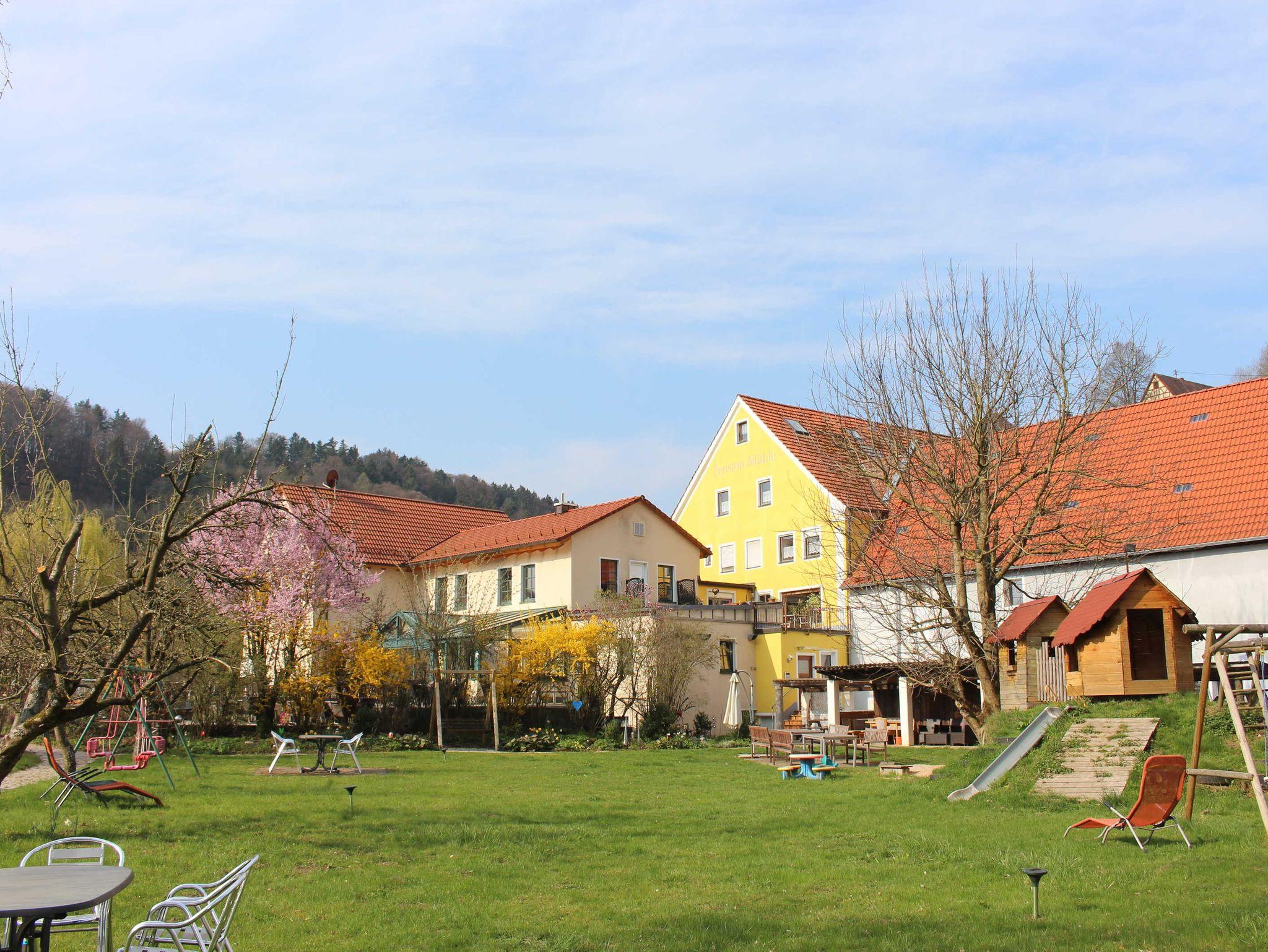 Ferien in der Fränkischen Schweiz im Land der Burgen, Höhlen und Mühlen! Unser Haus war eine dieser ehemalige Mühle im romantischen Tal der forellenreichen Trubach. Wo sich früher das rege Leben der Müller abspielte, finden Sie heute behaglich eingerichtete Gästezimmer mit Du/WC und Kabel-TV, sowie 10 gemütliche Ferienwohnungen in der Pension Mühle und in unserem 50 m entfernten Neumeyerhaus.