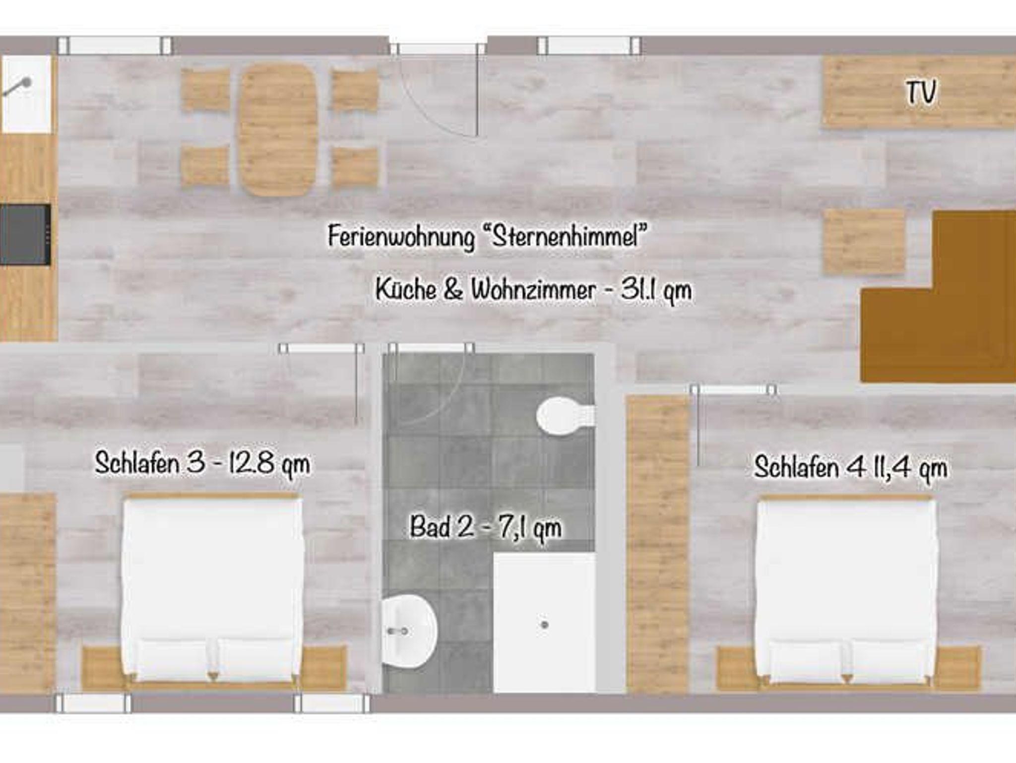 Unsere neue, lichtdurchflutete Ferienwohnung Sternenhimmel verfügt auf 53 qm über 2 Schlafzimmer, eine vollausgestattete Küche mit Esstisch, ein offenes Wohnzimmer, ein Badezimmer mit Dusche/WC, sowie eine Terrasse mit Sitzgelegenheit.