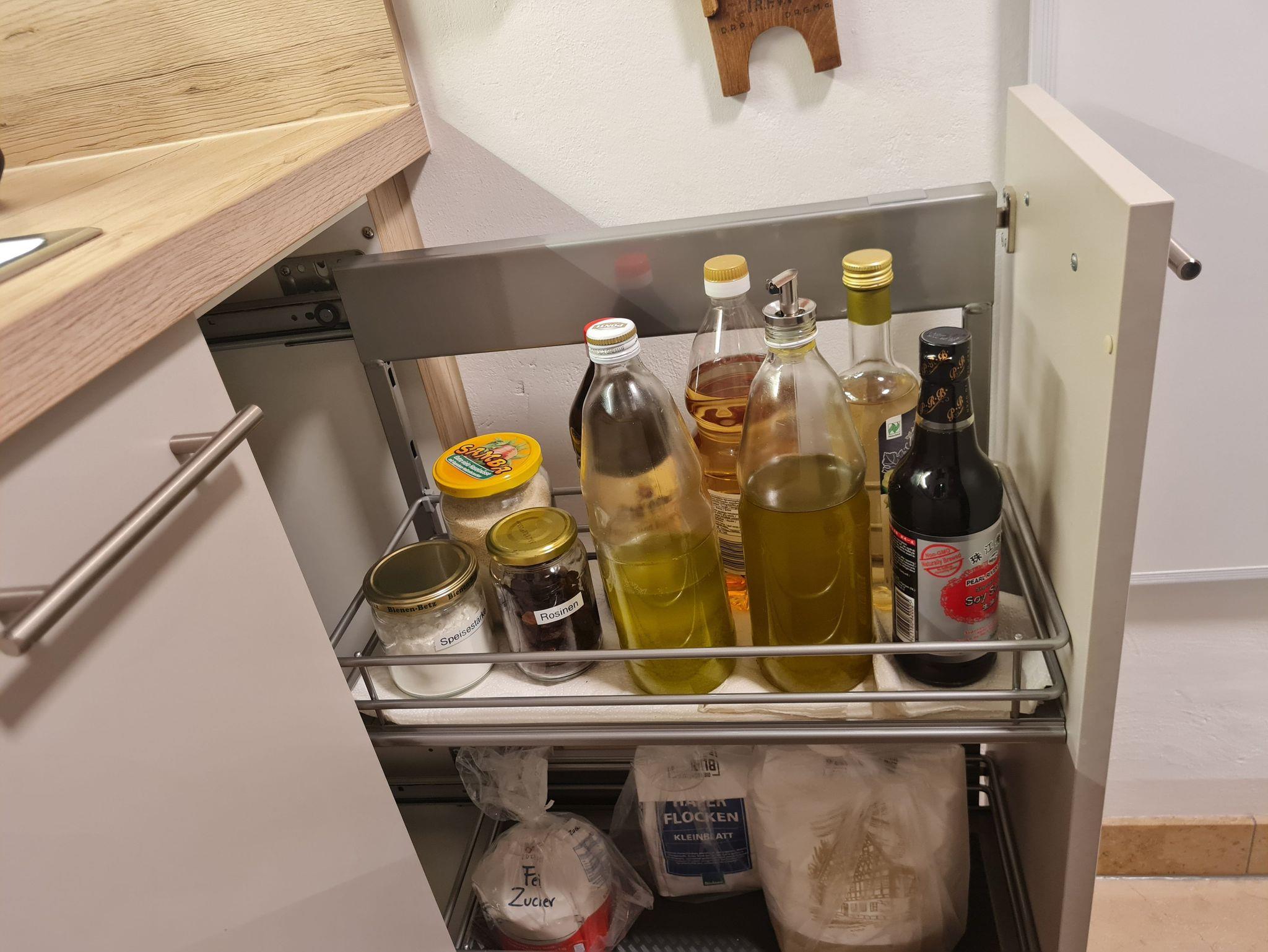 Die separate Küche ist u.a. mit einem Kühlschrank mit großem Gefrierfach, einem Herd mit Backofen sowie einer Spülmaschine komplett ausgestattet. Sie finden hier neben Kaffeemaschine, Nespresso-Maschine, Milchaufschäumer, Toaster, Wasserkocher und Küchenmaschine, auch Zucker, Salz, Mehl, diverse Gewürze, Essig/Öl, Kaffeefilter, diverse Tees, Küchenrolle, Spülmittel, Spülmaschinentabs.