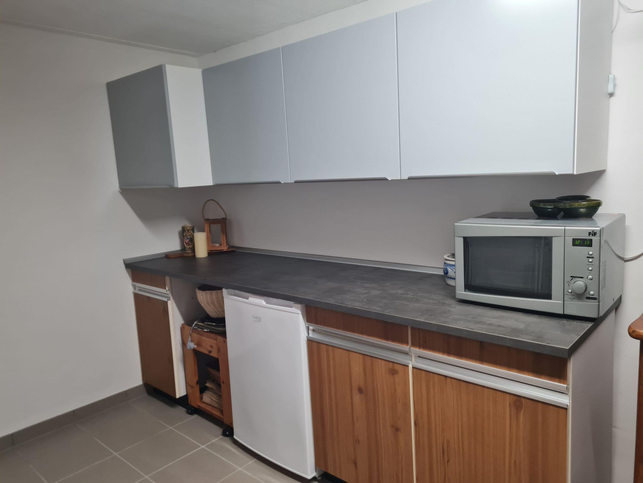 Weitere Küchenzeile mit Kühlschrank und Mikrowelle im Untergeschoss;