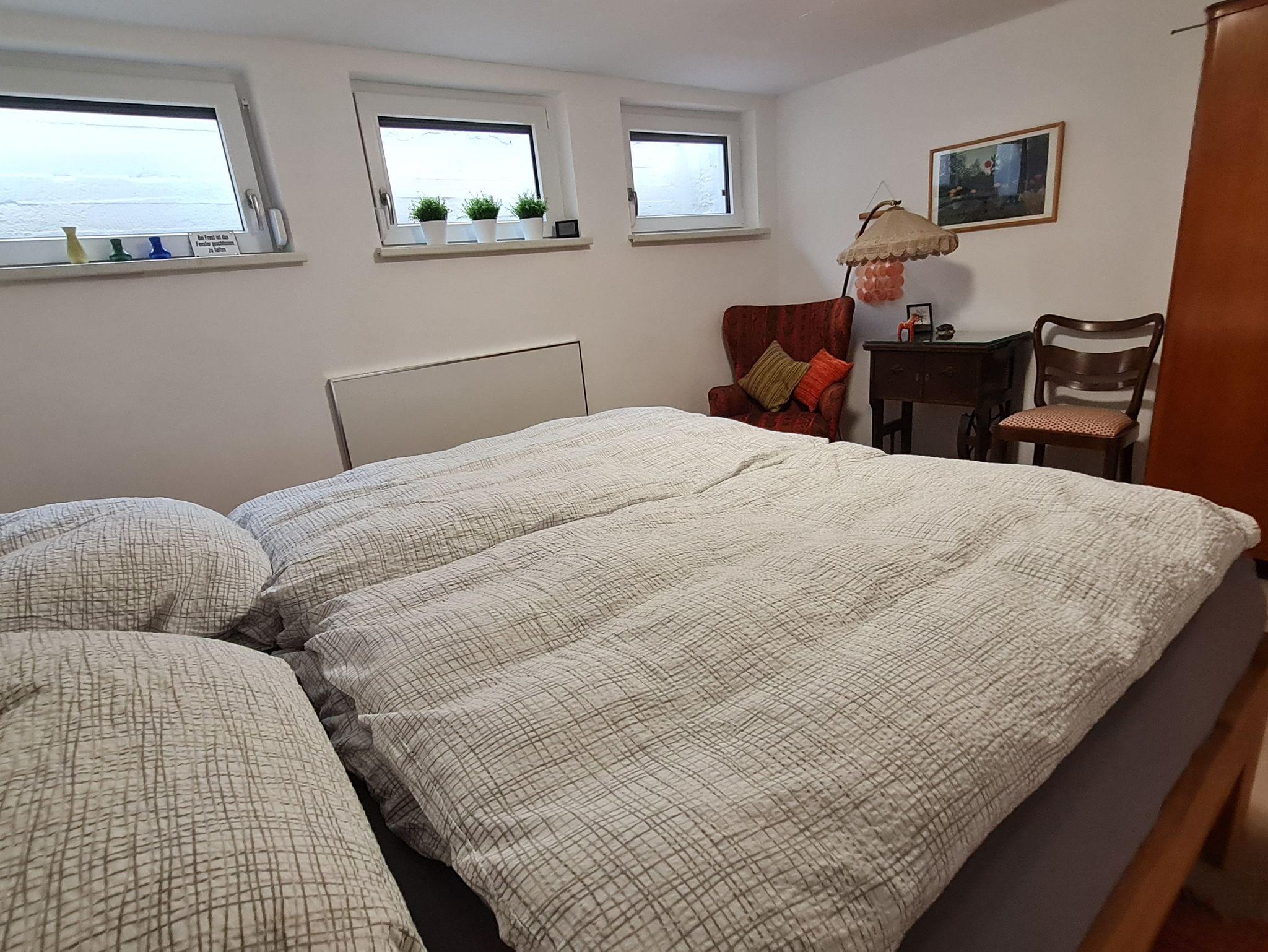 1 Schlafzimmer im Untergeschoss mit Doppelbett (2m x 2m) sowie einem Einzelbett (1m x 2m); in der Übergangszeit sorgt der gemütliche Kaminofen für kuschelige Wärme;