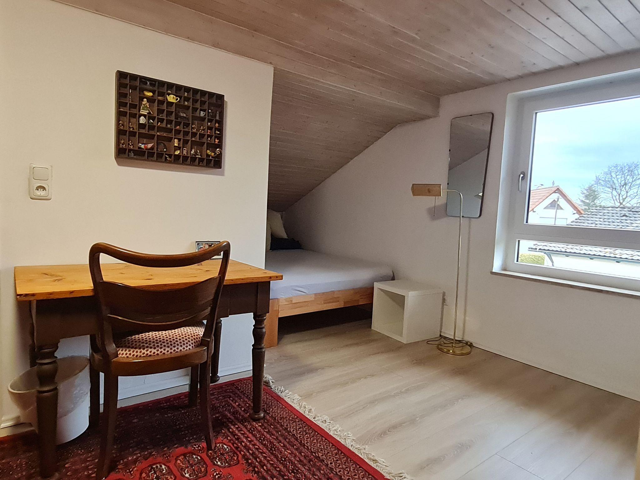 1 Schlafzimmer im Dachgeschoss mit drei französischen Betten (jeweils 1,40m x 2m), einem kleinen Schreibtisch und Platz zum Spielen / Lesen;