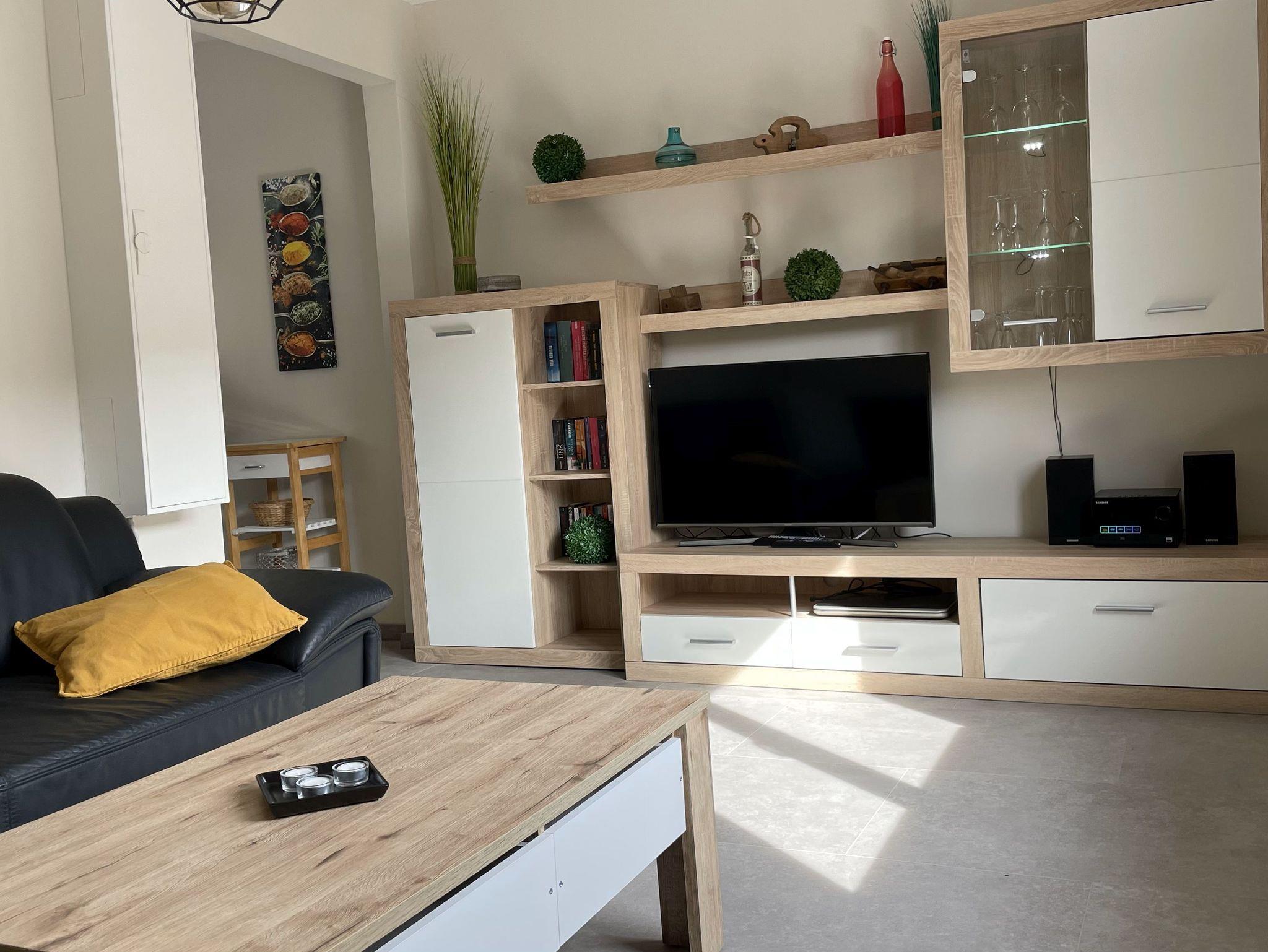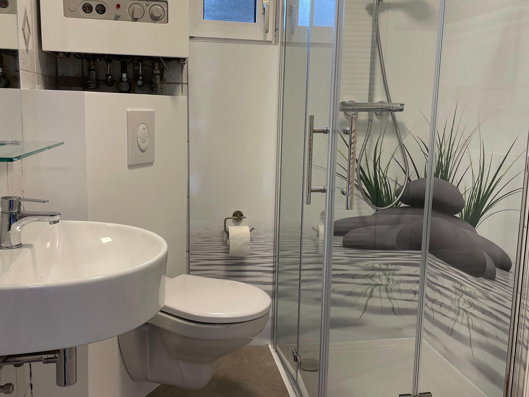 Im Erdgeschoss befinden sich Wohnzimmer mit Eckcouch, Tisch, Schrank, 43 Zoll Full HD Flachbildschirm mit SAT-Empfang und eine Stereoanlage, Küche - ausgestattet mit Spülmaschine, Mikrowelle, Herd und Backofen, Kühl-/ Gefrierkombination, Wasserkocher, Kaffeemaschine, Brotschneidemaschine, Toaster, Eierkocher, Waschmaschine. Ein Esstisch und 4 Stühle befinden sich ebenfalls in der Küche. Bad mit Dusche/WC, Waschbecken, Spiegel, Fön, Ablagefläche, Handtuchhalter für 4 Personen.