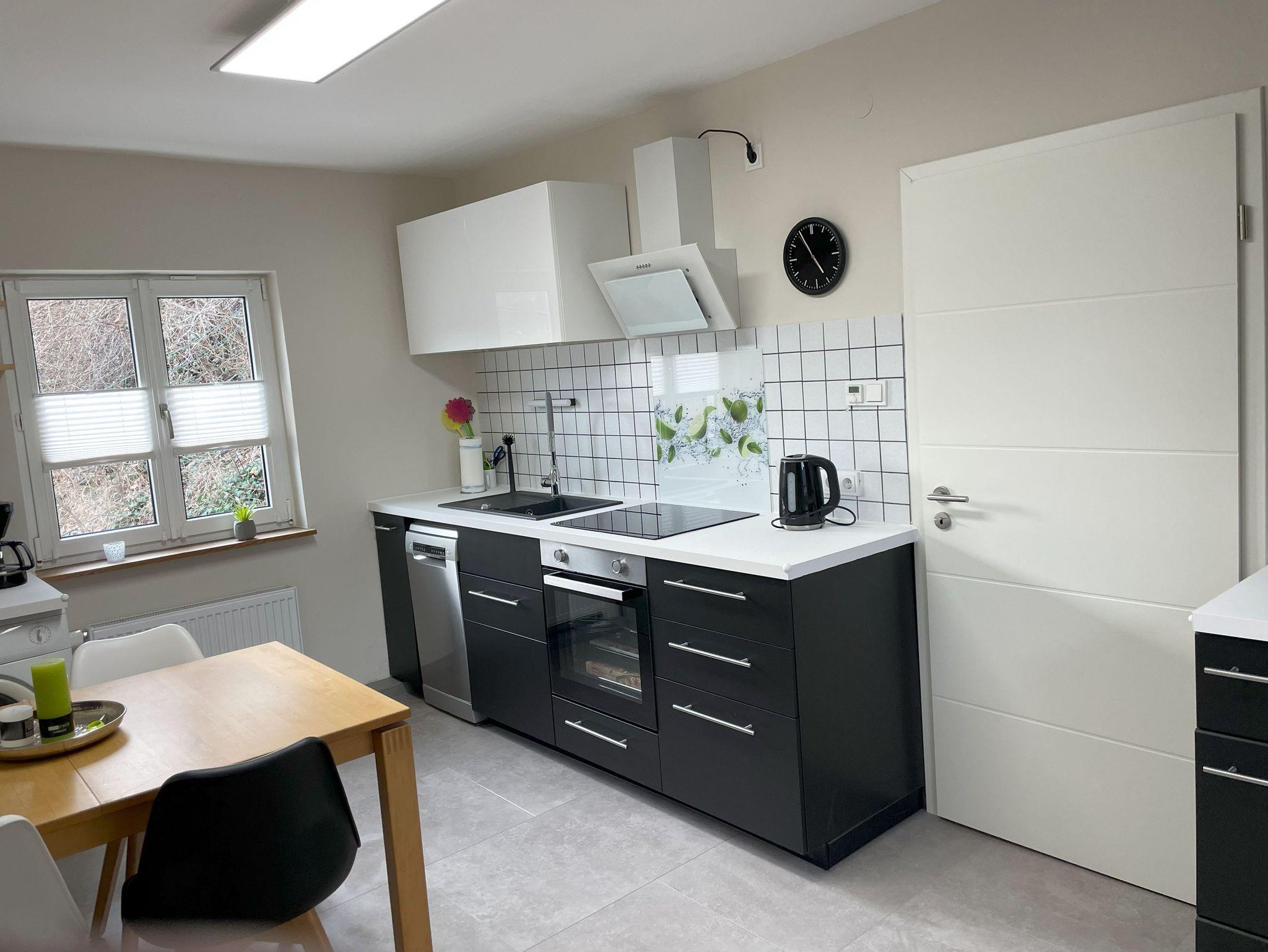 Ihr findet ein komplett eingerichtetes Haus mit 4 Zimmern vor: Wohnzimmer, Wohnküche, Bad und zwei Schlafzimmer im 1. OG Schlafzimmer II ist ein Durchgangszimmer zum Schlafzimmer I. Das Haus ist mit zentraler Warmwasserversorgung und Zentralheizung ausgestattet und liegt in einer sehr ruhigen Seitenstraße.