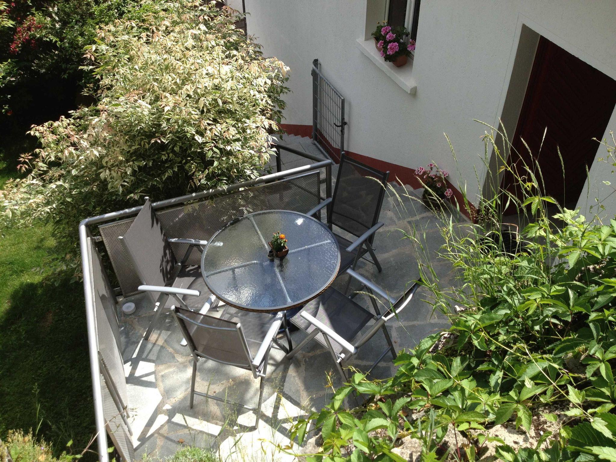 Terrasse Südhang, Gartentisch mit Gartenstühlen und Sonnenschirm, Liegewiese mit Relaxliege und Gartenliege.