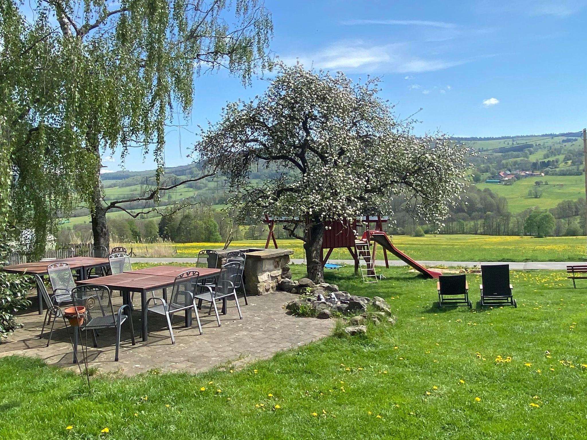 Die gemütliche Ferienwohnung im ersten Stock bietet dir eine atemberaubende Aussicht auf die wunderschöne Landschaft der Rhön, die du schon beim Frühstücken genießen kannst. In der einladenden Wohnküche findest du ein bequemes Sofa, das auch als Schlafsofa genutzt werden kann, sowie eine Sitzgruppe. Die Küche ist vollständig ausgestattet mit Backofen, Spülmaschine,Wasserkocher, Kaffeemaschine, Toaster, Eisfach und vielem mehr. Das Schlafzimmer verfügt über ein komfortables Doppelbett. Für den kleinen Nachwuchs steht ein Babybett zur Verfügung.