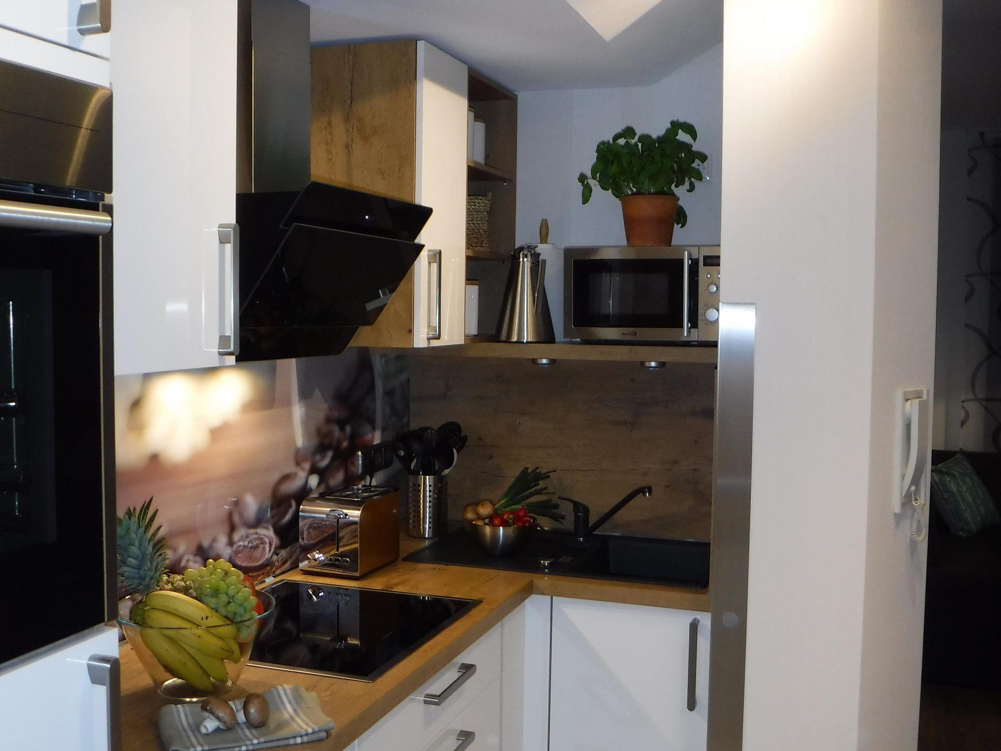 Die Wohnung, die seit Juni 2017 vermietet wird, bietet Platz für bis zu 4 Personen und verfügt über eine elegante, voll ausgestattete Küchenzeile mit Ceran-Kochfeld und Mikrowelle, Bad mit Badewanne und Dusch-Paneel. Wohn/Essbereich mit einer gemütlichen Eckbank-Gruppe und mit geräumigem Schlafsofa, einem bequemen Designer Sessel sowie Couchtisch, Panasonic 40 LED Fernseher und erstklassiger Sonoro Musikanlage. Eine interessante Auswahl an DVDs, CDs, Büchern und Spielen ist ebenfalls vorhanden. Das Schlafzimmer ist mit einem elektrisch verstellbarem Belcanto Boxspringbett (extra große Bettauflagen 155x220 m) ausgestattet. Ein Fliegengitter sorgt für ungestörten Schlaf. Das Schlafsofa bietet Platz für die zwei weiteren Schlafplätze. Waschmaschine, Trockner, Gefrierschrank, Gartenmöbel und Sonnenschirm sowie ein Holzkohlegrill stehen Ihnen ebenfalls zur Verfügung. Der in die Wohnung integrierte Mehrzweckraum ist u. a. ideal zur Aufbewahrung Ihrer Wander-, Ski- und Sportausrüstung geeignet. Auf der großen Sonnenterrasse lässt es sich herrlich entspannen.